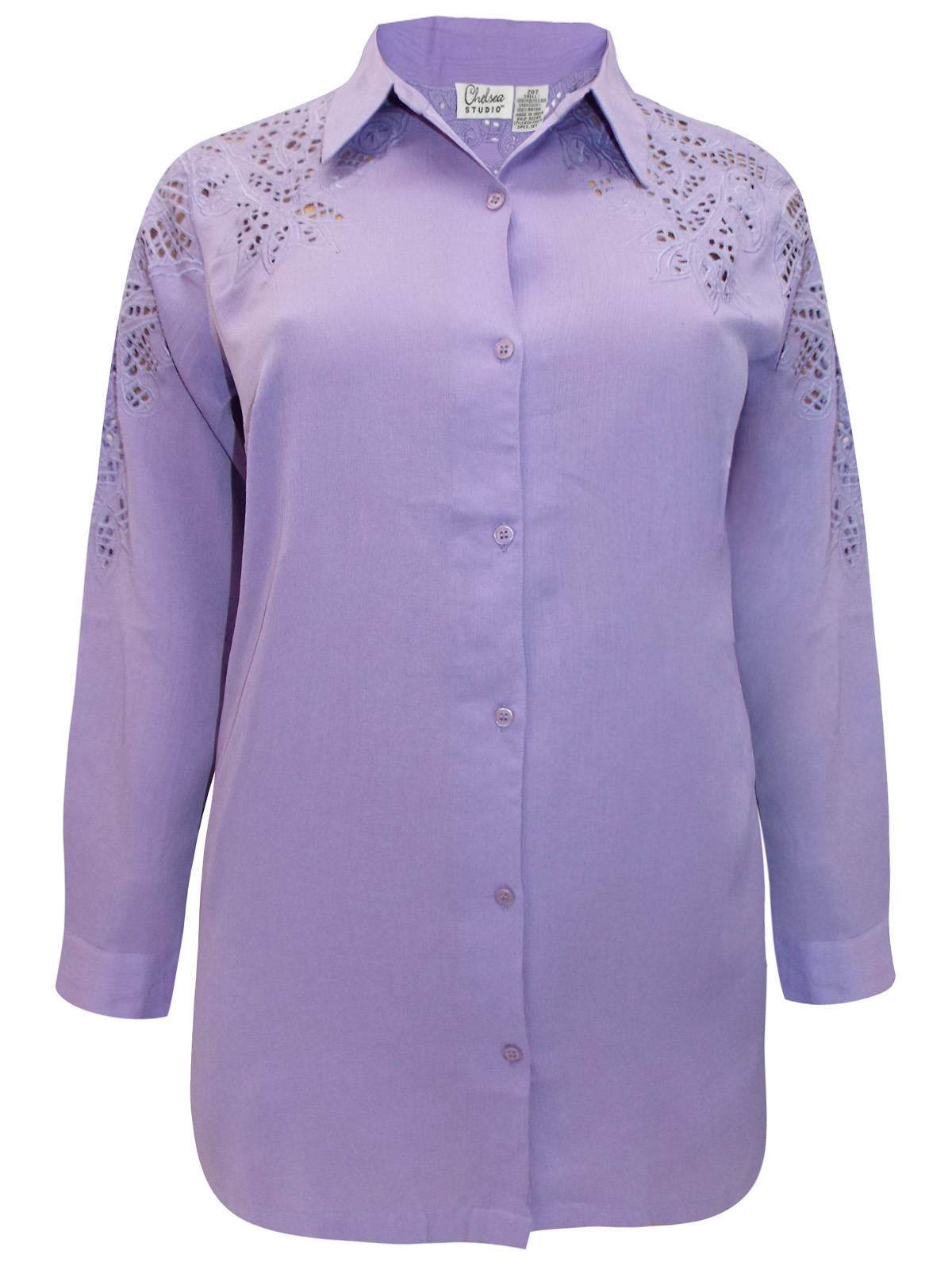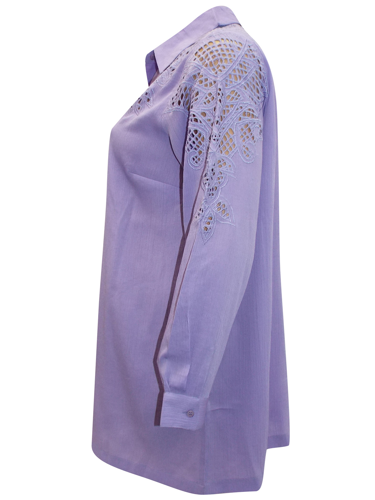This long sleeve crinkle shirt blouse features a beautiful Battenburg lace detail to the shoulders, sleeves, back and front. A Classic collar neck and button through, make this both flattering and comfortable. Petite length 30in. Regular length 32in. Tall length 32.5in.