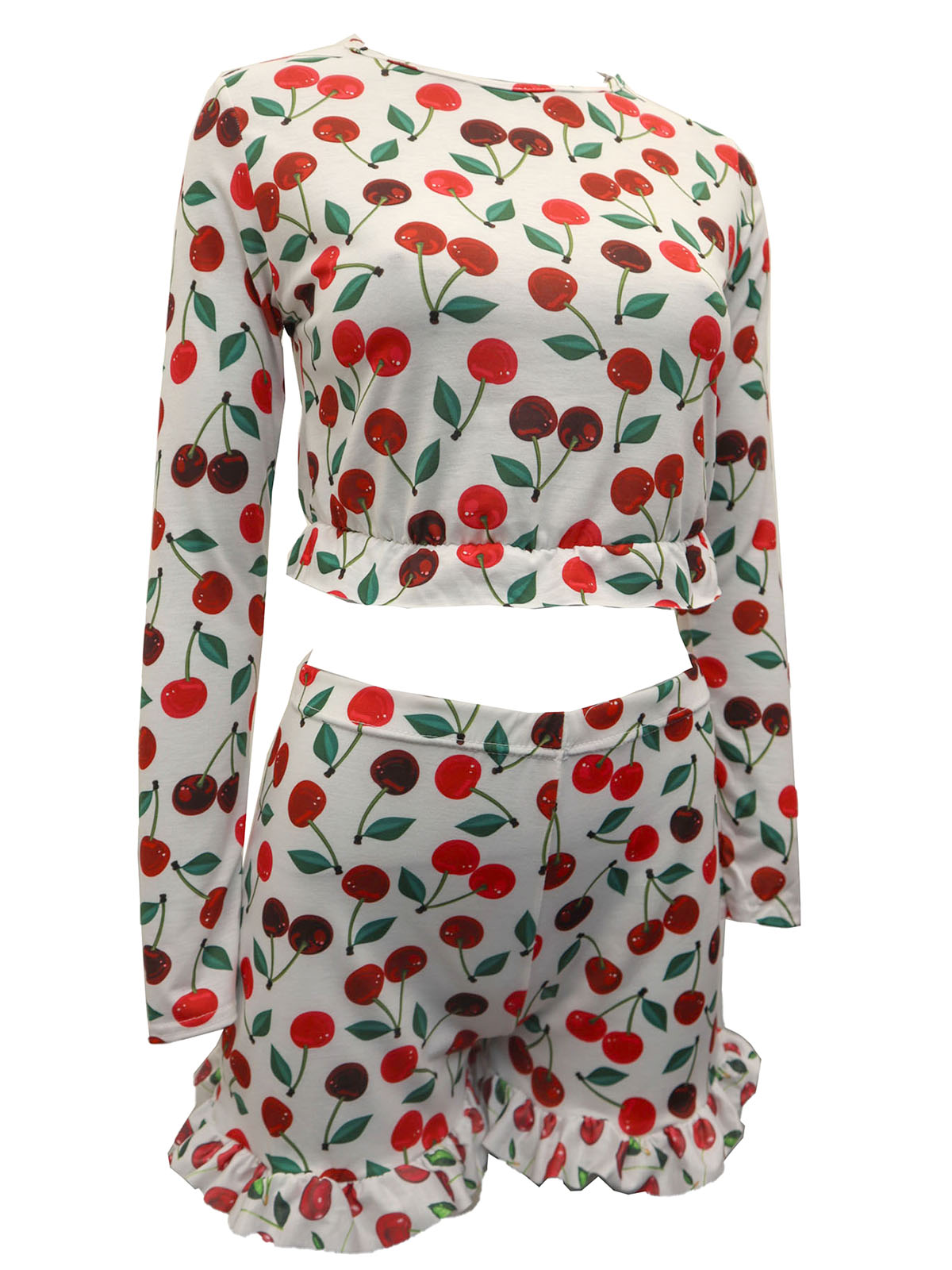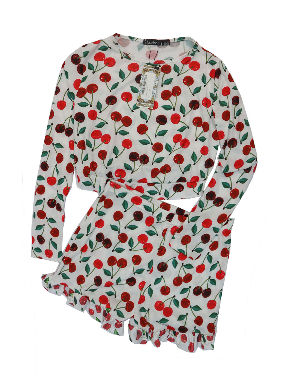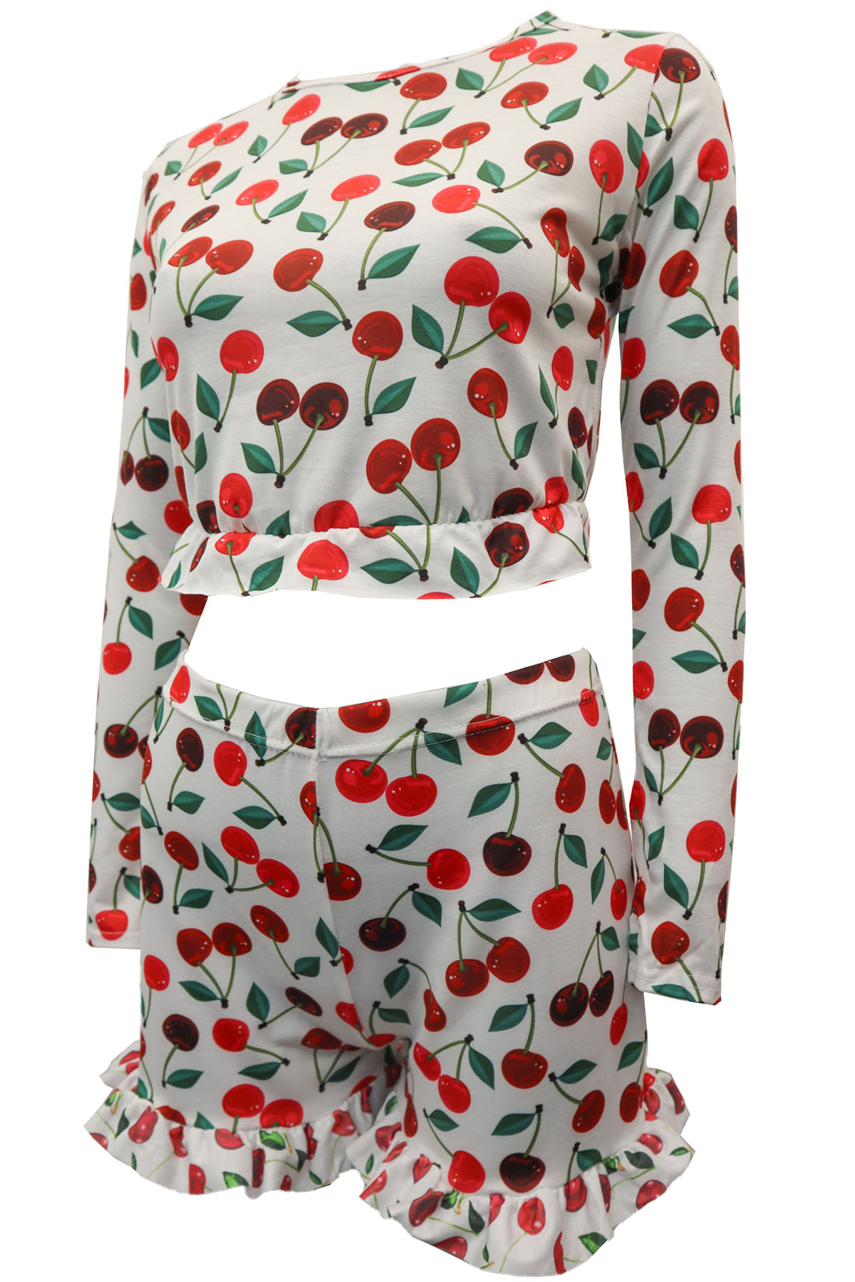 A two-piece soft and comfy Lounge or Pyjama frill hem short set in pink with all-over cheeries on stem print. Long sleeve, crew neck cropped top with frill hem, paired with an elastic waist shorts with frill hem. Breathable viscose stretch fabric to keep you cosy yet cool during warmer seasons.