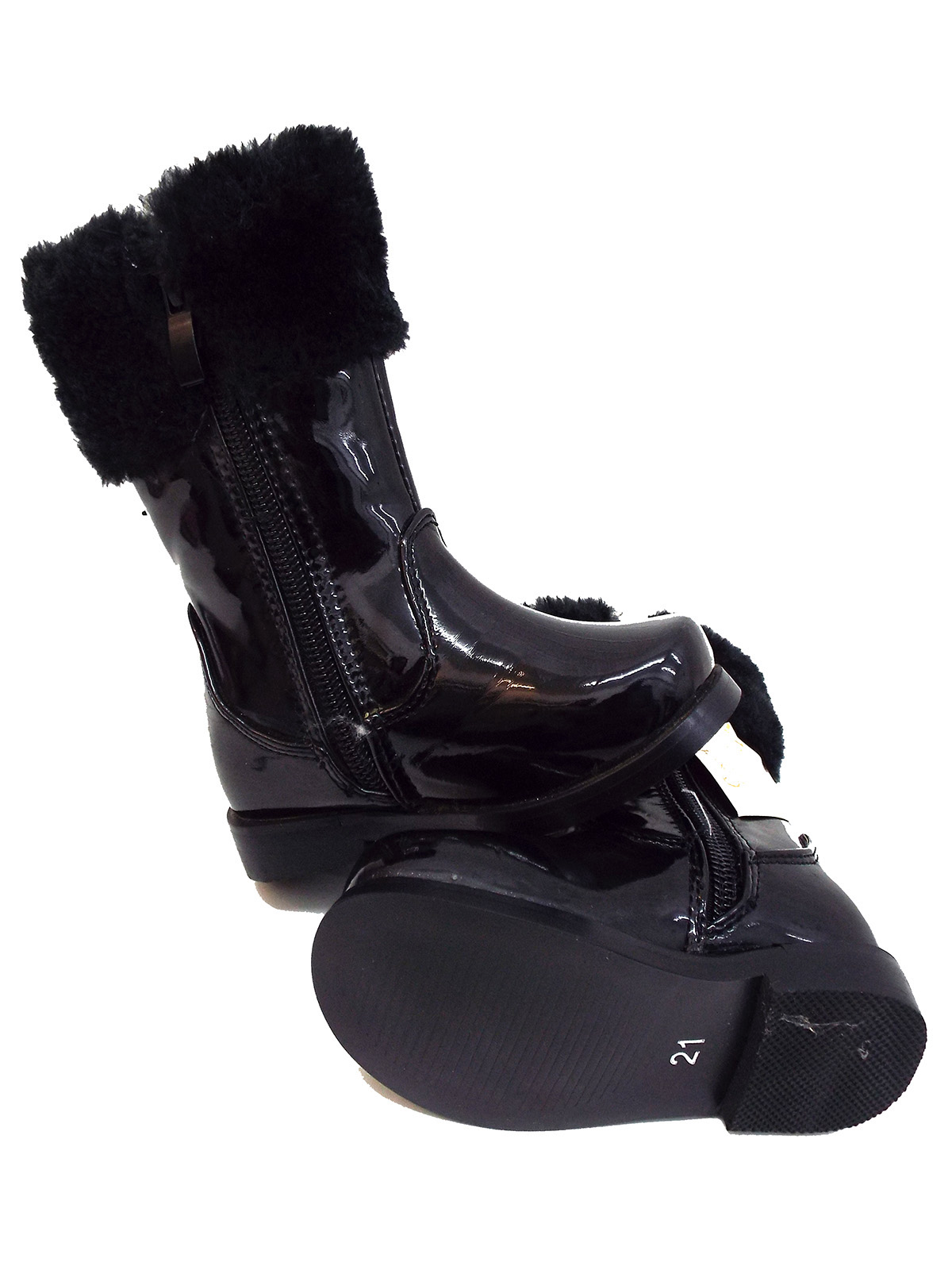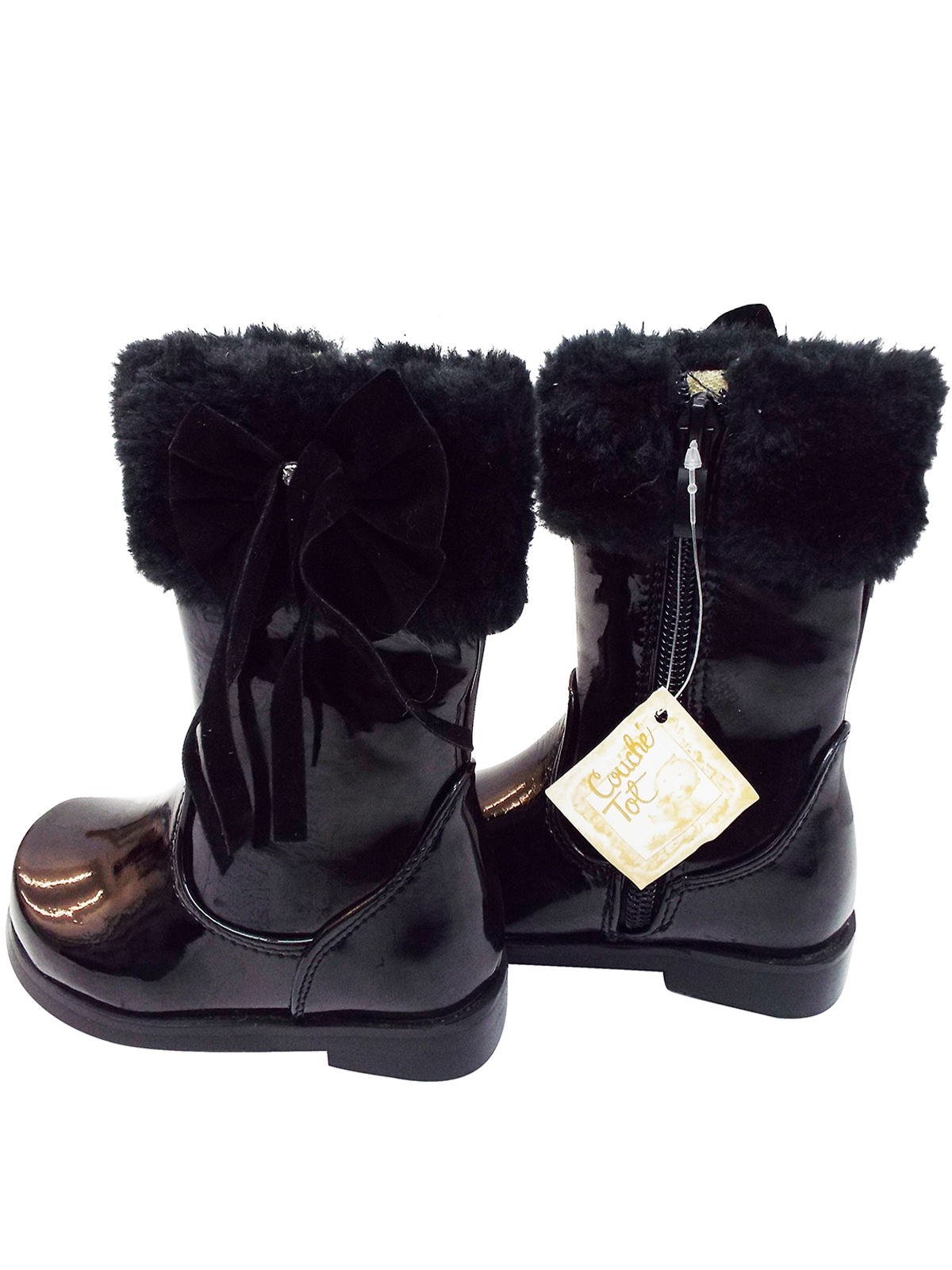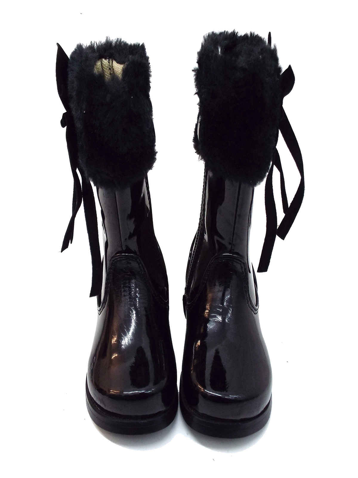Give her footwear selection a new season update with these adorable boots. Constructed with a high shine black patent outer, features include practical zip fastening to the inside. Trimmed with a faux fur alongside a pretty bow to the side for added cuteness.