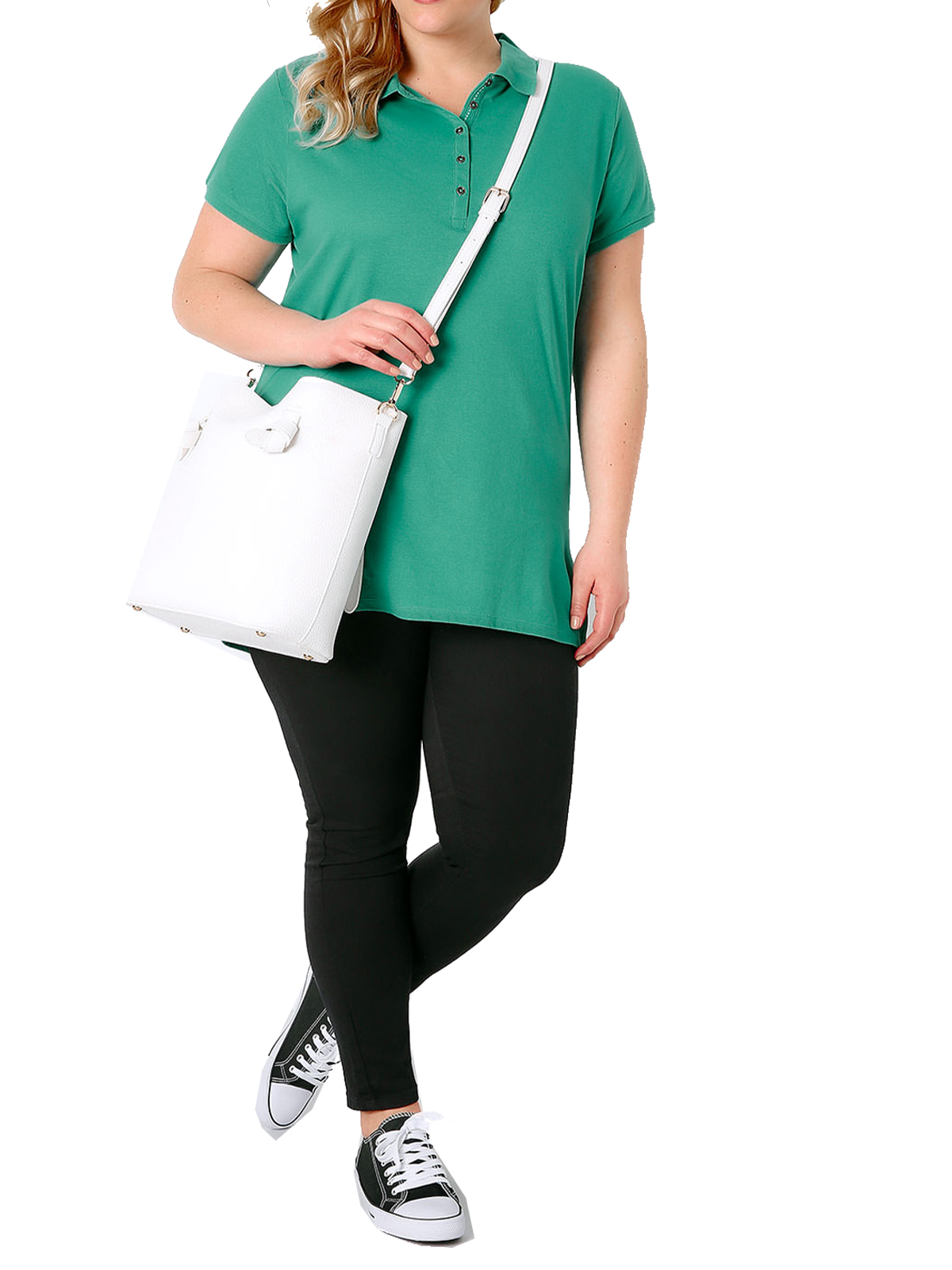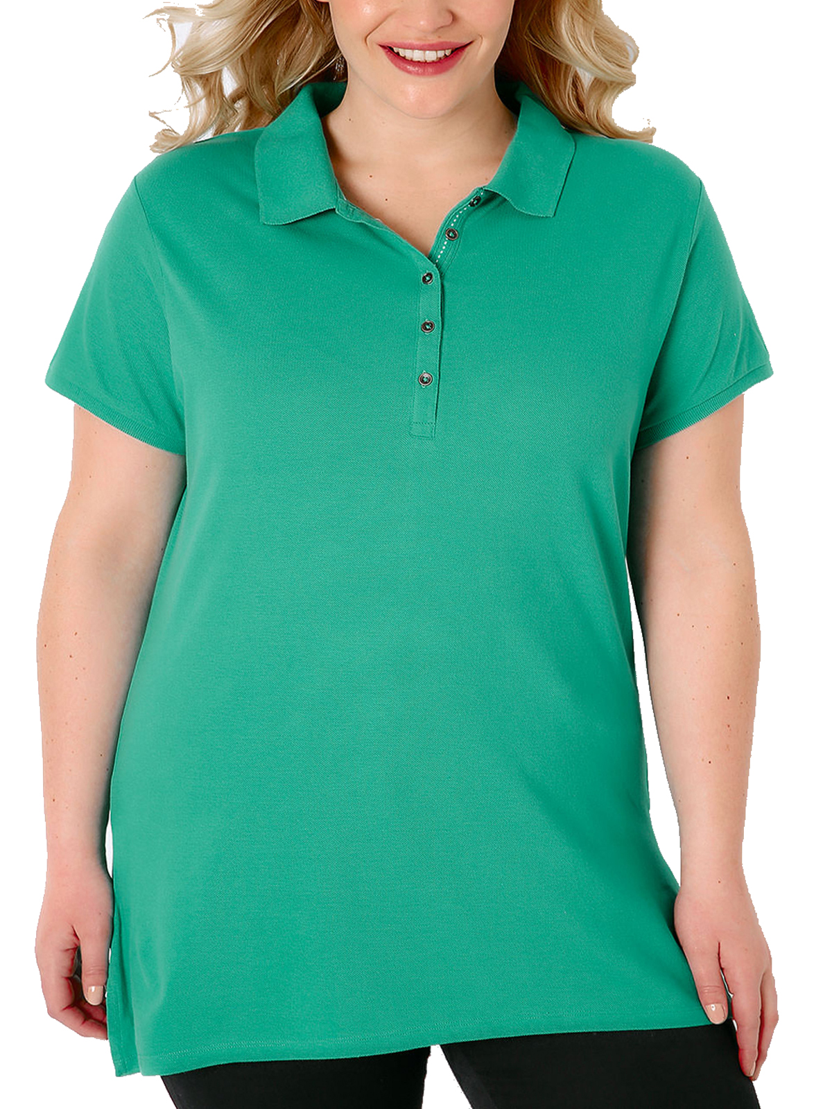 Plus size jade green polo t-shirt with short sleeves, side splits and button fastenings to the front of the garment. Style with skinny jeans and pumps for an on trend daytime look. Length from (approx): 76cm/30inches.