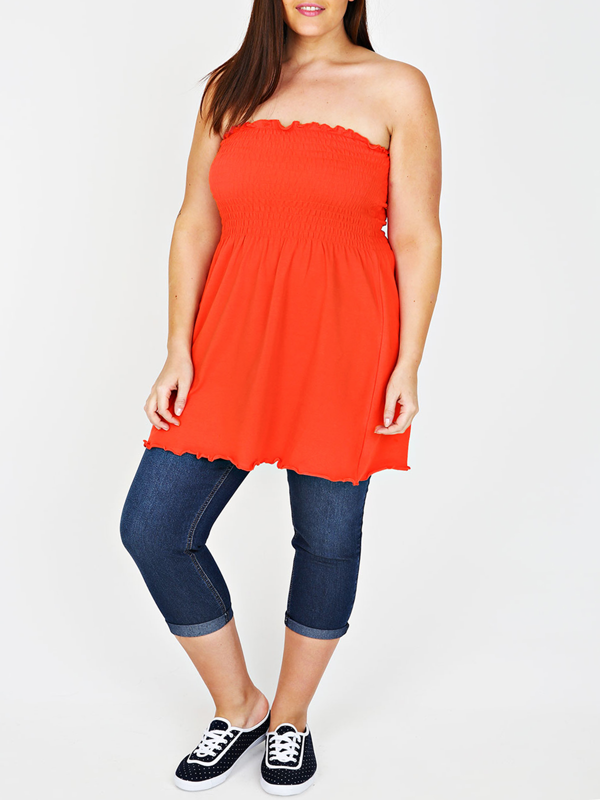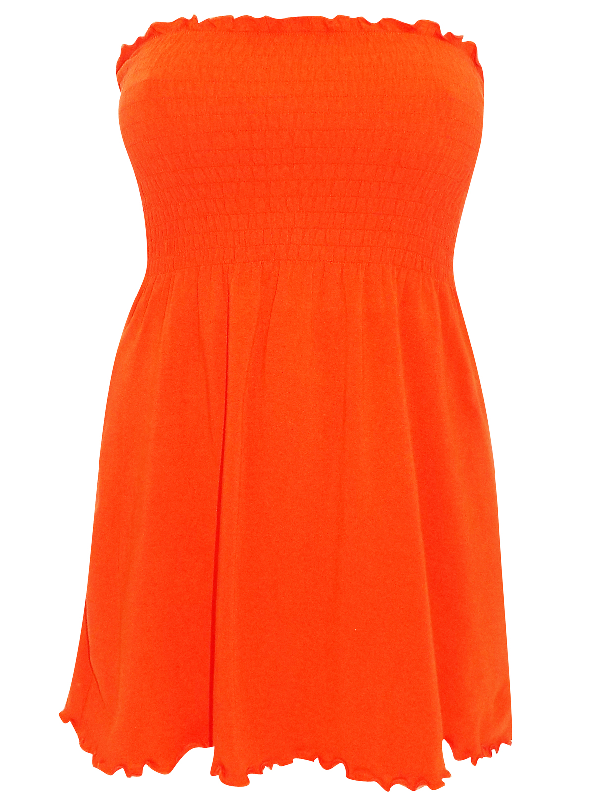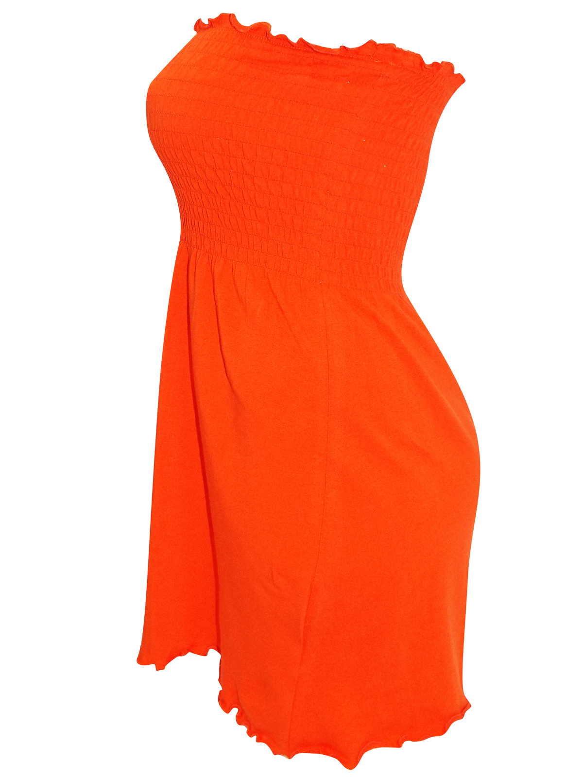 Strapless with a smocked bust for support then flares out to the hem which has a scallop detail all round. Length 26in.