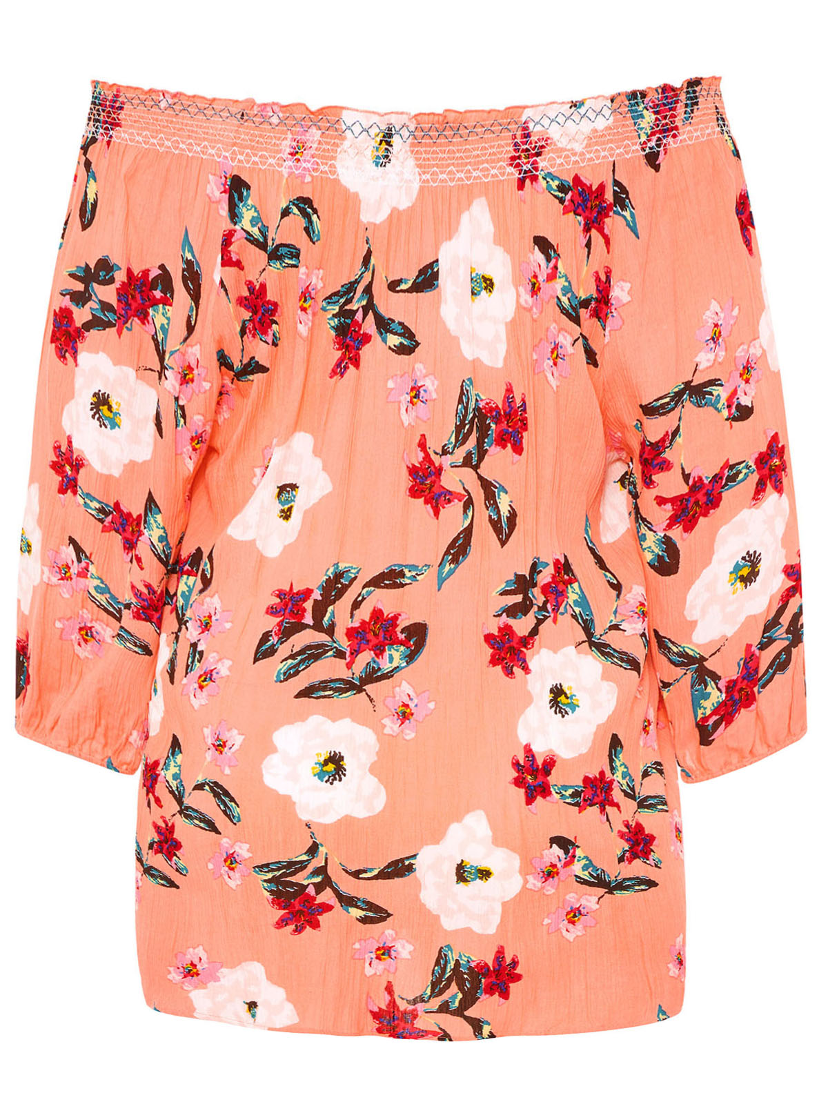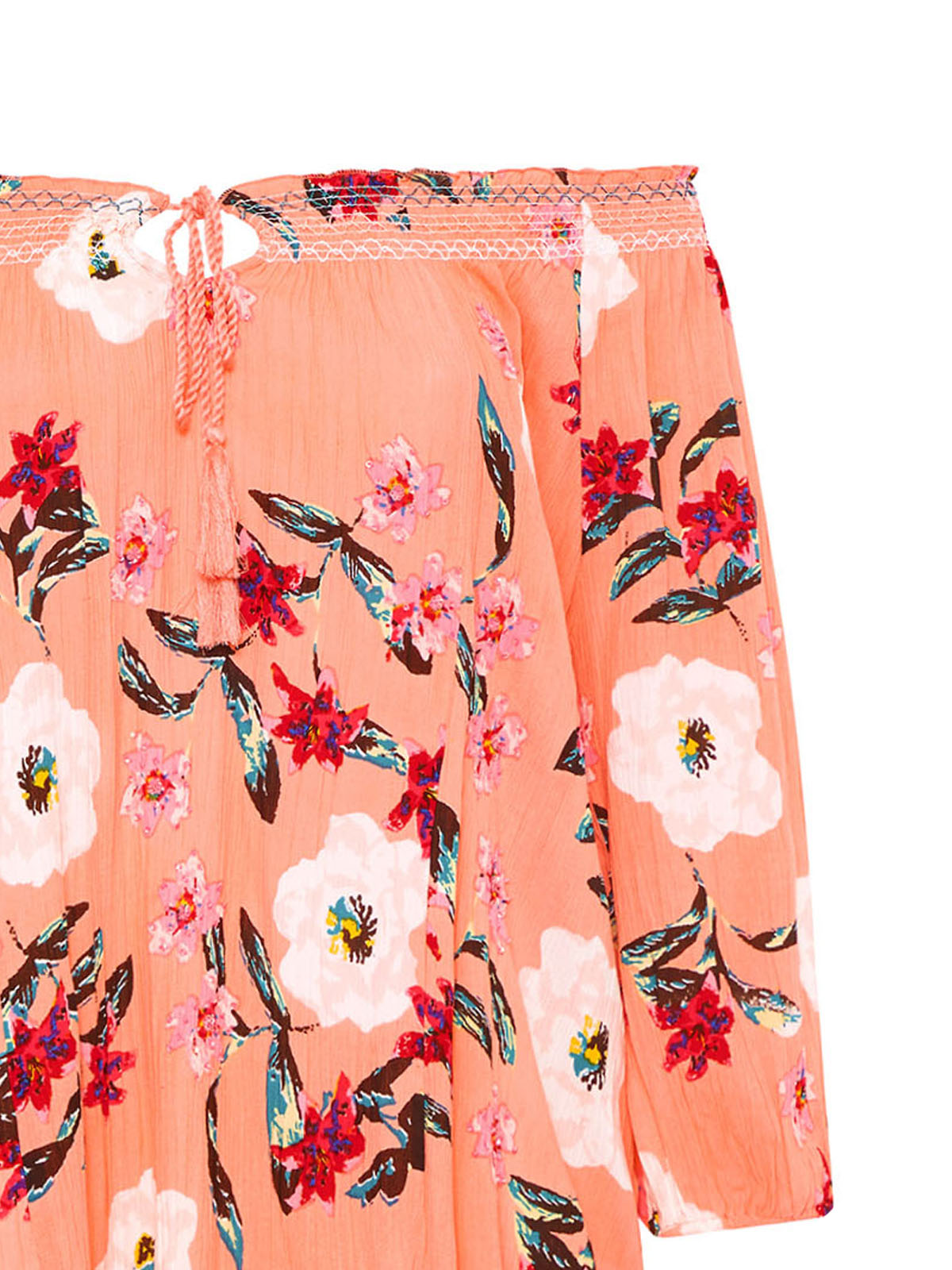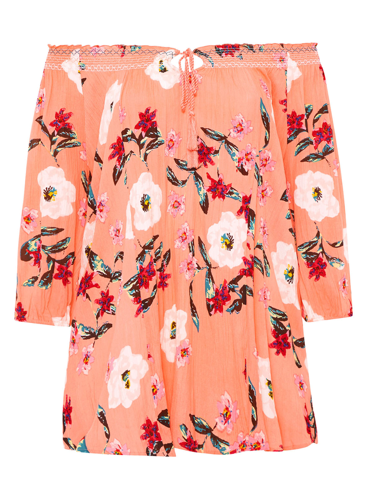 A pretty print for the summer. Made from a comfortable jersey fabric, this top features a bardot style, a floral design, short sleeves, and tassel ties. Length 31in.