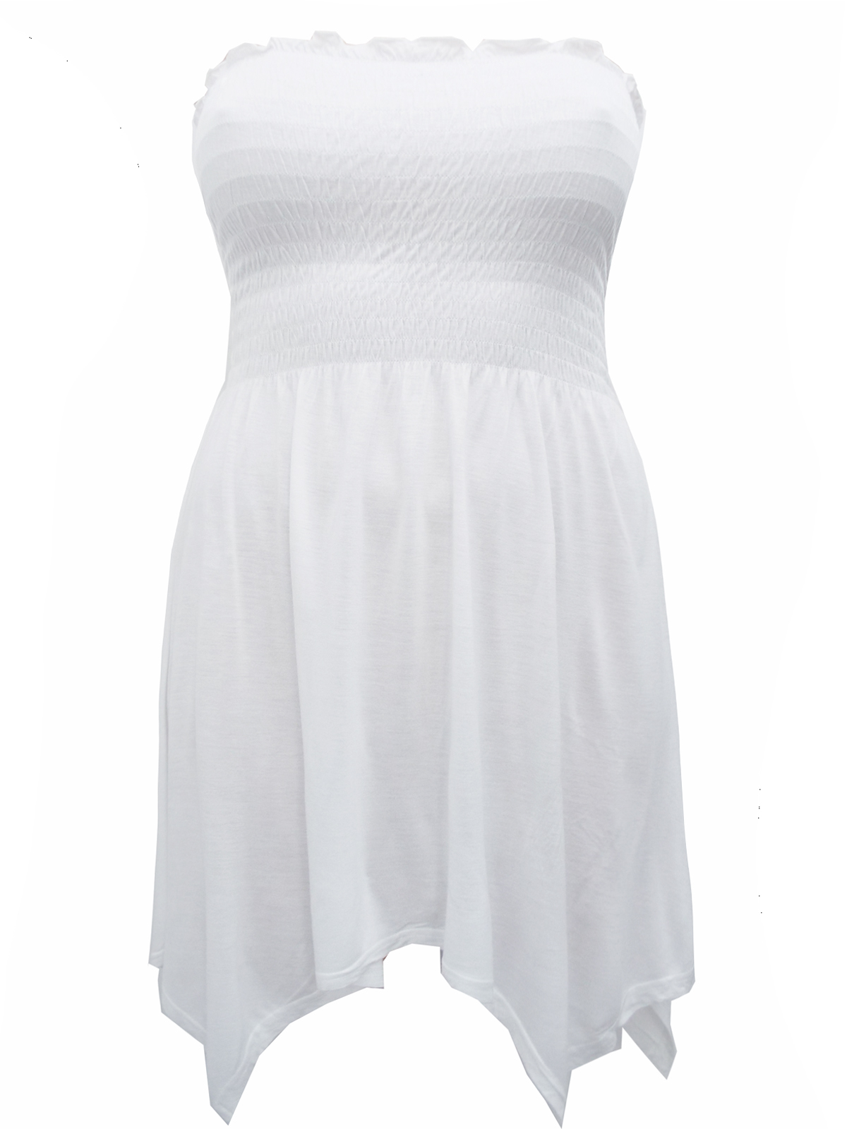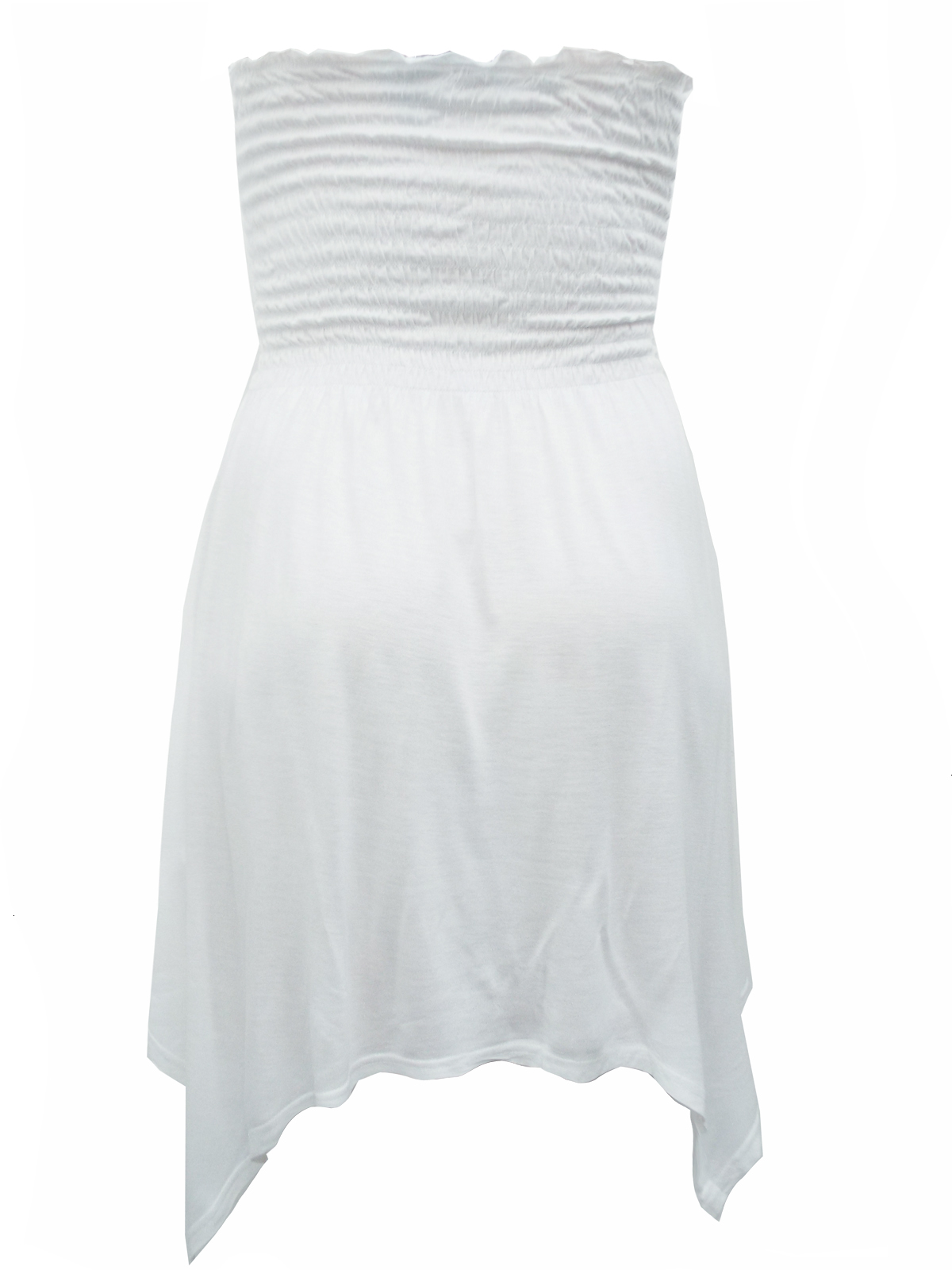 Great summer essential. Light anf fluid jersey strapeless top with a smocked bust for support then flares out to a handkerchief hem.
