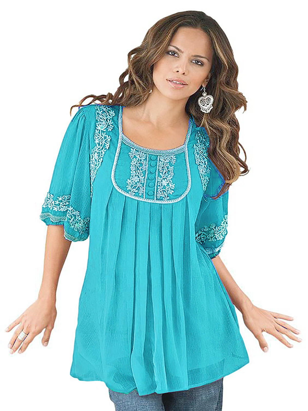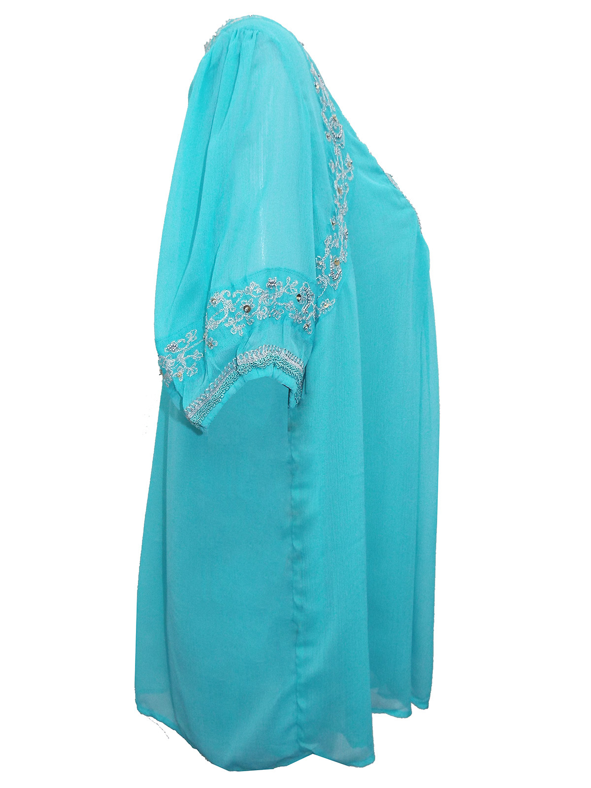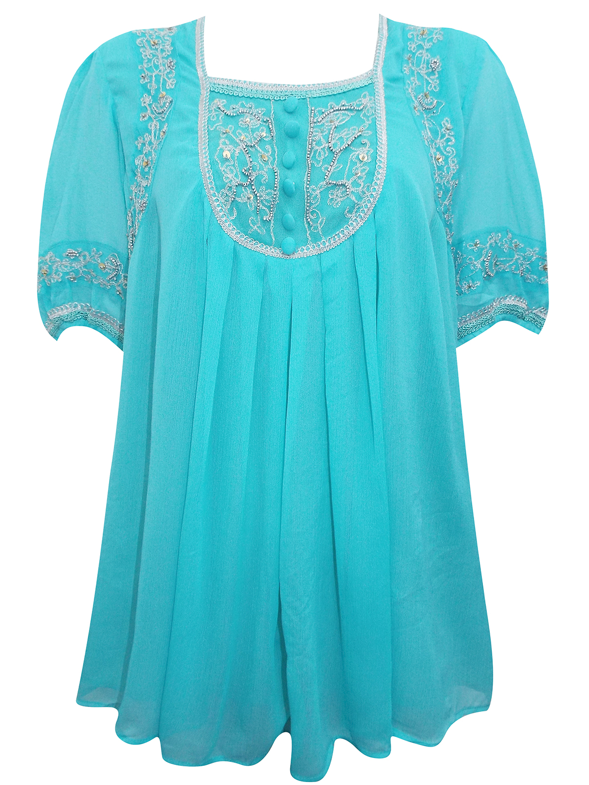 This ultra stylish embroidered plus size top is a perfect staple for the season. A-line design creates a beautiful shape. Delicate embellishments and embroidery elegantly decorates the neckline and sleeves. Length 31in.