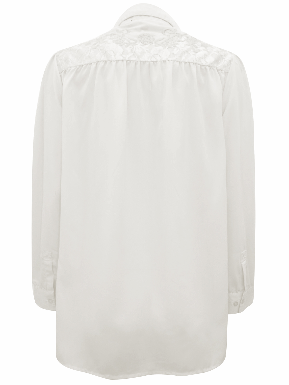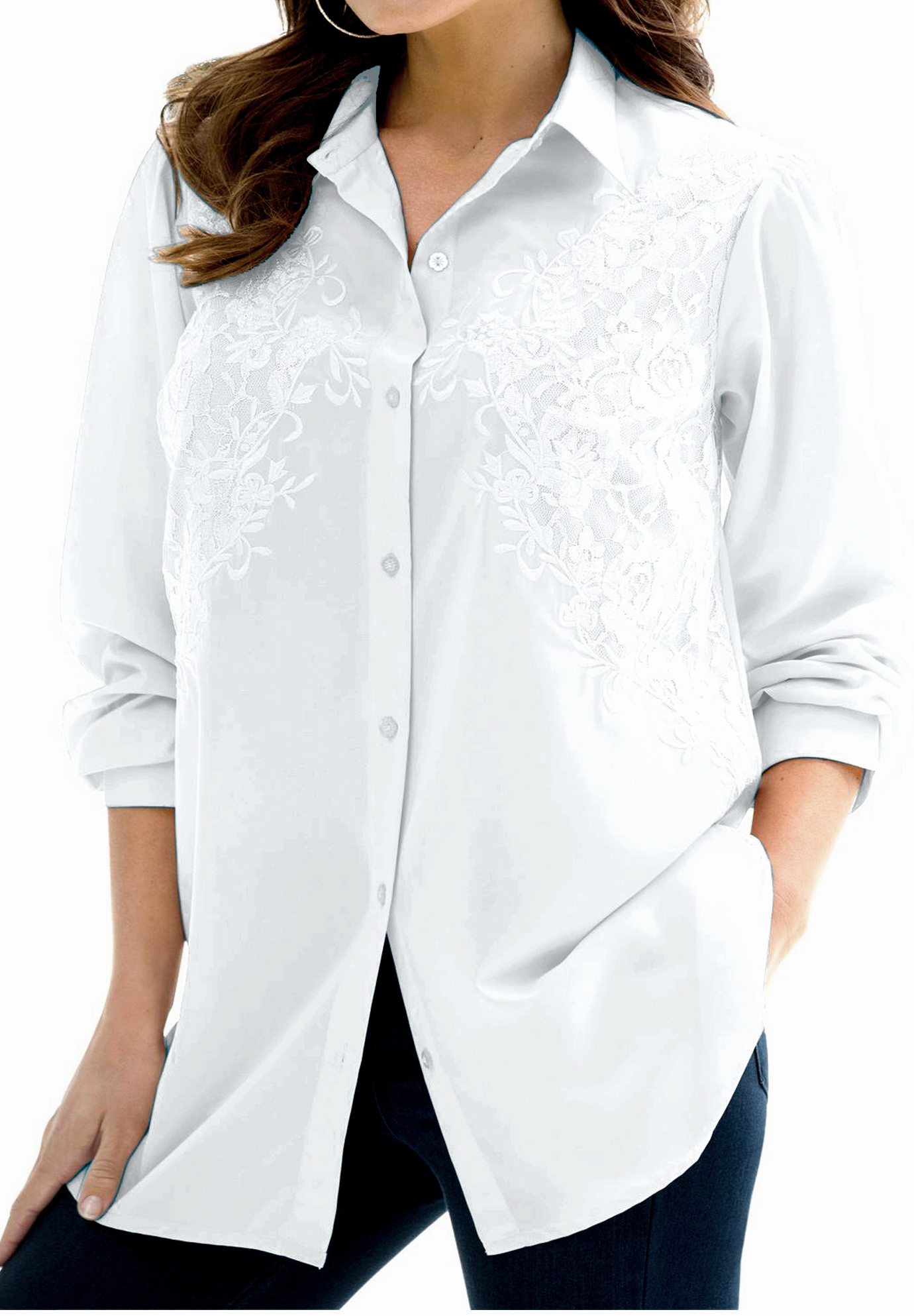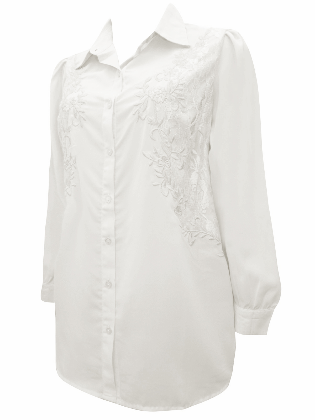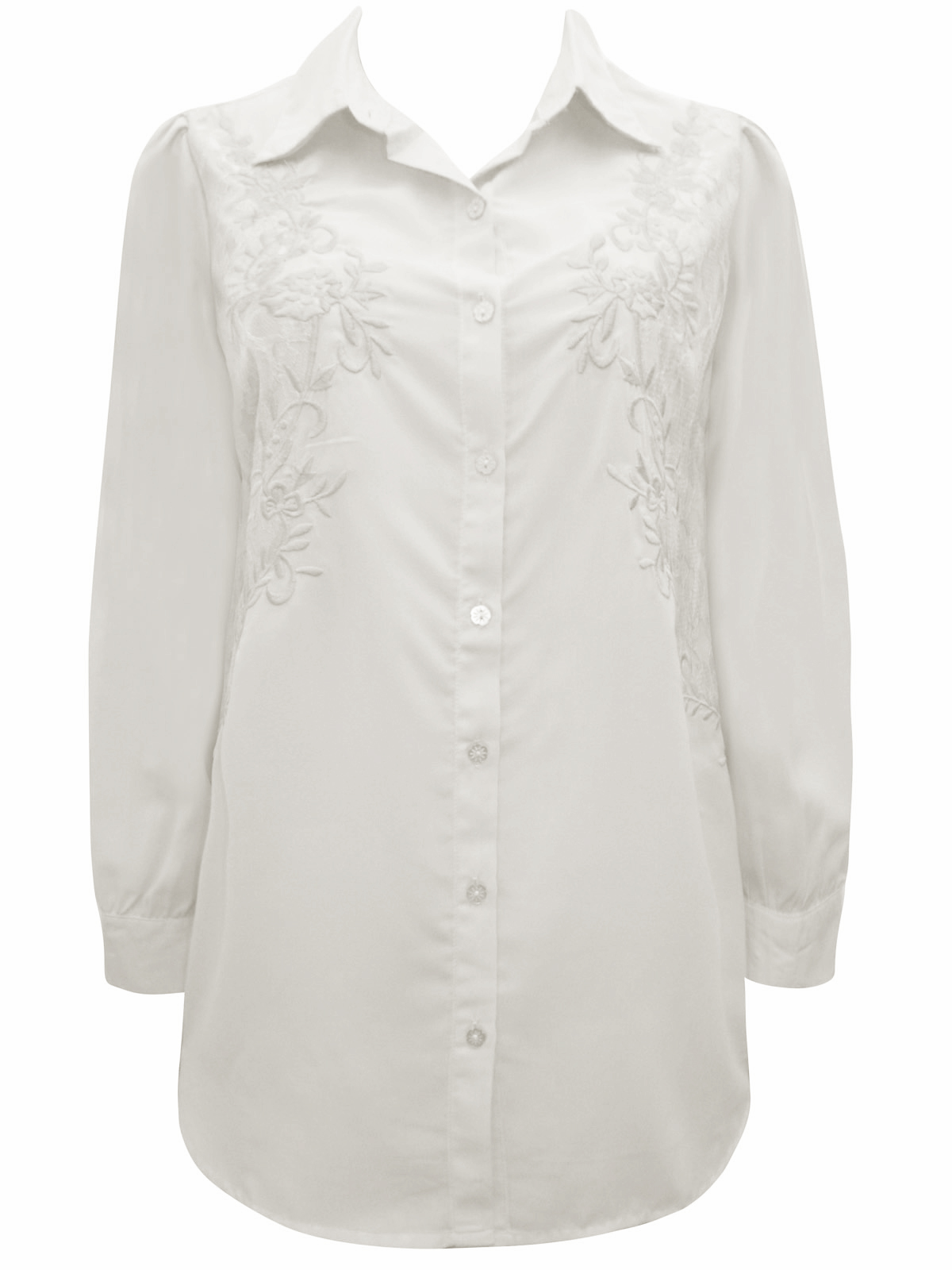 Plus size longline shirt with a classic collar and button through fastening. Long sleeves with single cuffs and ruched detail. Embroidered design to the yoke. Curved hem.