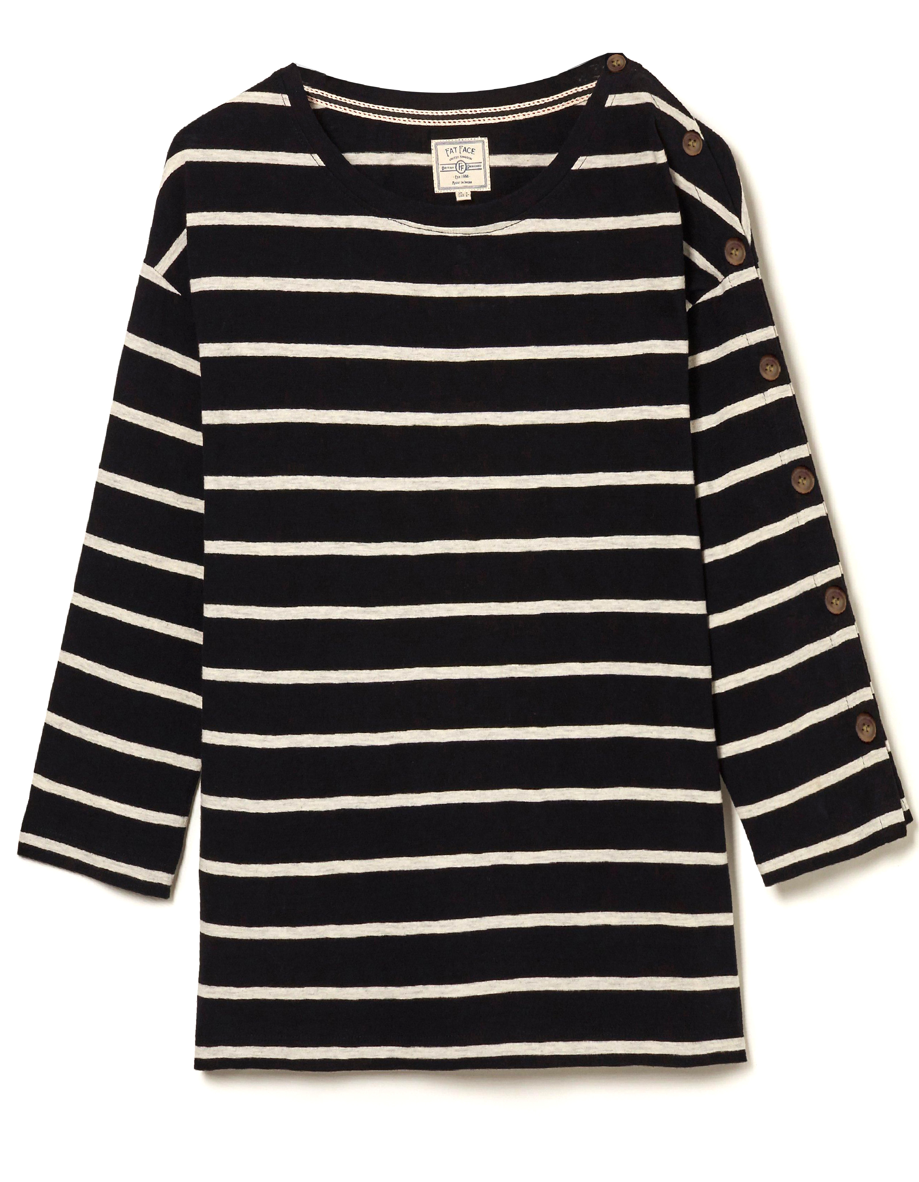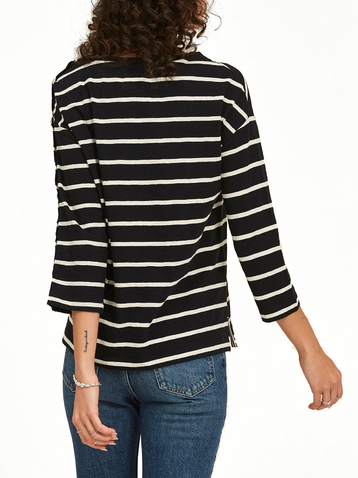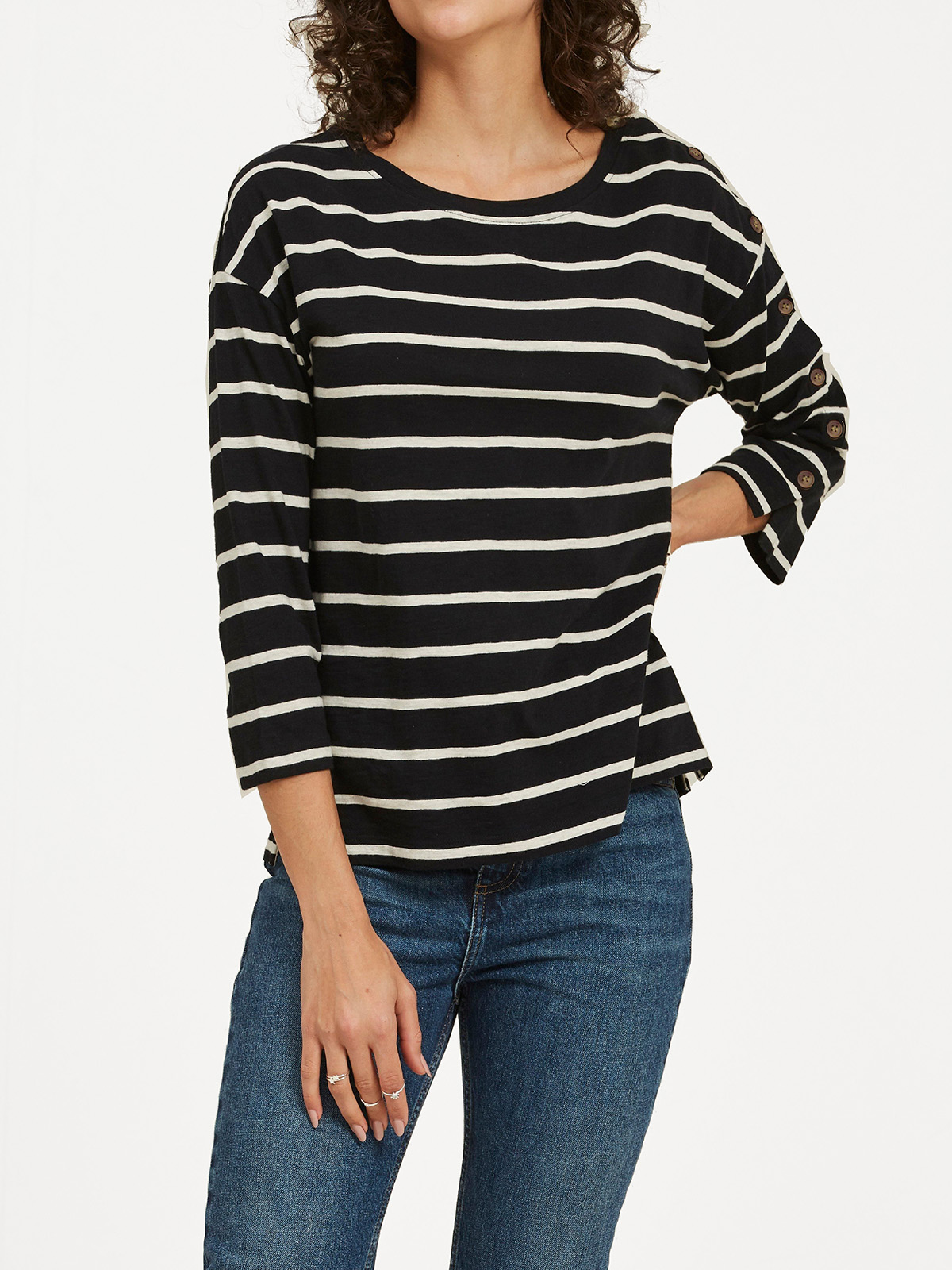 This top is a lovely addition to any style and features Button detailing along left sleeve, relaxed round neckline and three quarter sleeves. Length 27in.