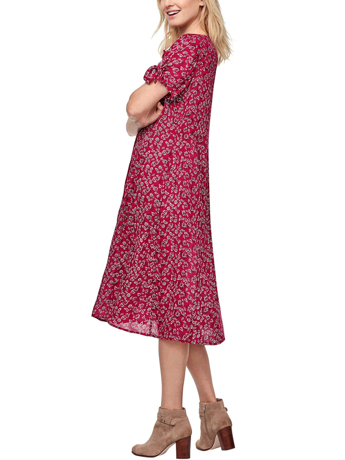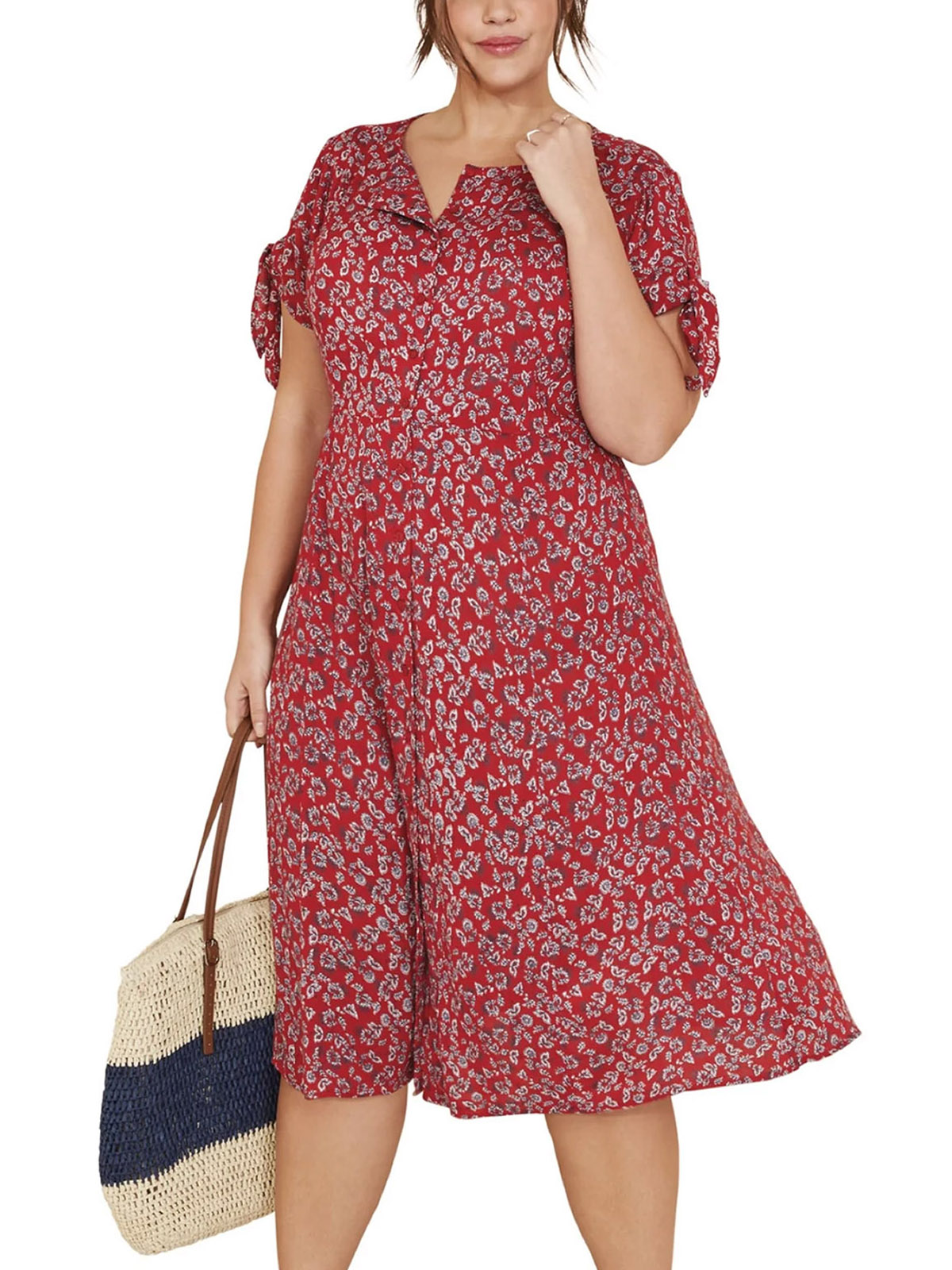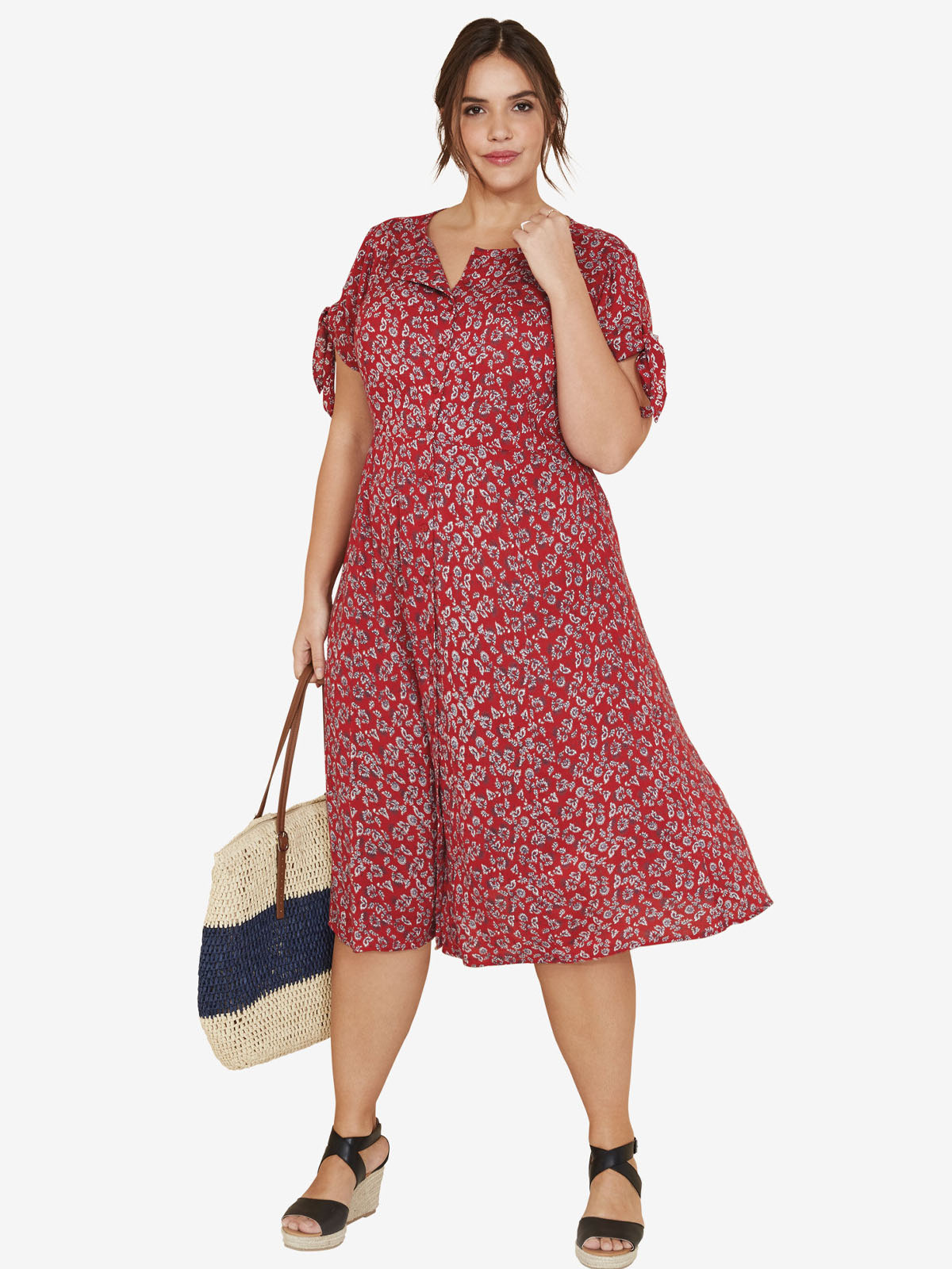 through front, short sleeves with tie detail, and a scoop neckline. Length