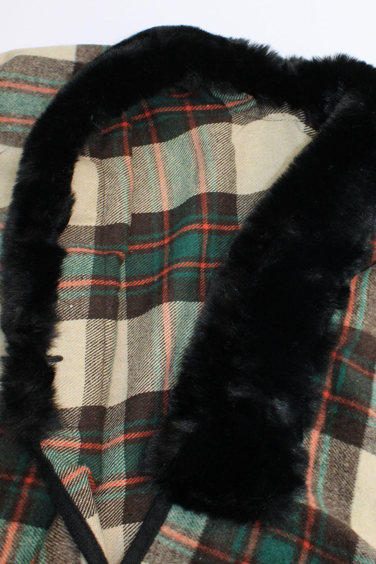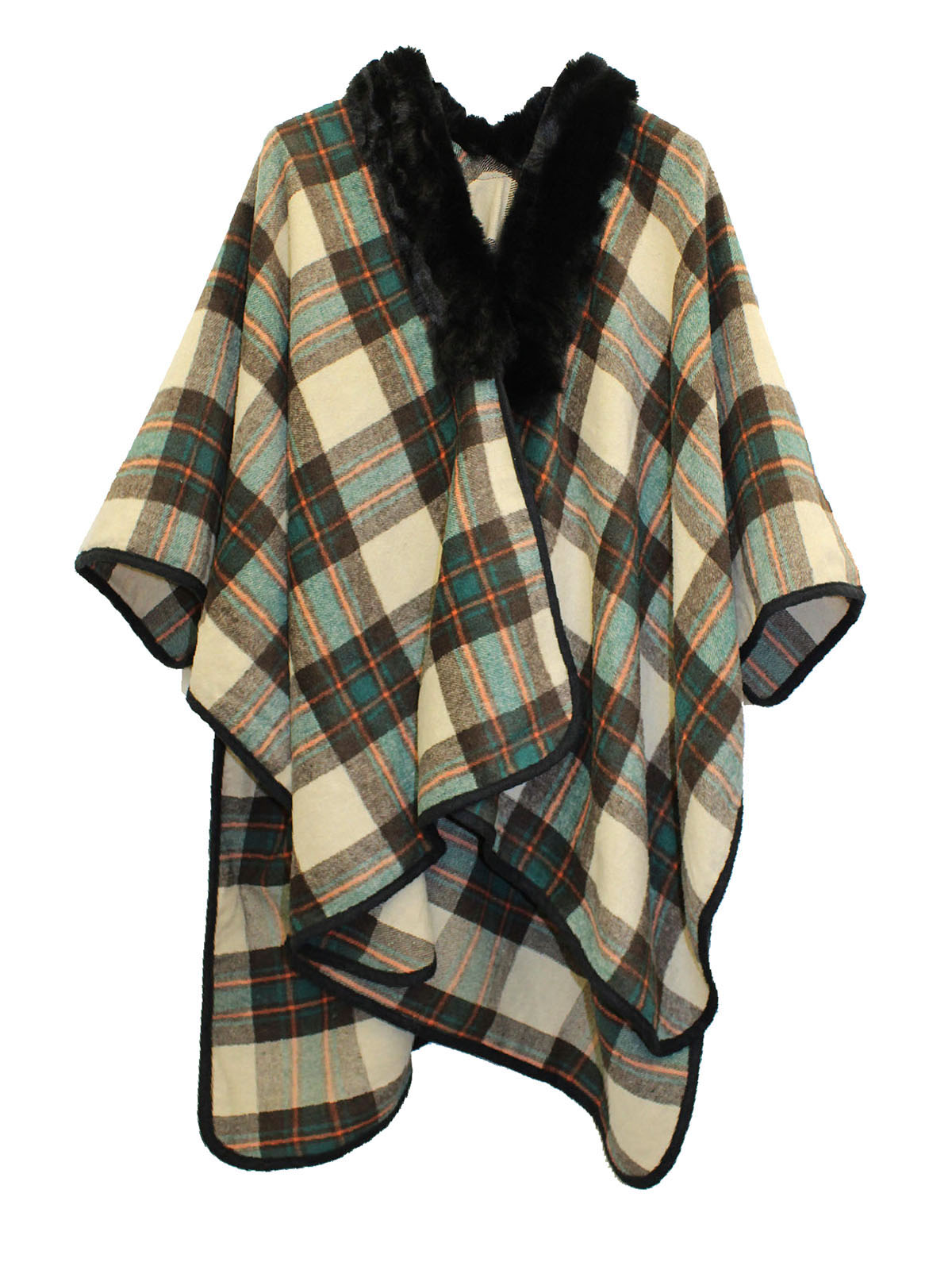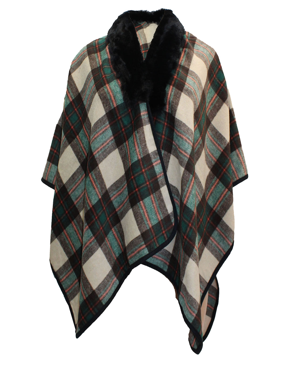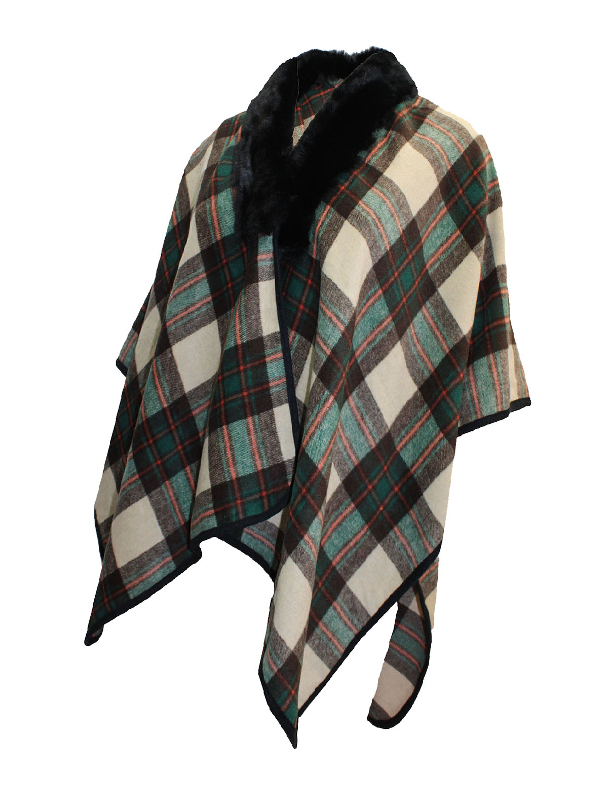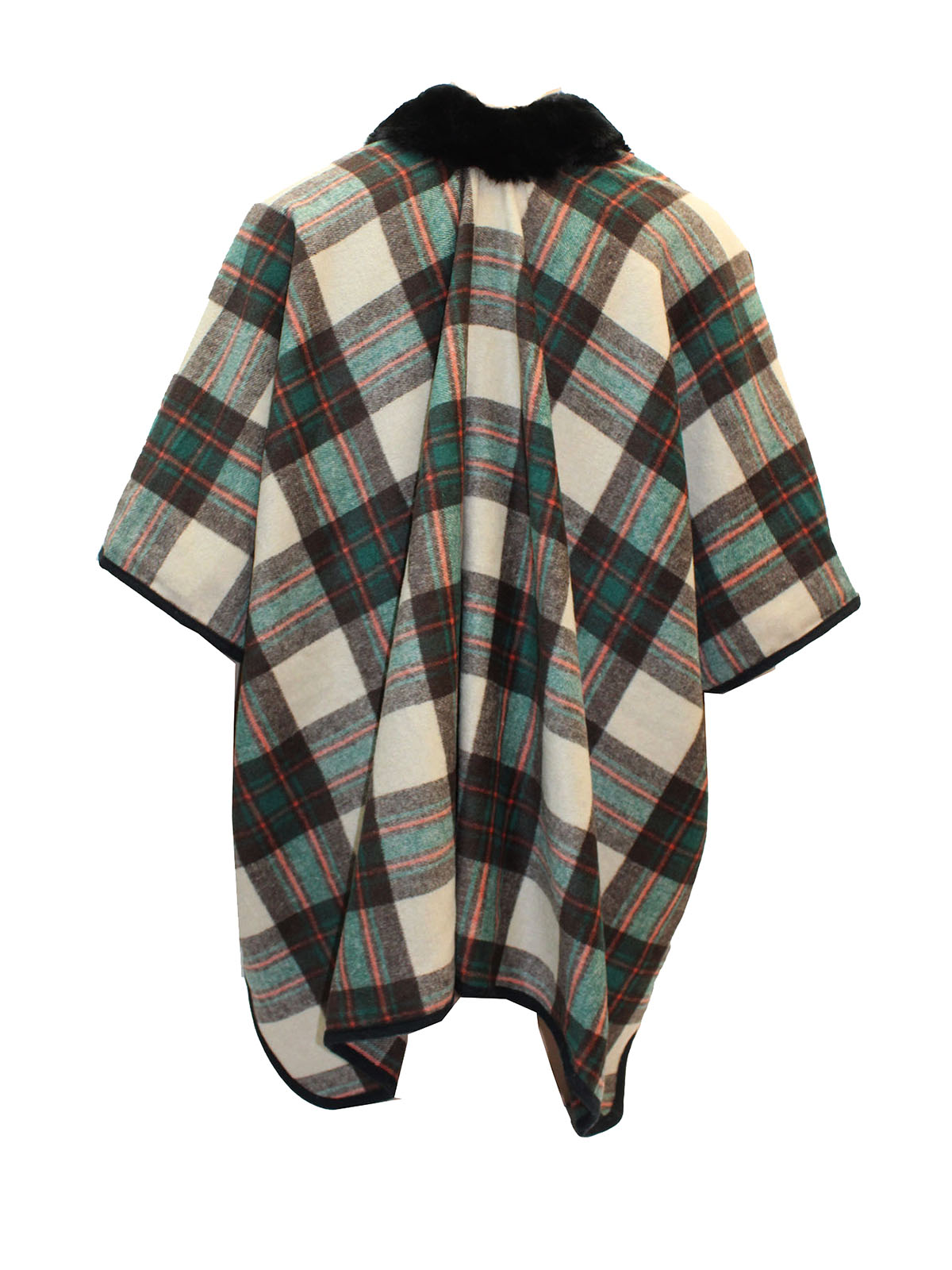 Faux Fur Collar Wool Blend Checked Poncho, made in Scotland