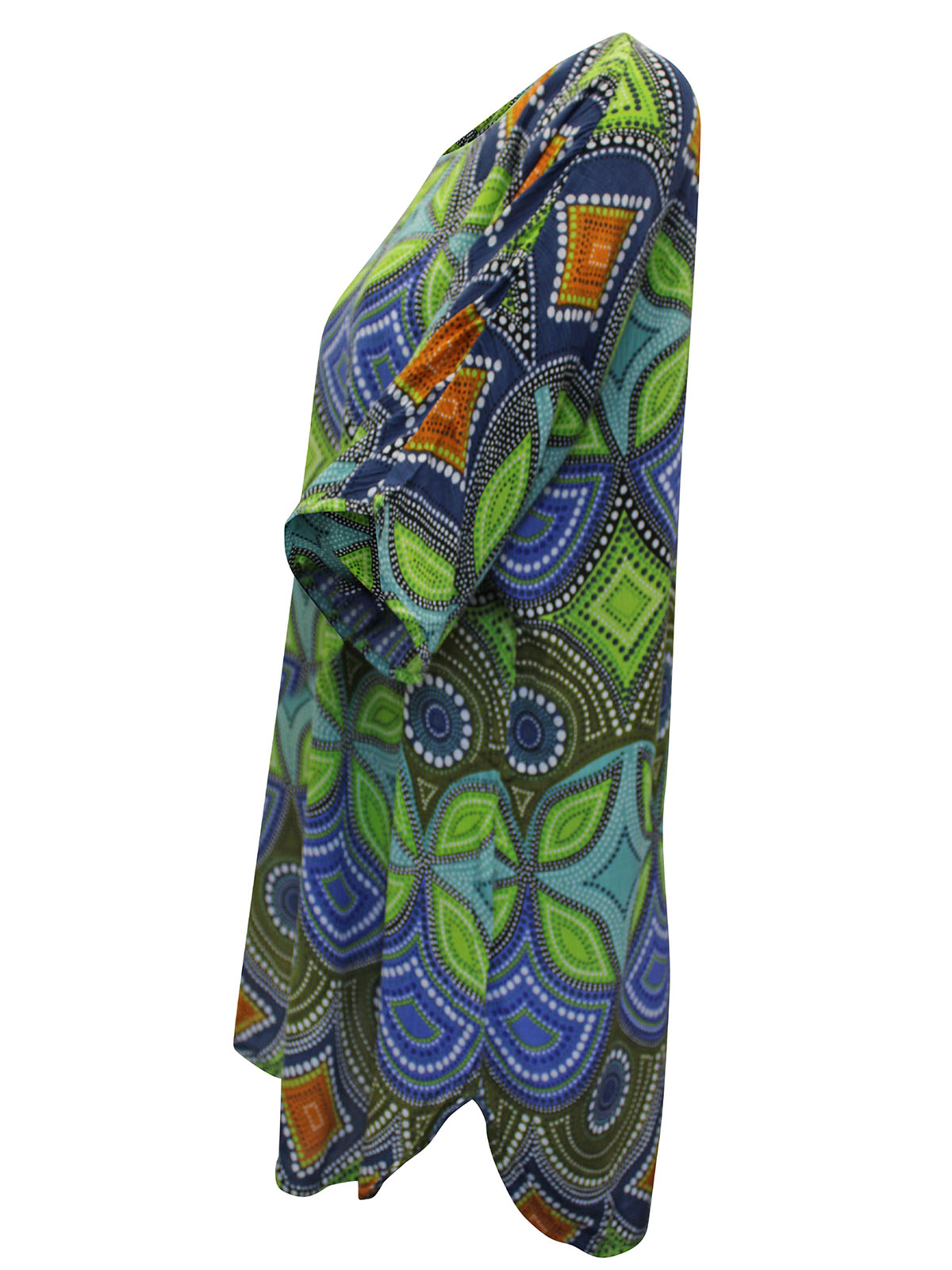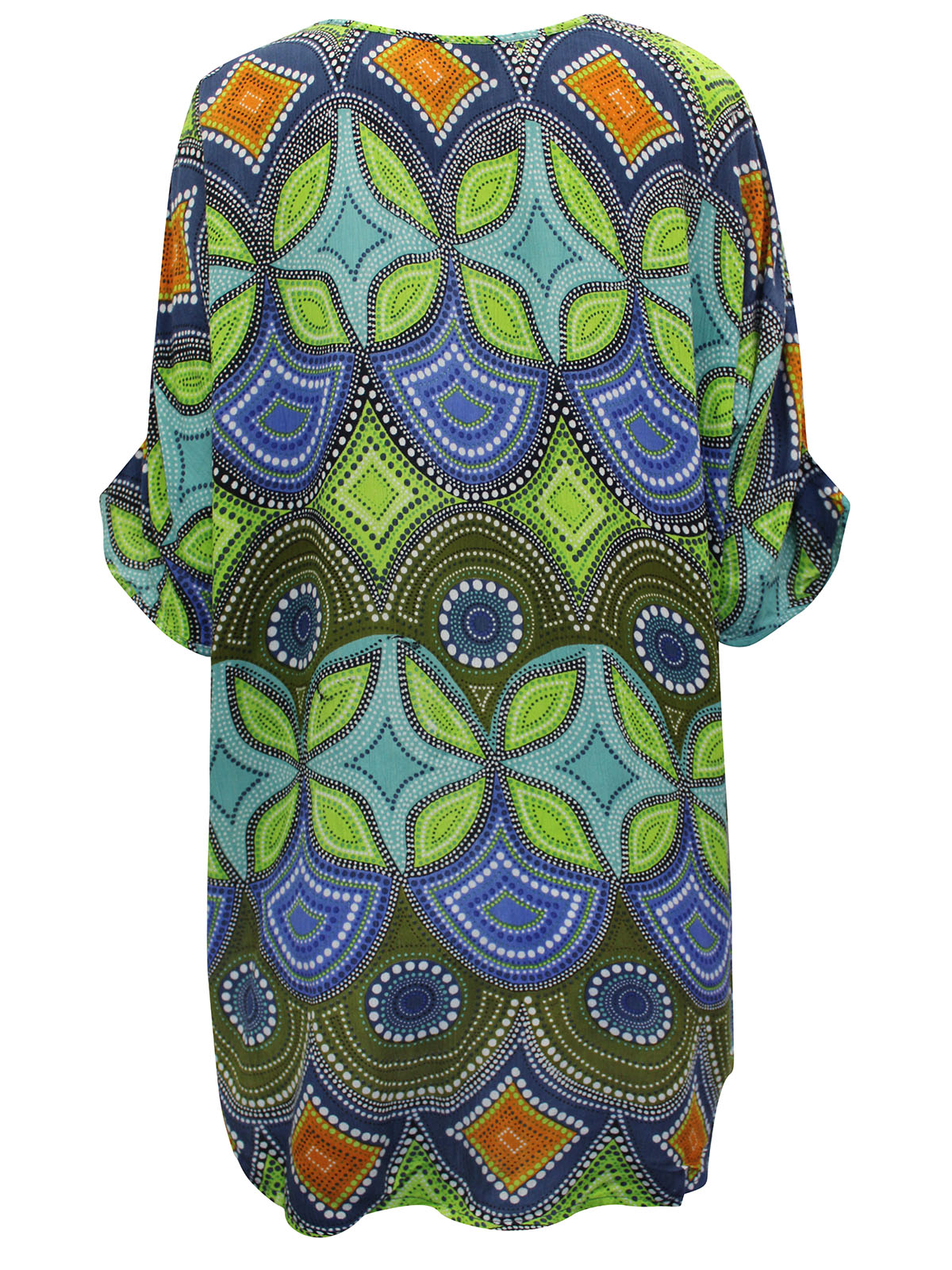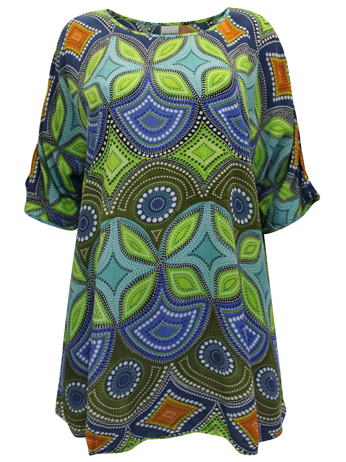 Prints are the perfect way to brighten up your wardrobe and this top is no exception! Cut from a woven fabric, this top features a scoop neckline and comfortable short sleeves. Designed to pull on overhead with a bold kaleidoscope print, this piece is sure to become a wardrobe staple this season. Length 29in.