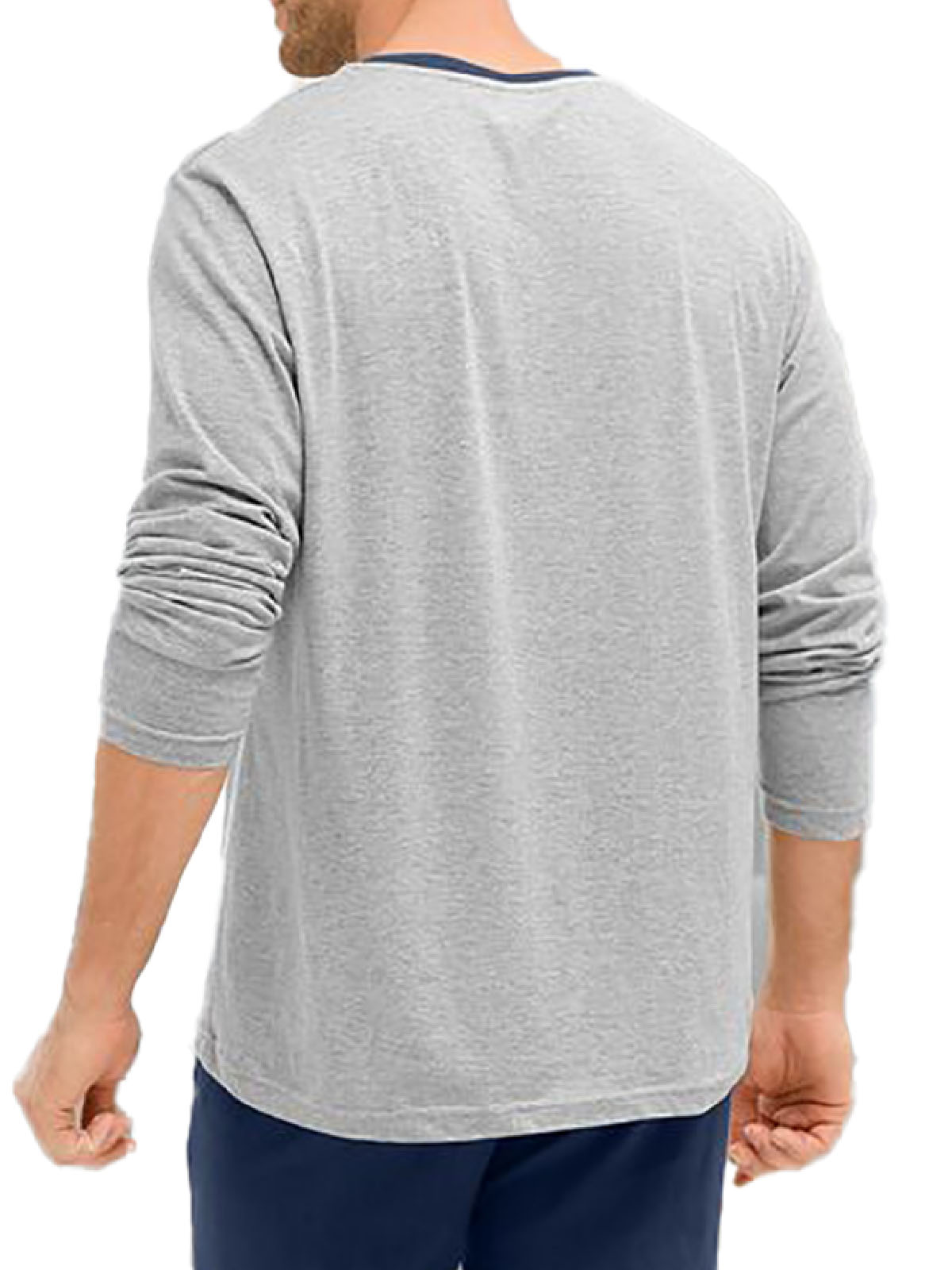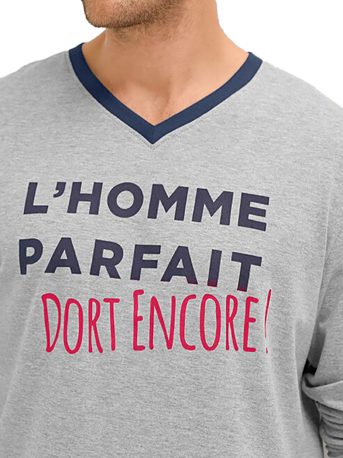 When you need a pick-me-up first thing in the morning or last thing at night, reach for this charismatic printed top! In a cotton-rich fabric is breathable for a cool and comfortable sleep. Featuring a v-neckline with ringer trim and long sleeves. L'homme parfait dort encore! translates to the perfect man still sleeps!.