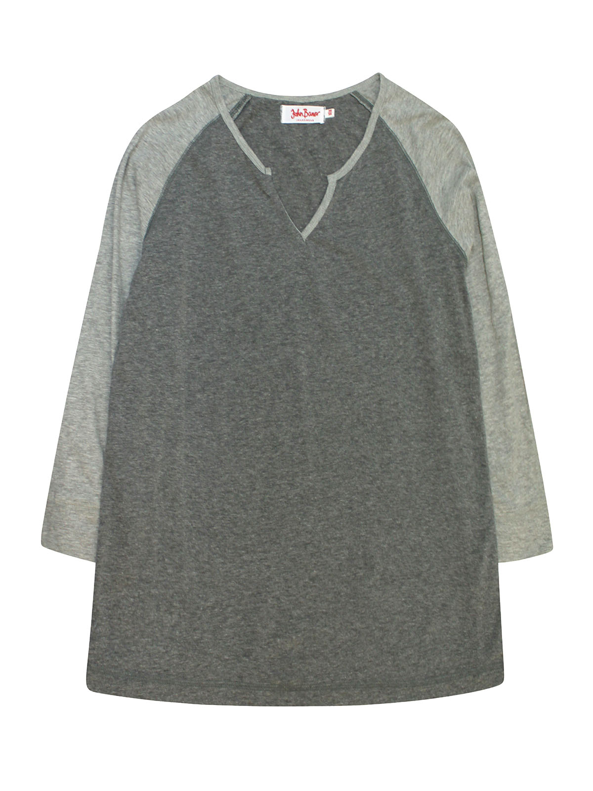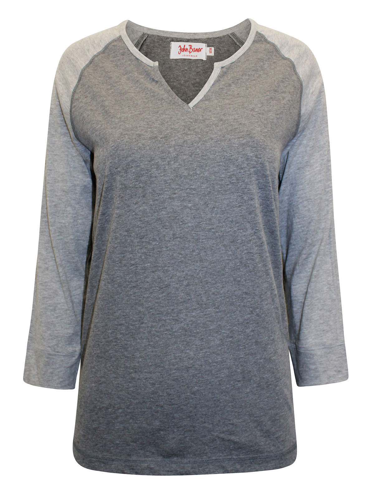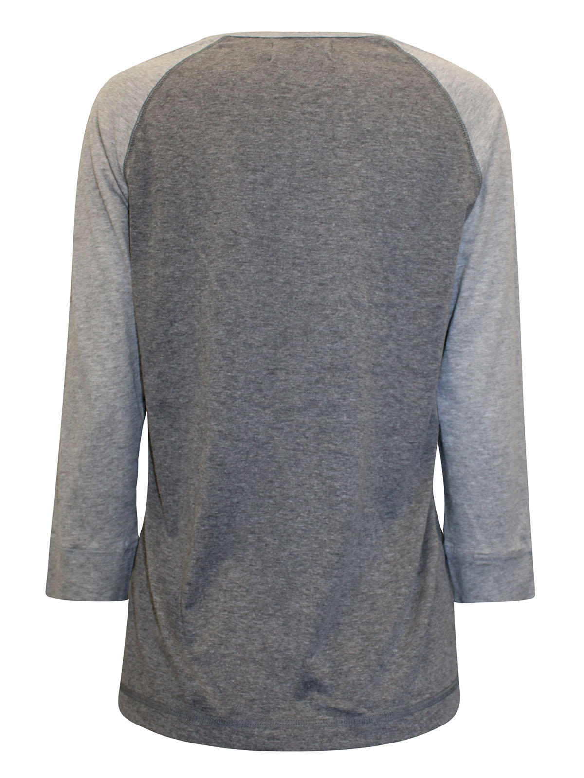 Practical yet cute, this grey raglan T-shirt is a perfect staple for your wardrobe. Featuring a notch neckline and flattering 3/4 length sleeves. Length 25in.
