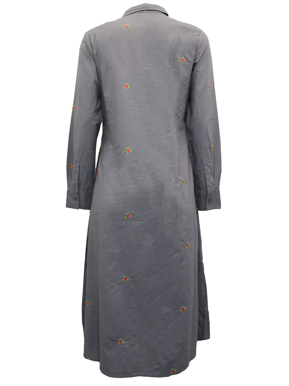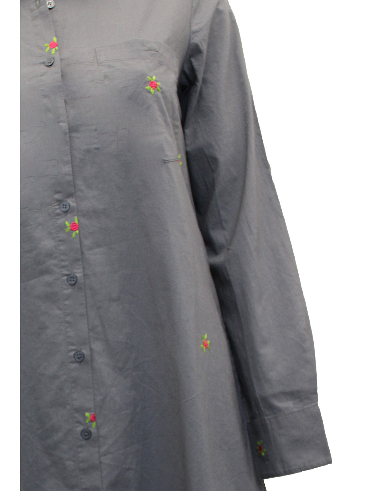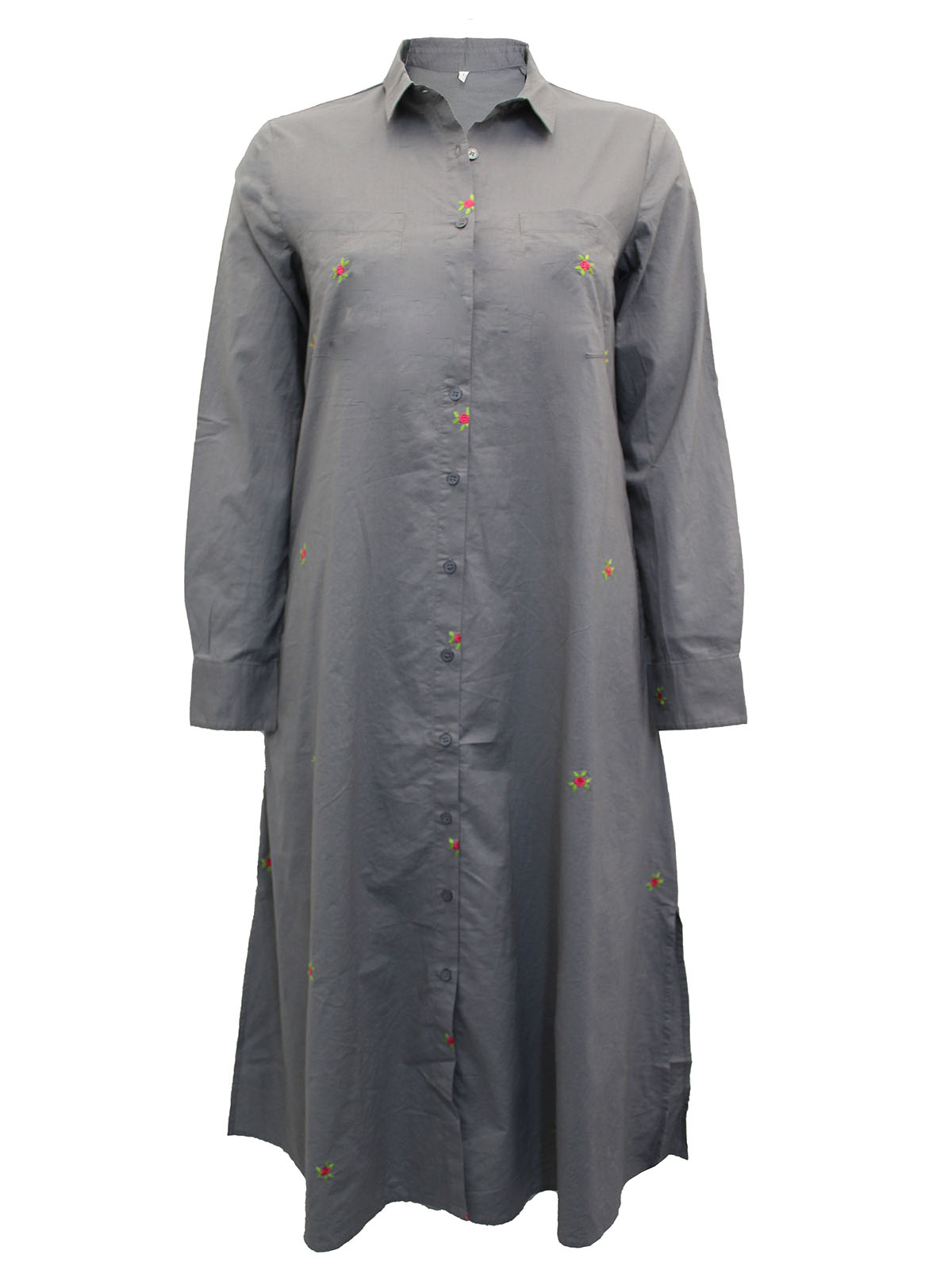 Spring your style to life with rose embroidered dress. Full of delicate details and rose embroidering, you'll love wearing this frock. Other details that make it unique are the button-up front, long sleeves and multiple pockets. Length 46in.