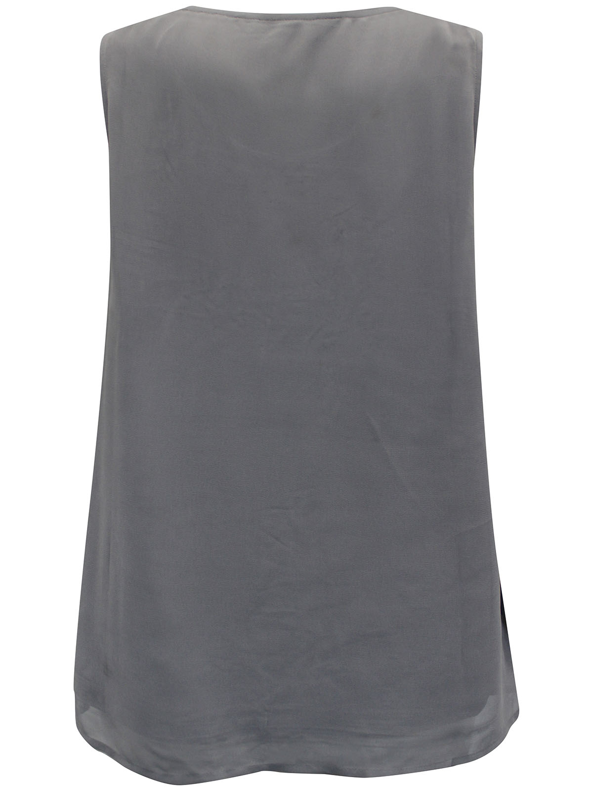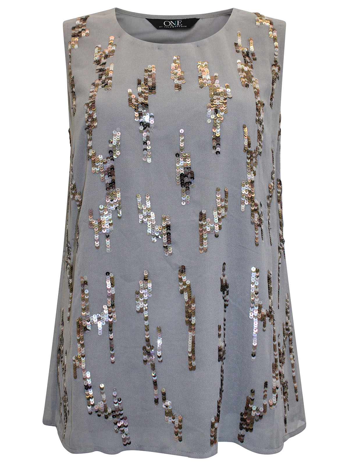 Designed in a sophisticated sleeveless style this piece has a flattering scoop neck. Cut from a smooth, woven fabric this top is finished with sparkling, sequin detailing. Length 27in.