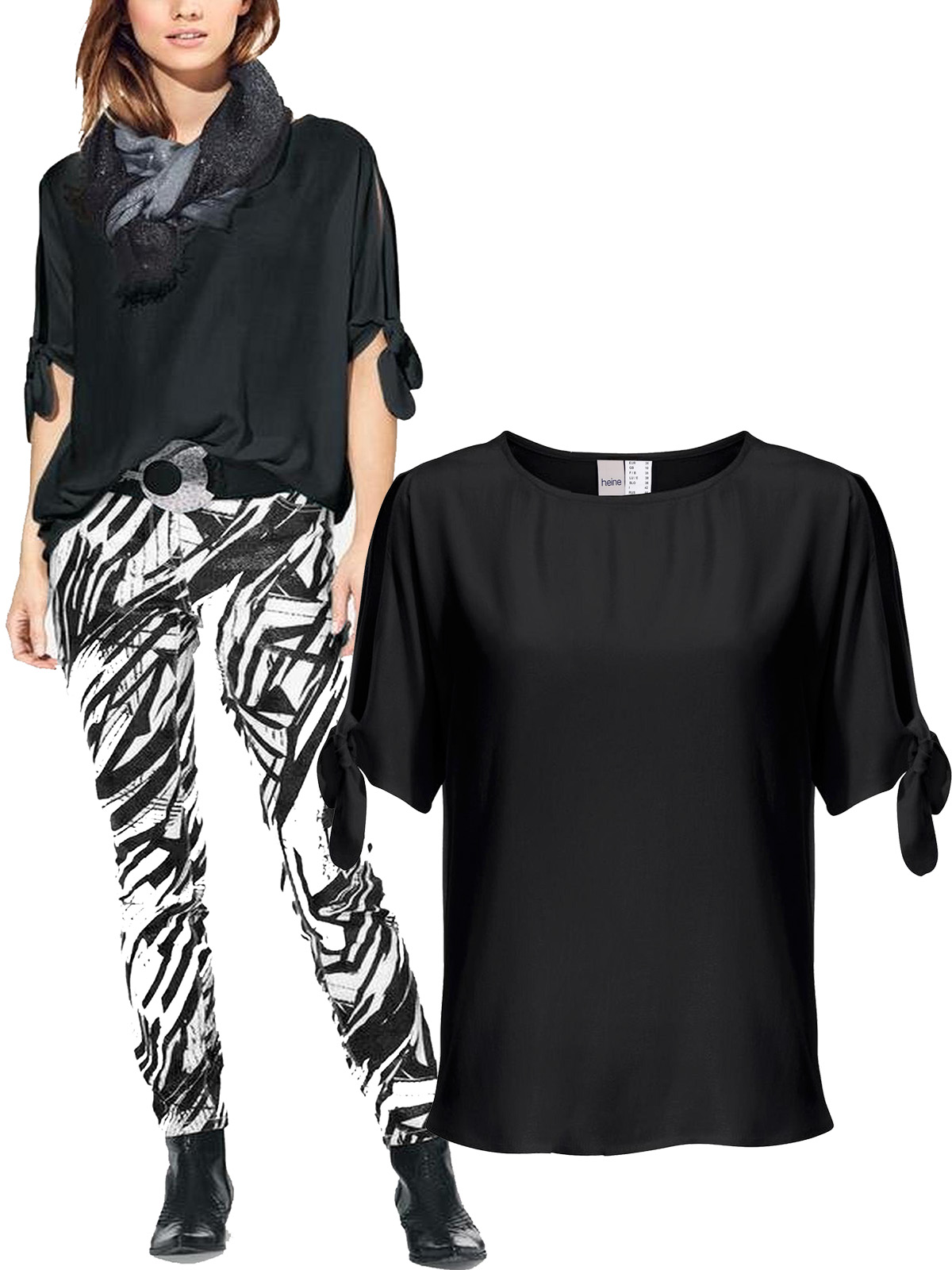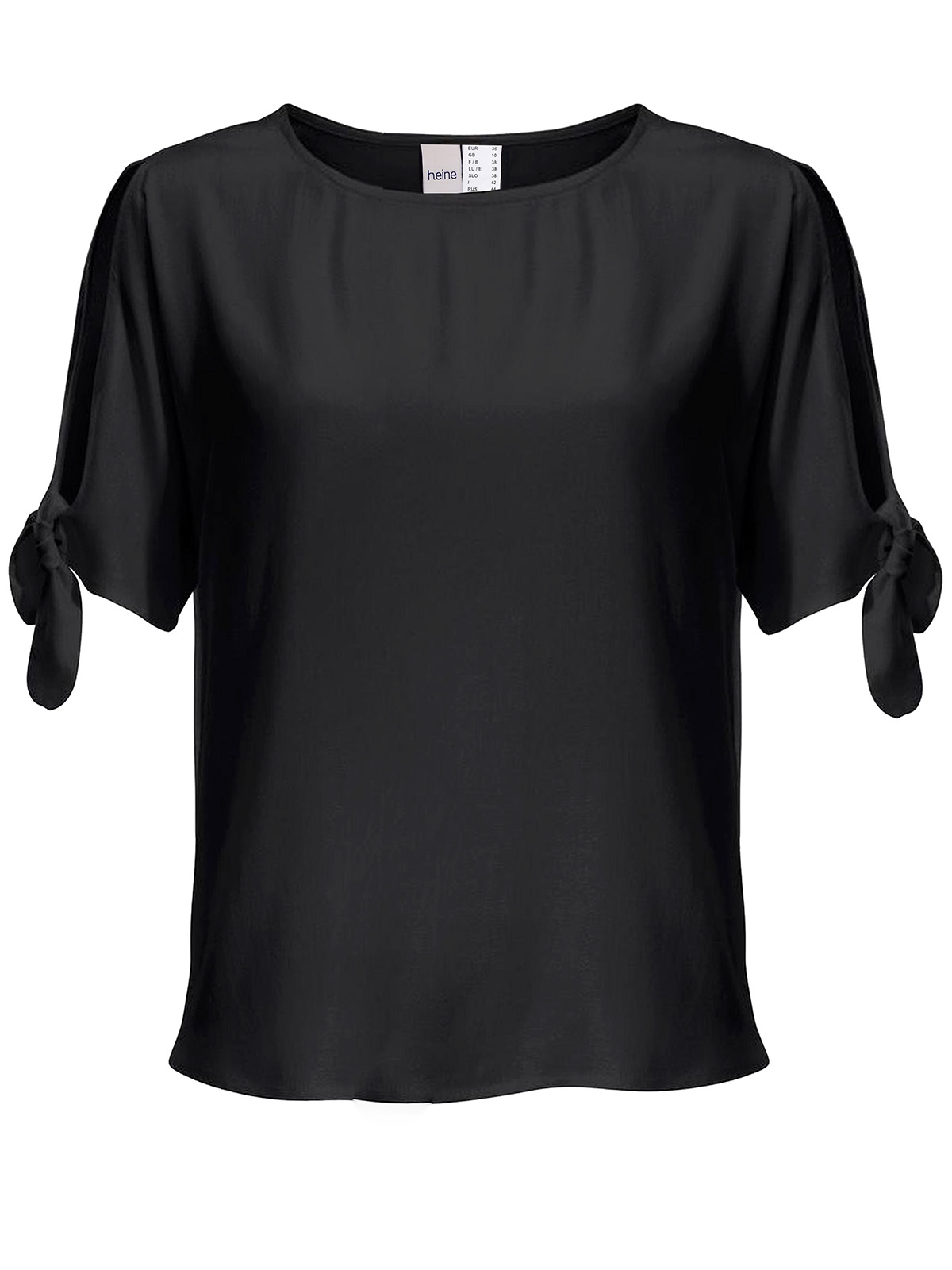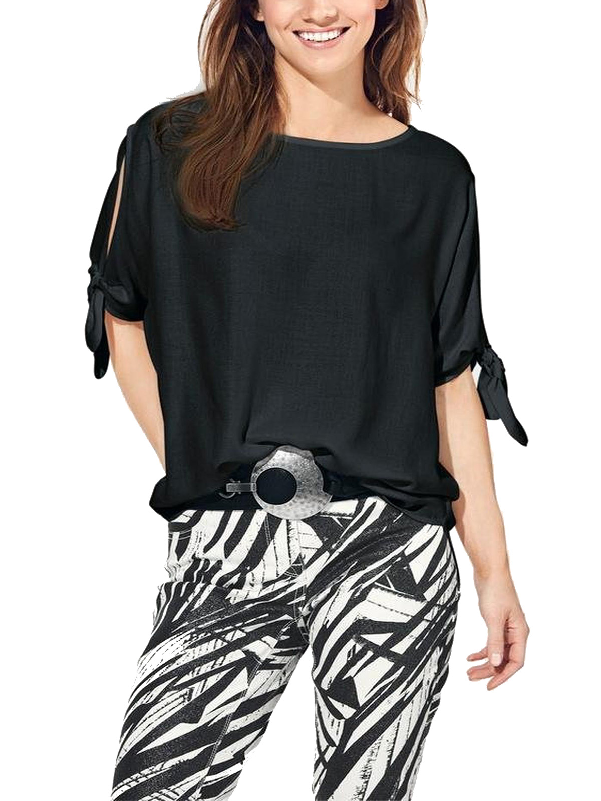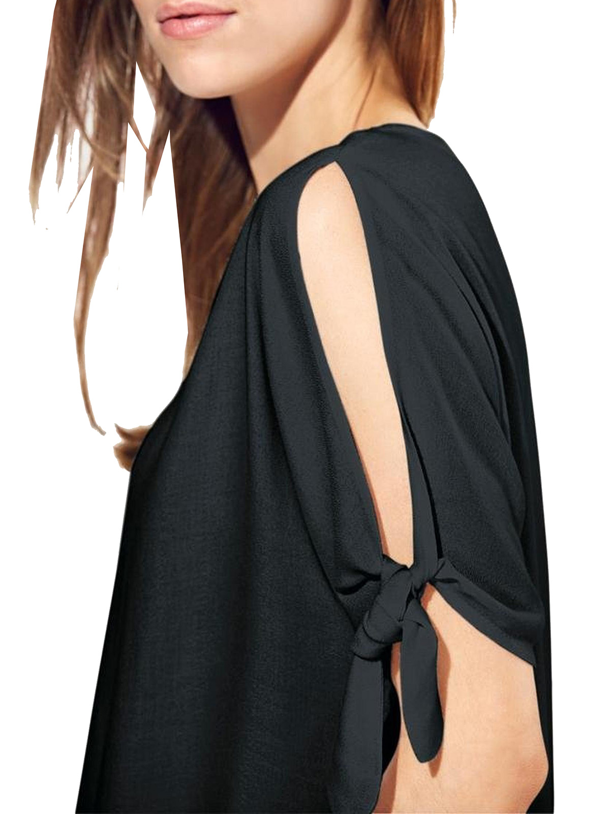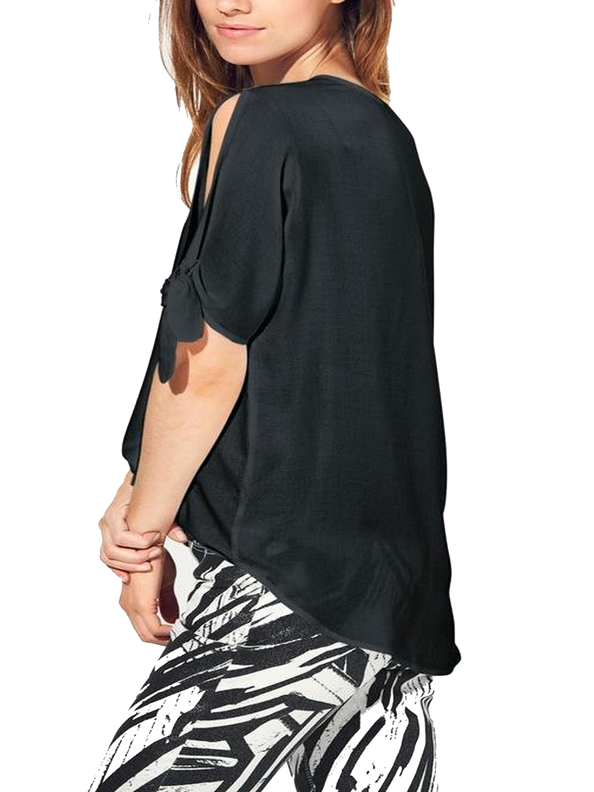 Try a fresh take on the cold shoulder trend with this tie sleeve top. Featuring a scoop neckline and half length sleeves and a dipped hem. Length 24.5in at shortest and 26.5in at longest.