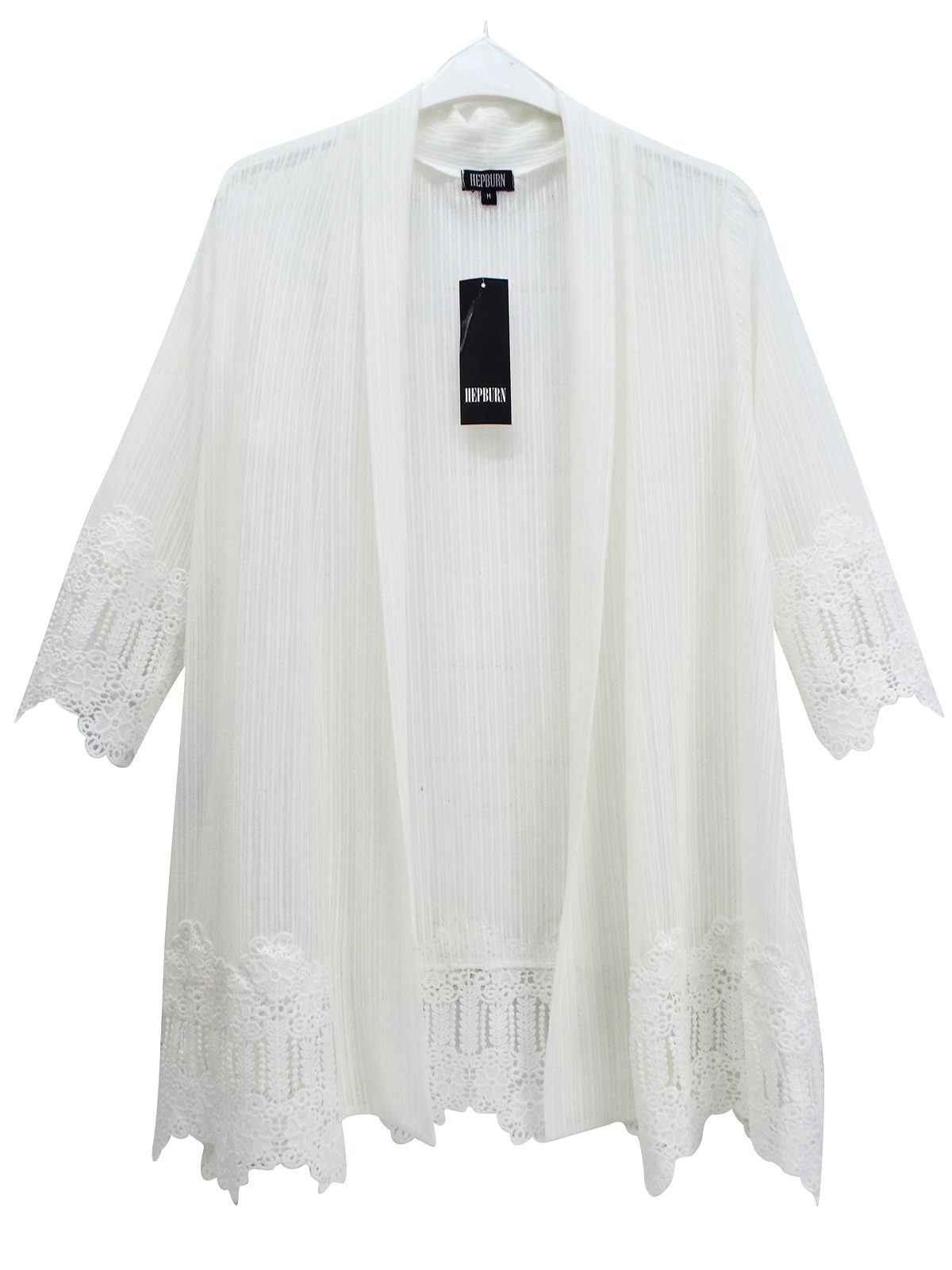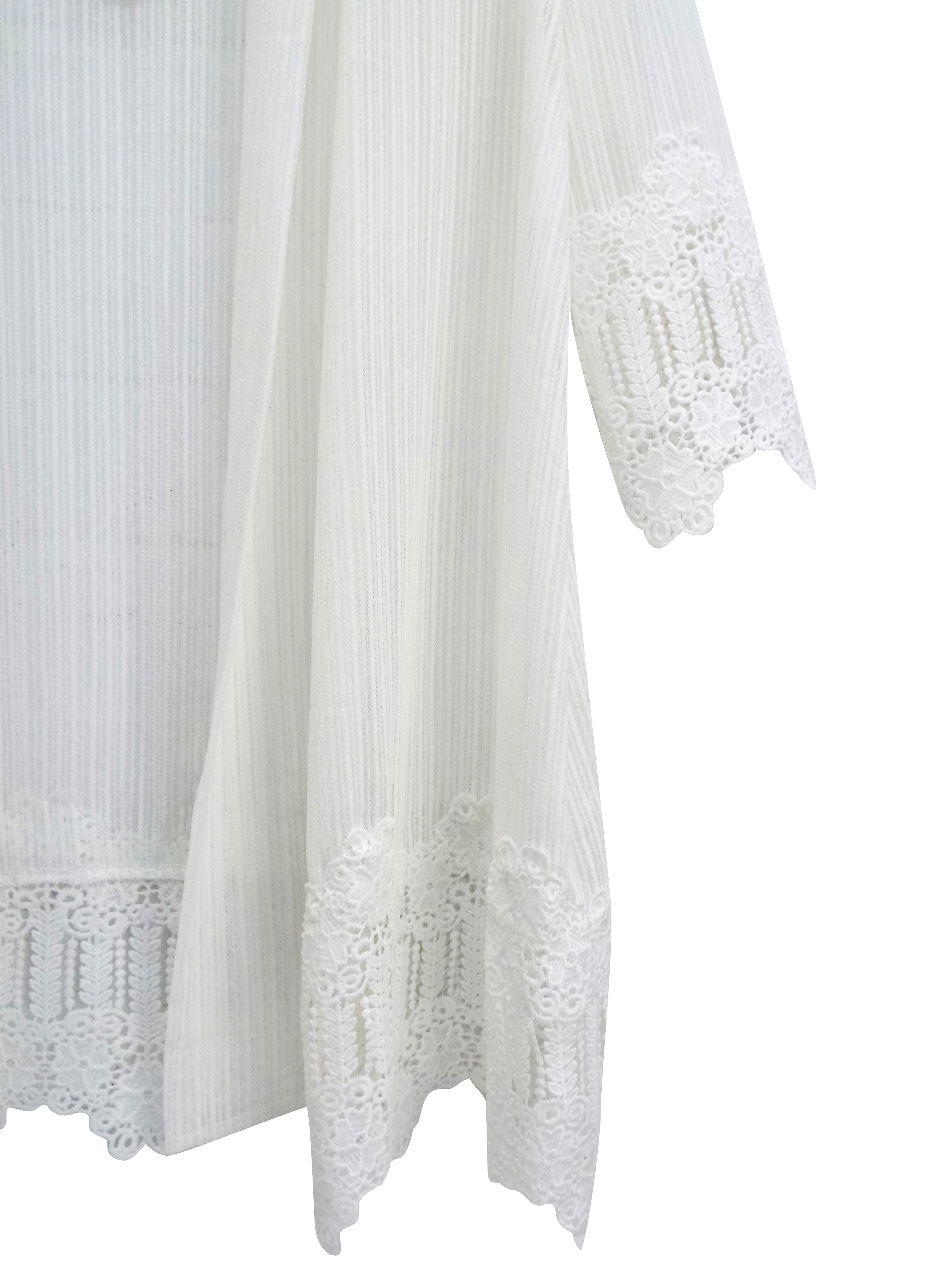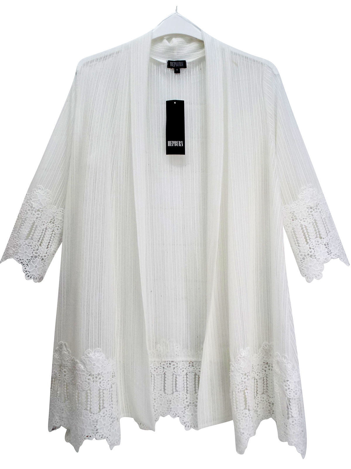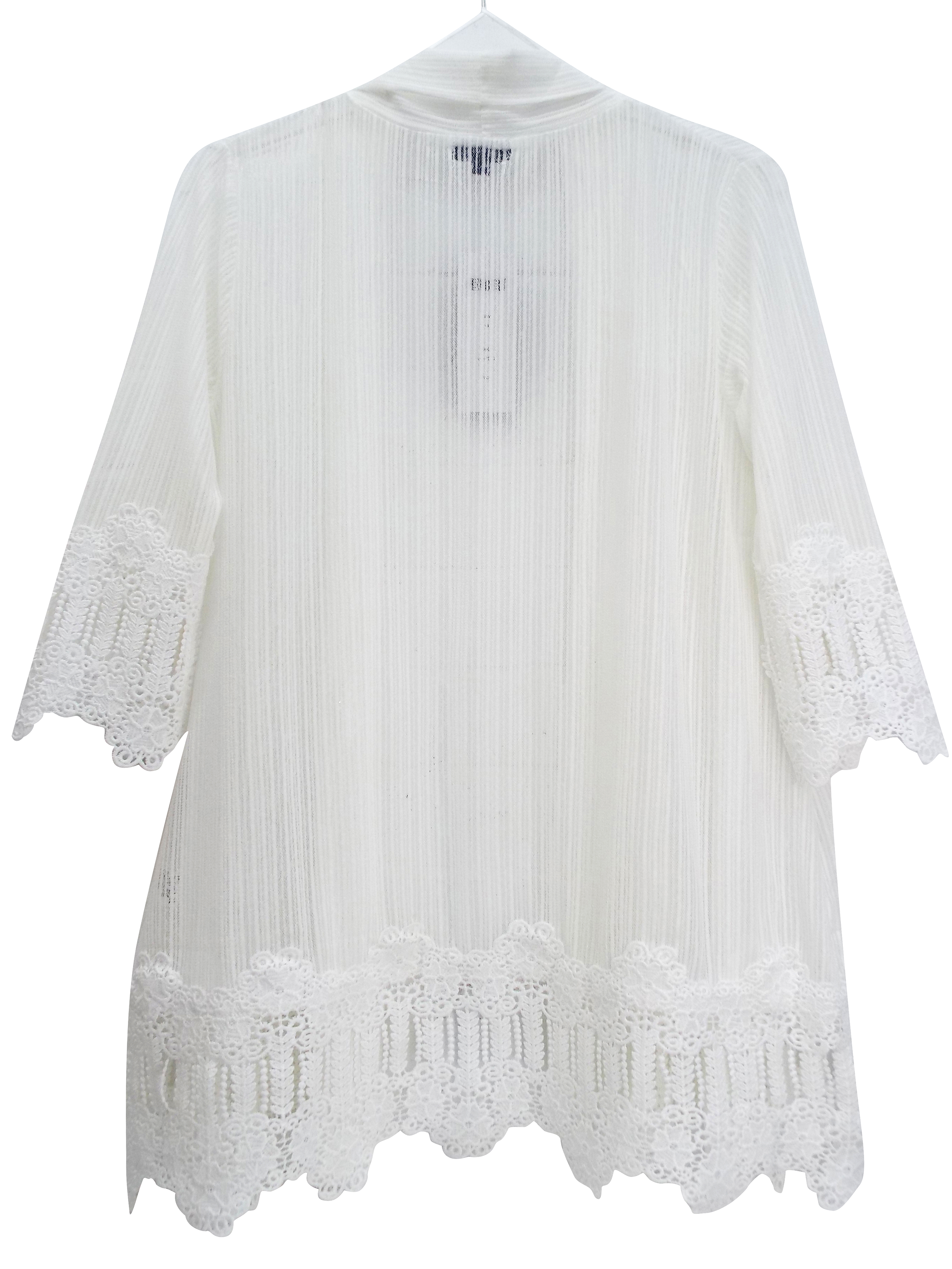 This classic cardigan is a must have in your capsule wardrobe. Crafted from a striped lace fabric with an open front and flattering 3/4 length sleeves. Crochet panels at the cuffs and hem. Length 31in