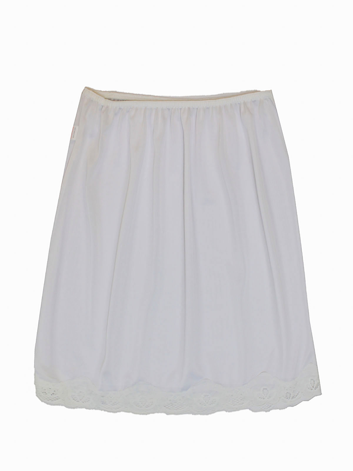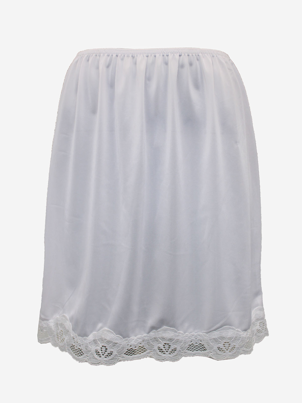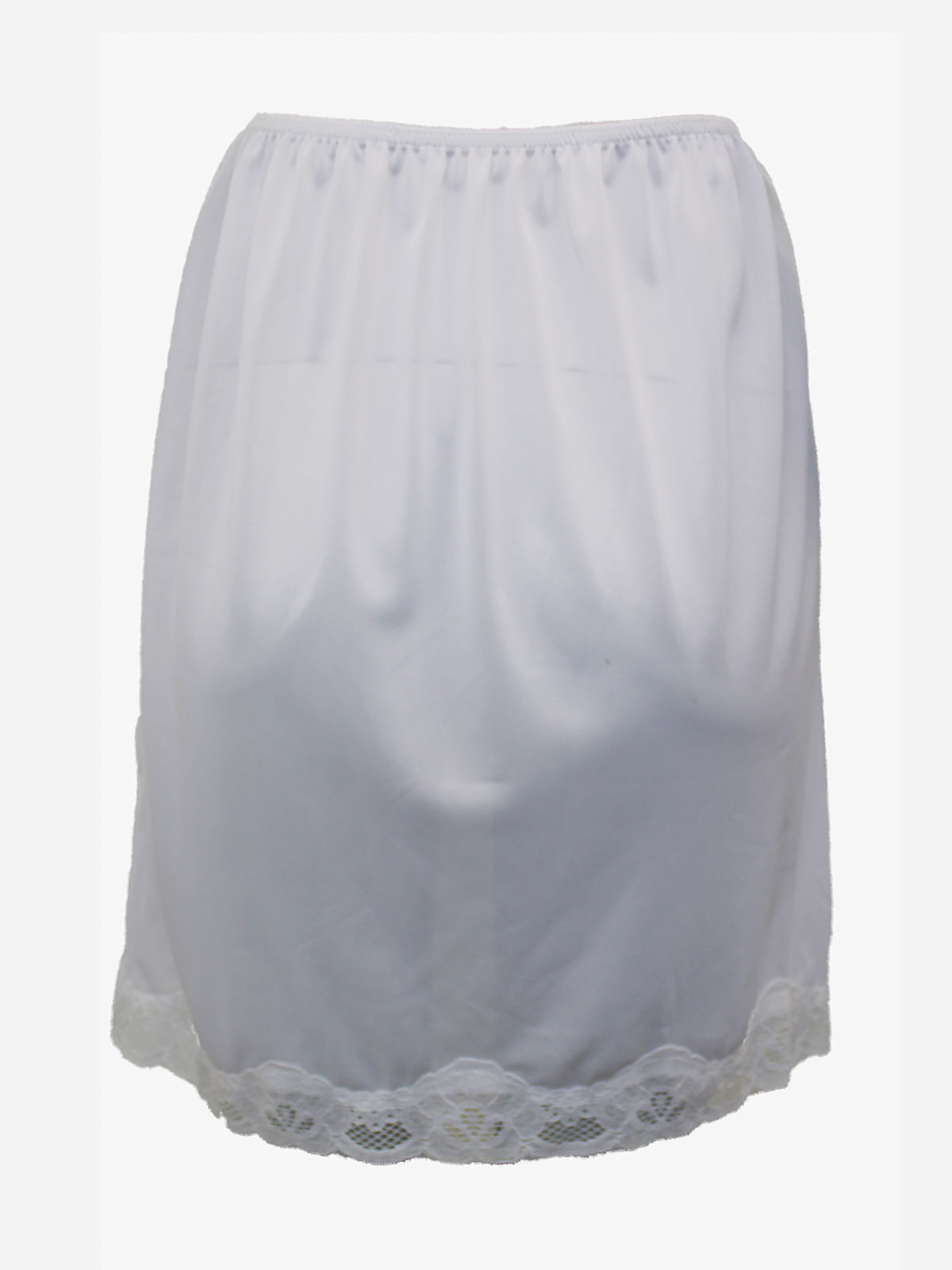 The perfect way to create modesty under outfits. Made in a comfortable and smooth fabric, with lace detail for an extra feminine touch. Lengths 18in. Irregular; small marks, stians.