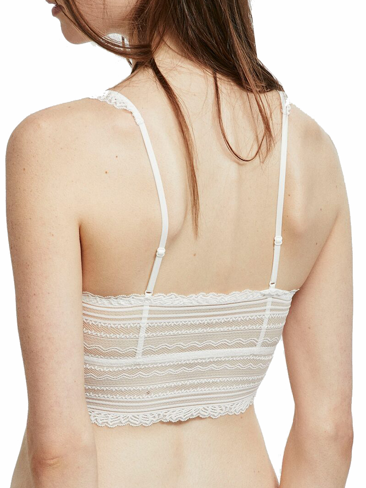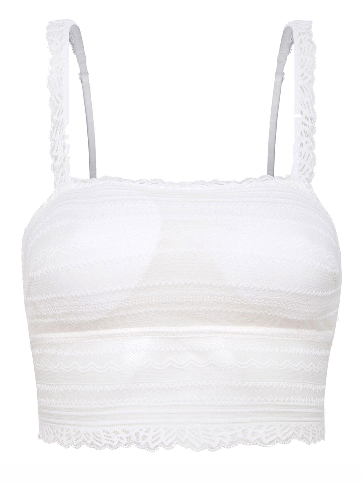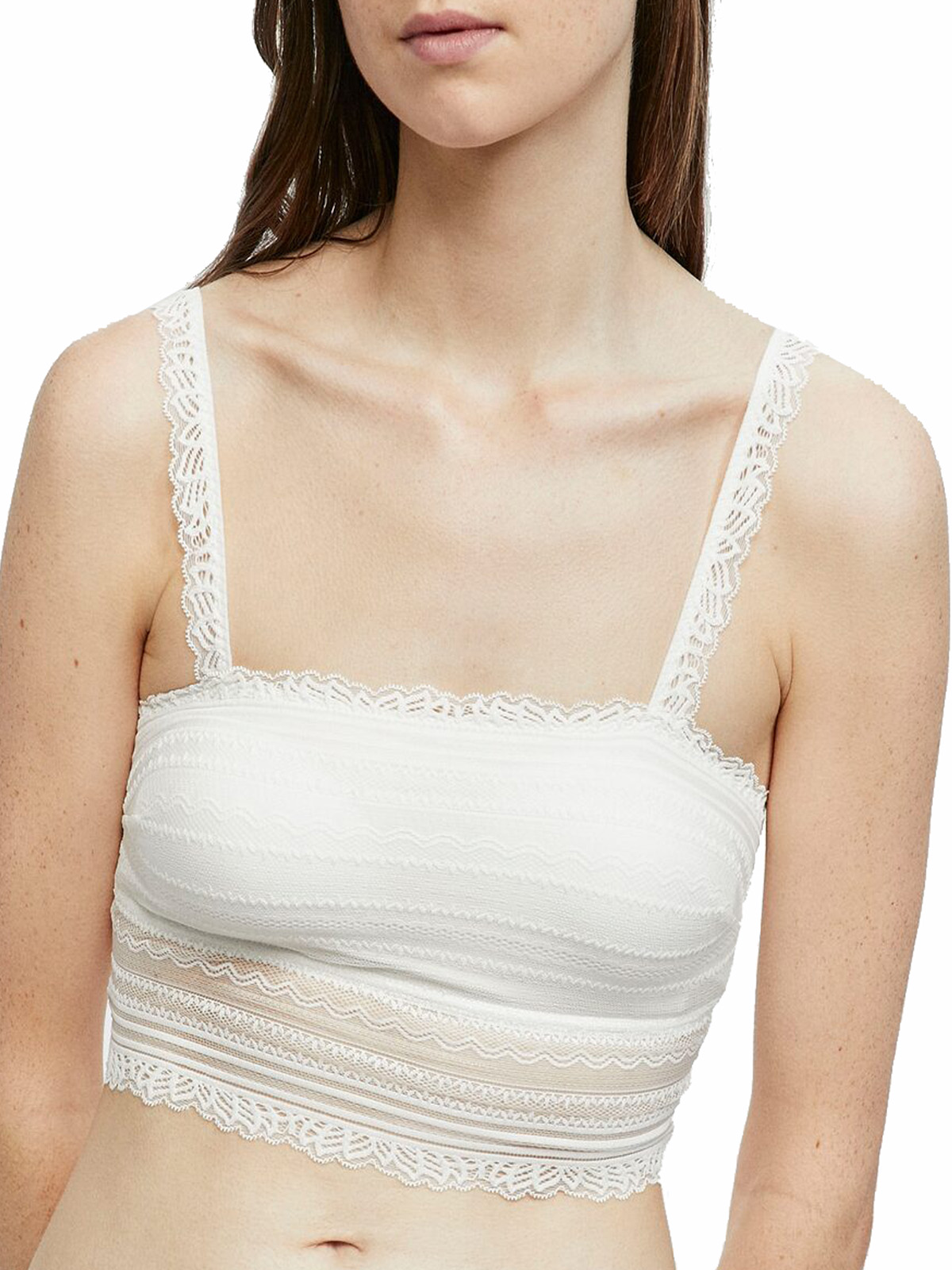 Scalloped lace beautifully overlays this non-wired bandeau bra with removable padding. This bra is easy to wear and super comfortable and stylish with very prettily finished scalloped edged straps.