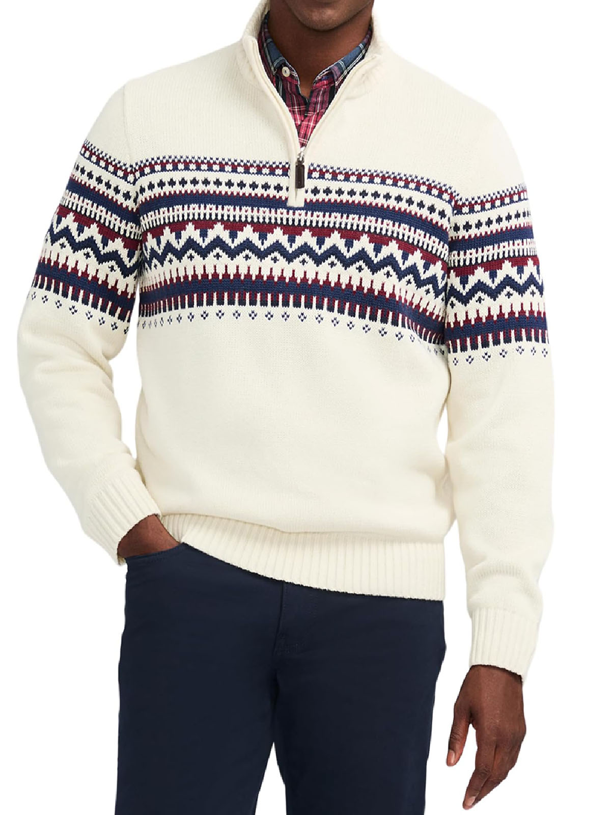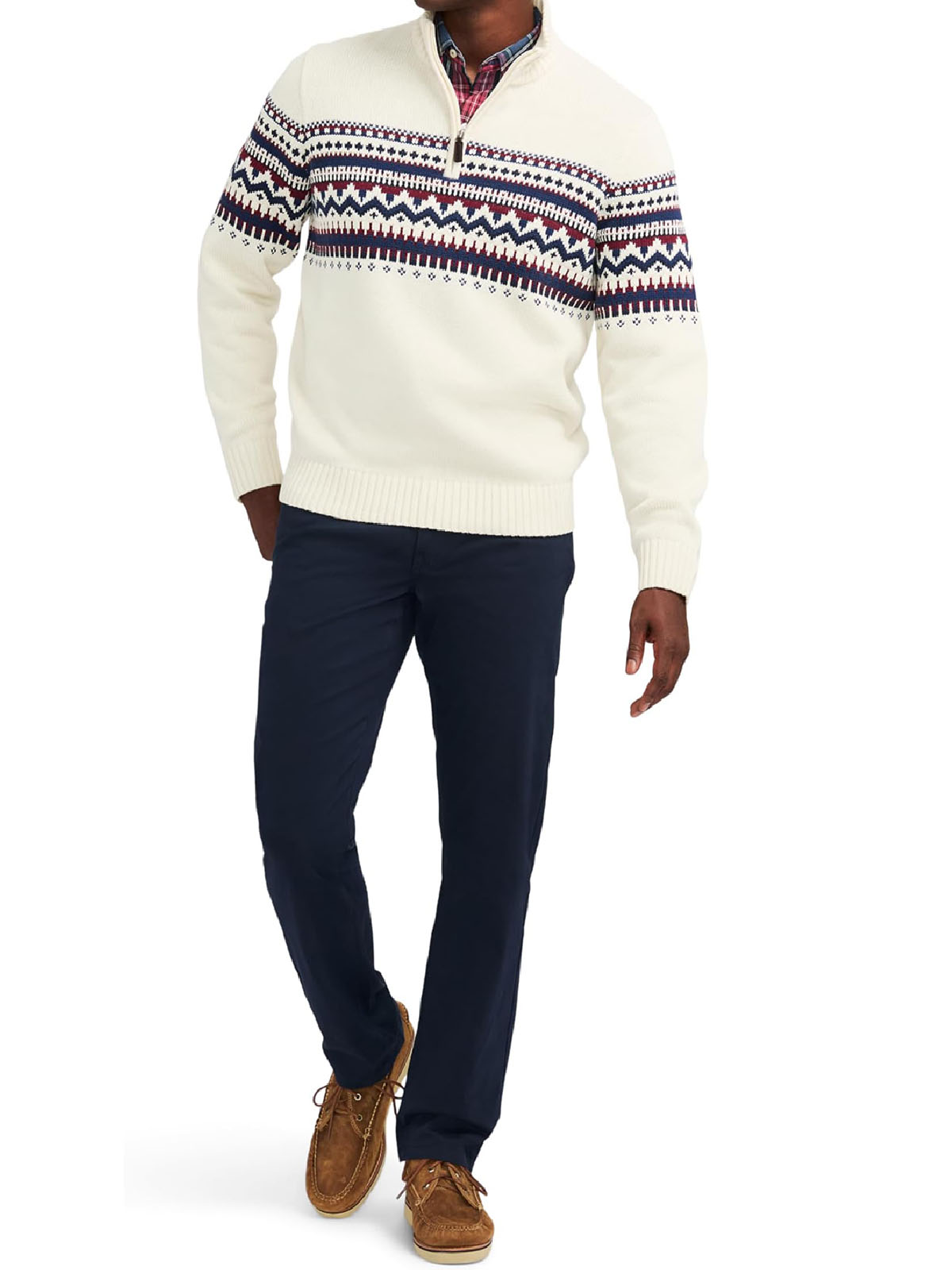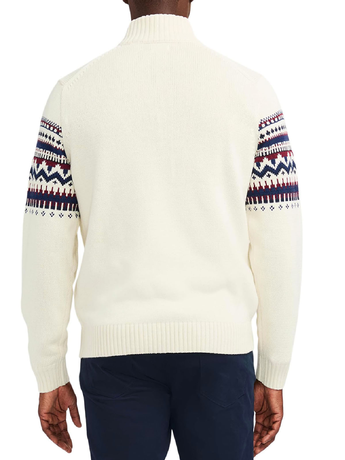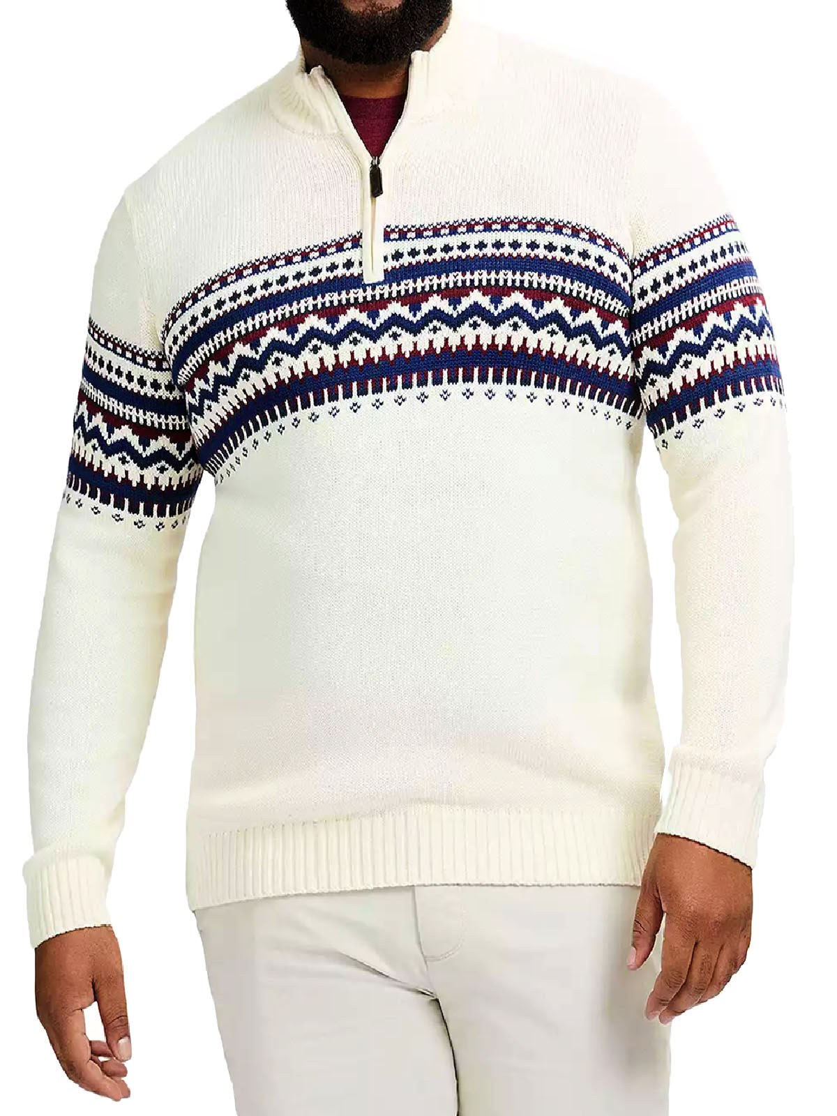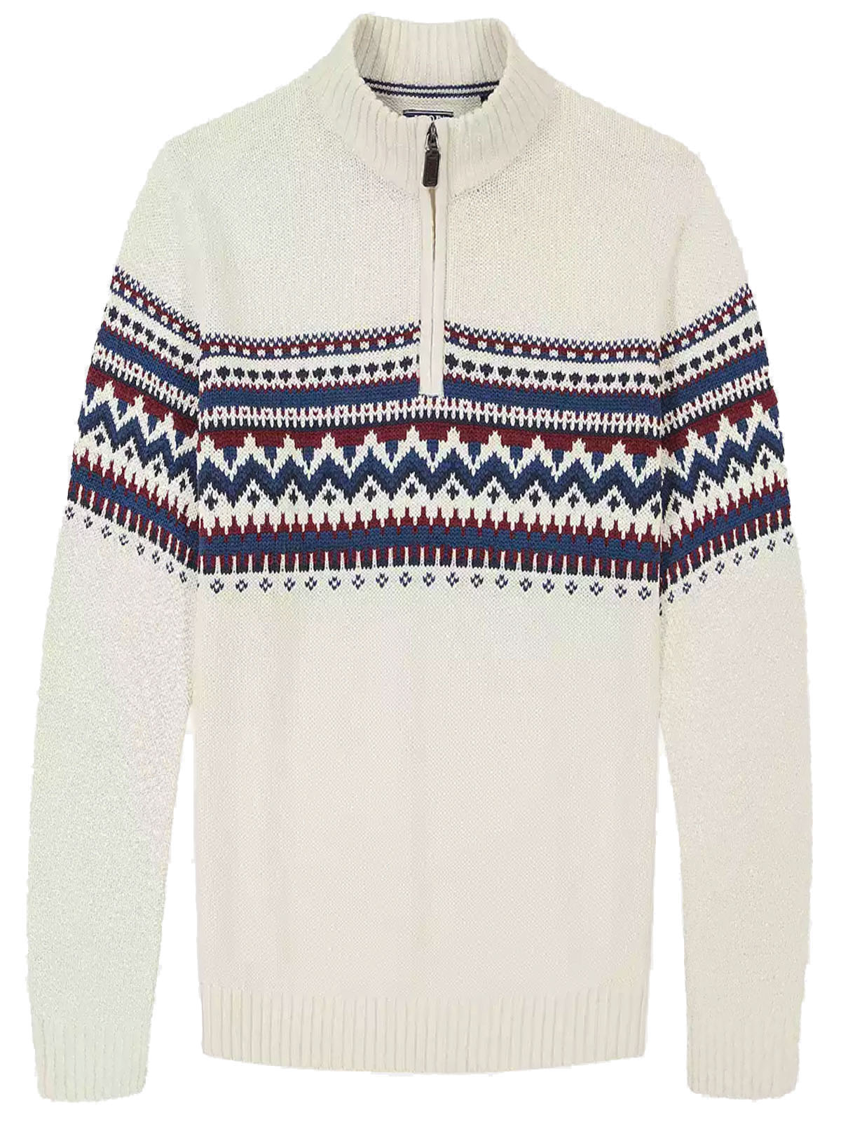 This mens jumper comes in a timeless quarter zip style. Designed with a Fairisle pattern, adding seasonal style to your winter weekday outfits. Featuring a funnel neck with quarter zip fastening, long sleeves and ribbed trims. Lengths; T-30in, B-28in.