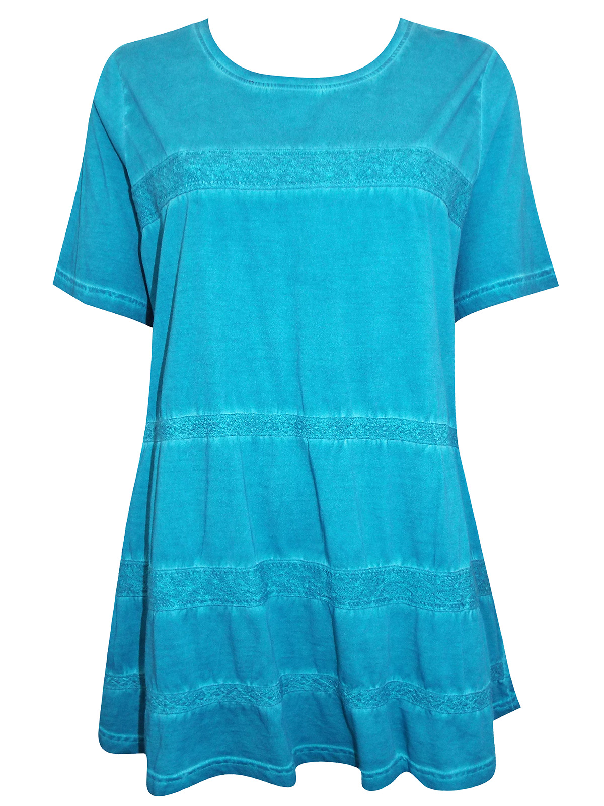 This top is set to be your new go-to for casual everyday style. Crafted from a pure cotton fabric, featuring a scoop neckline with crochet stripe and short sleeves. Length 31in.