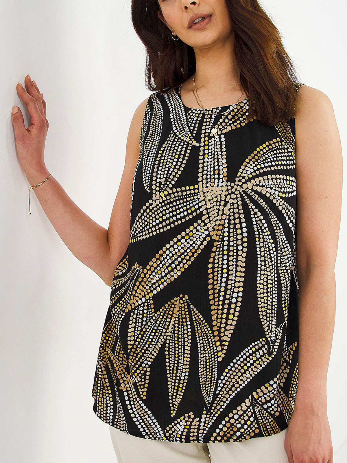 Look great in this sleeveless crinkle blouse. The top is fashioned from a crinkled viscose fabric, no ironing required making it the perfect outfit to pack in a suitcase. Length 27in/69cm.