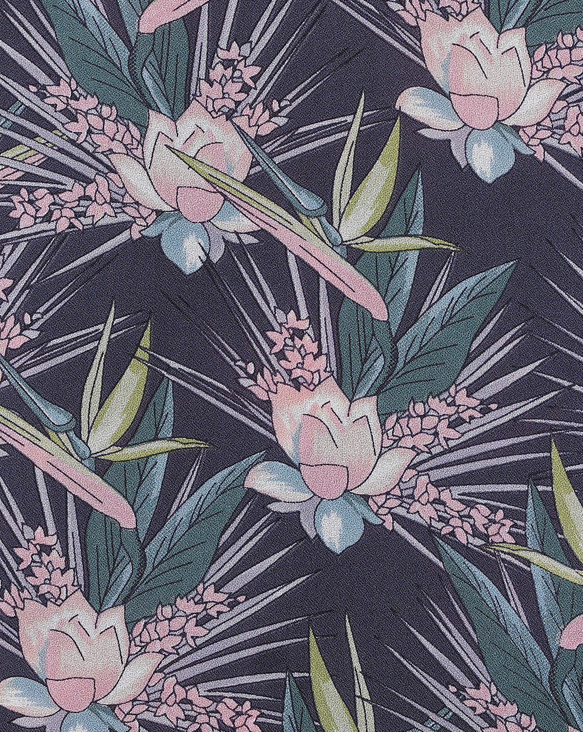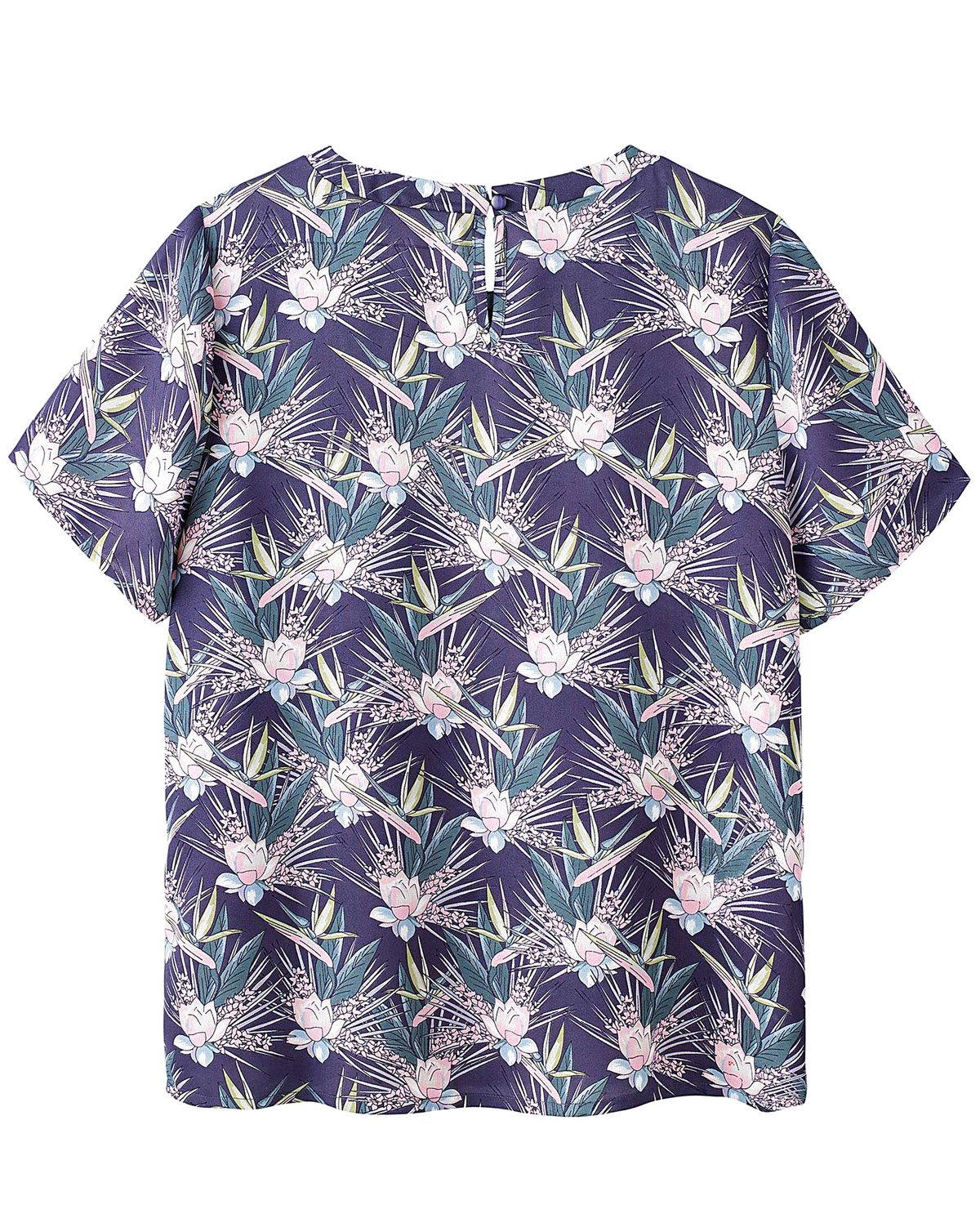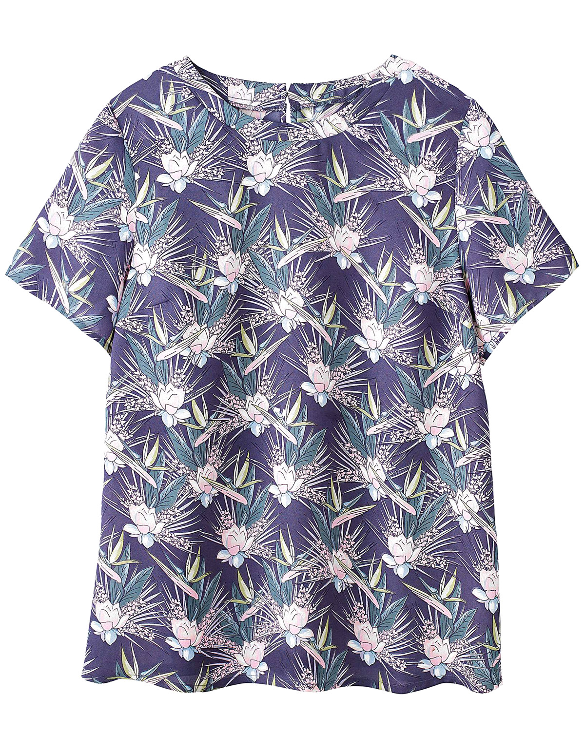Exotic tropical print shell top fashioned from a textured crepe fabric in a lush print, this stylish day top features short sleeves and a flattering round neckline. Length 25in/64cm.