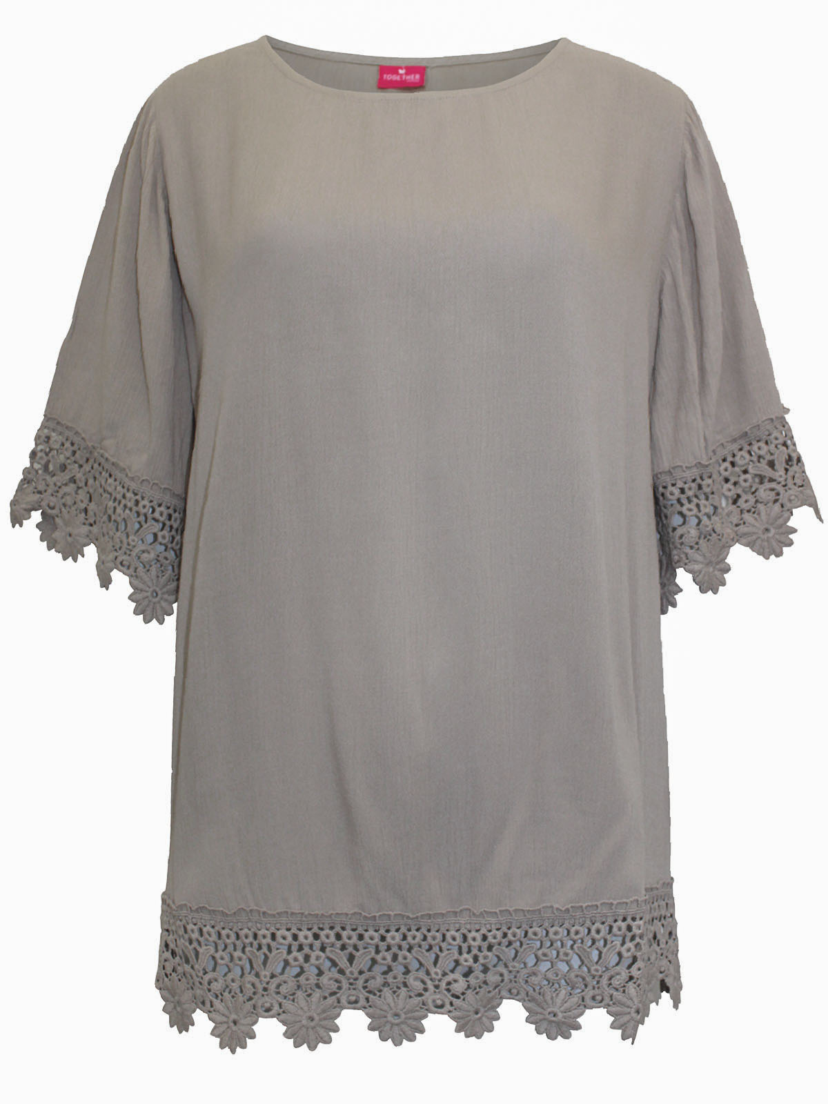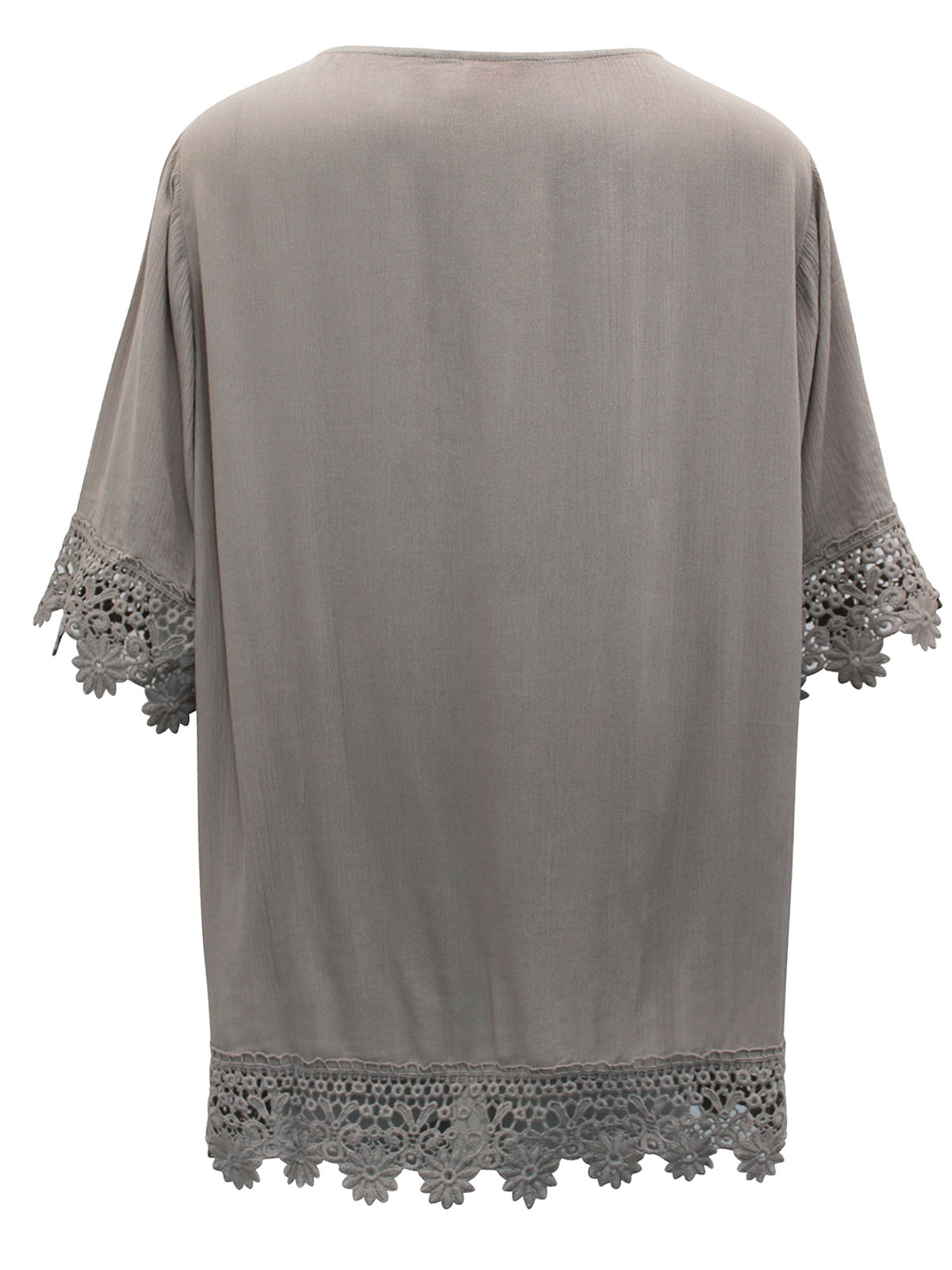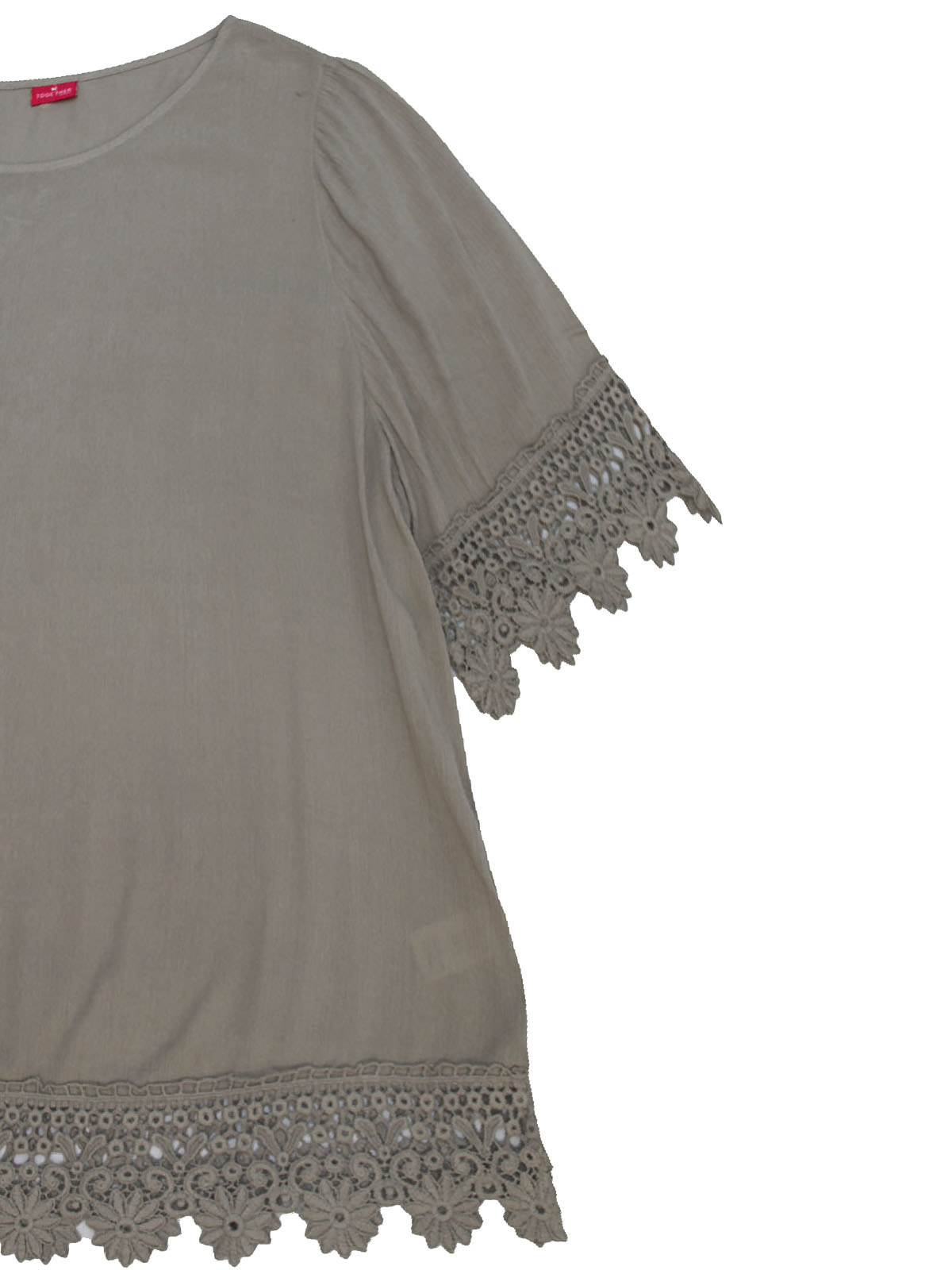 Does your top collection need a refresh? Made in a comfortable crinkle fabric, it features a scoop neckline, short sleeves, and crochet detailing to the neckline and cuffs. Length 26in.