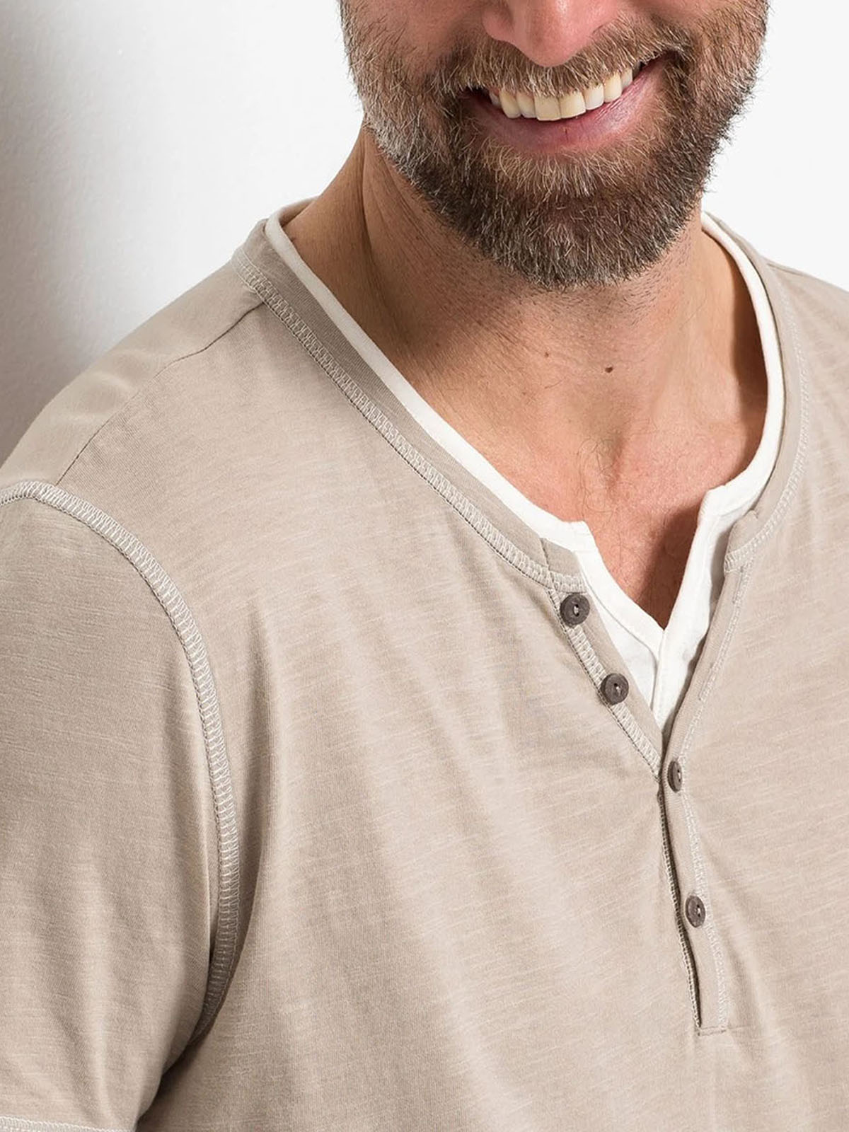 In a latte hue, this soft cotton top is so comfy and versatile. In a mock layered design with a notch neckline, button placket and short sleeves. Length 28in.