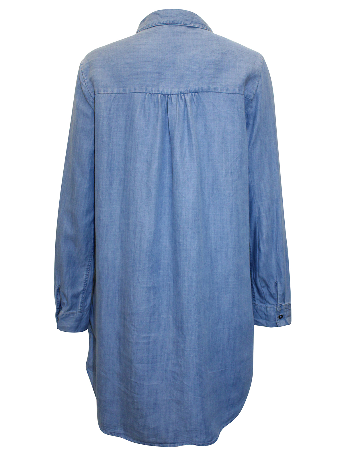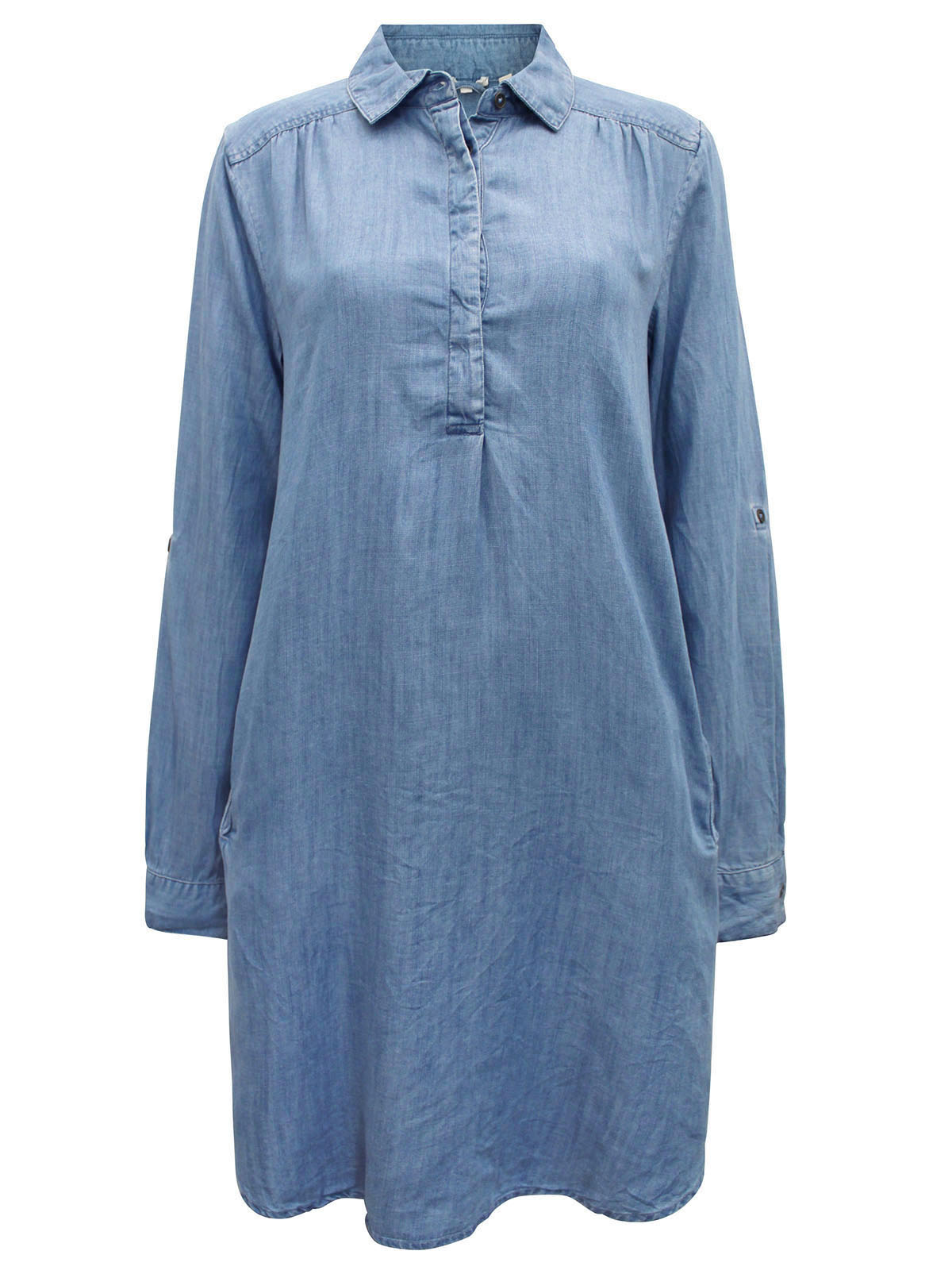 Cut to a shirt shape with a floaty curved hem, this midi dress complements patterned accessories with its plain design. Framed with a smart collar and long sleeves that you can turn up and secure with a buttoned tab, this piece is a care-free option for wherever the day takes you. Length 37in.