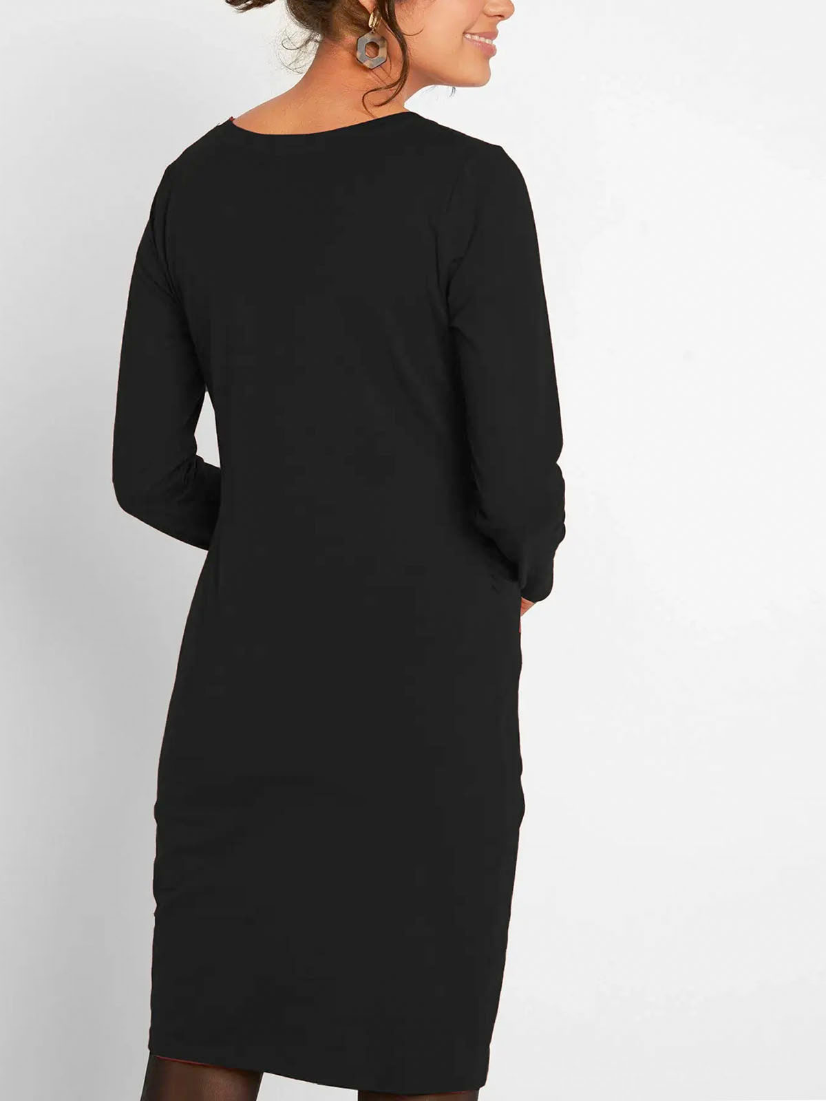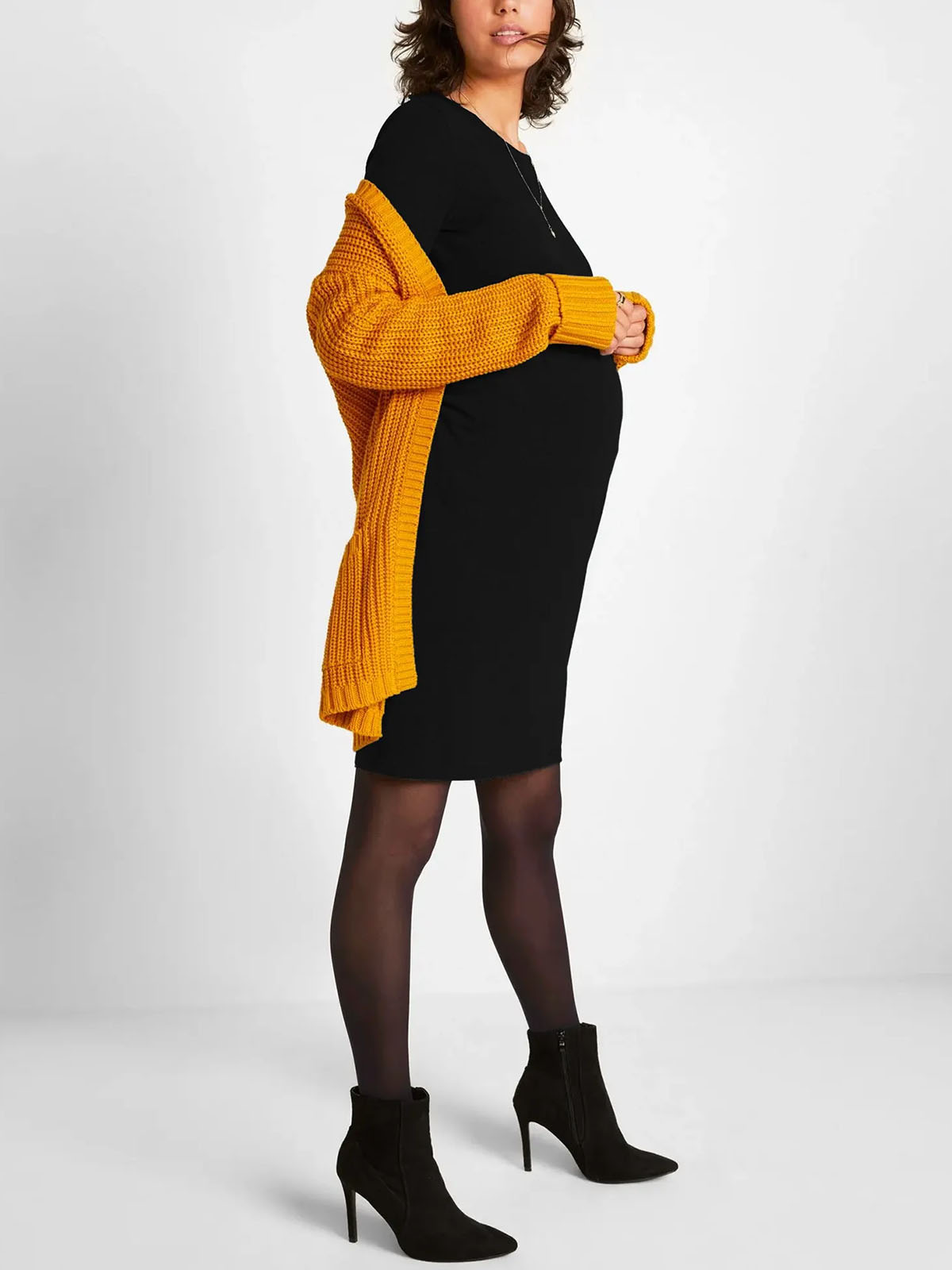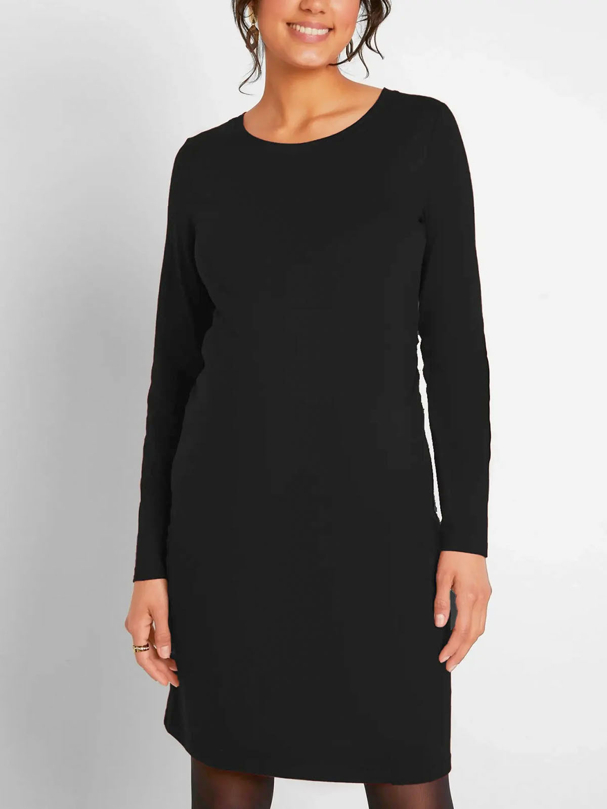 This dress will become your favorite cold-weather essential. It features a scoop neckline and long sleeves that make it a comfortable everyday dress as well as an appropriate piece for smarter occasions. The chic, classic black fabric is easy to pair with tights and boots and the waist tie adds definition to your growing bump, making it flattering at every stage of your pregnancy. Designed to fit throughout pregnancy. Length 39in.