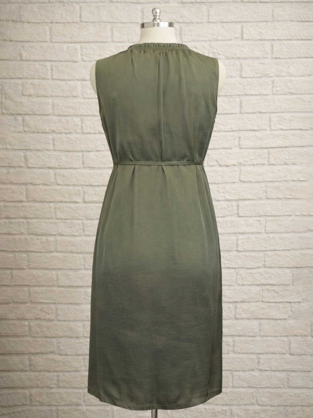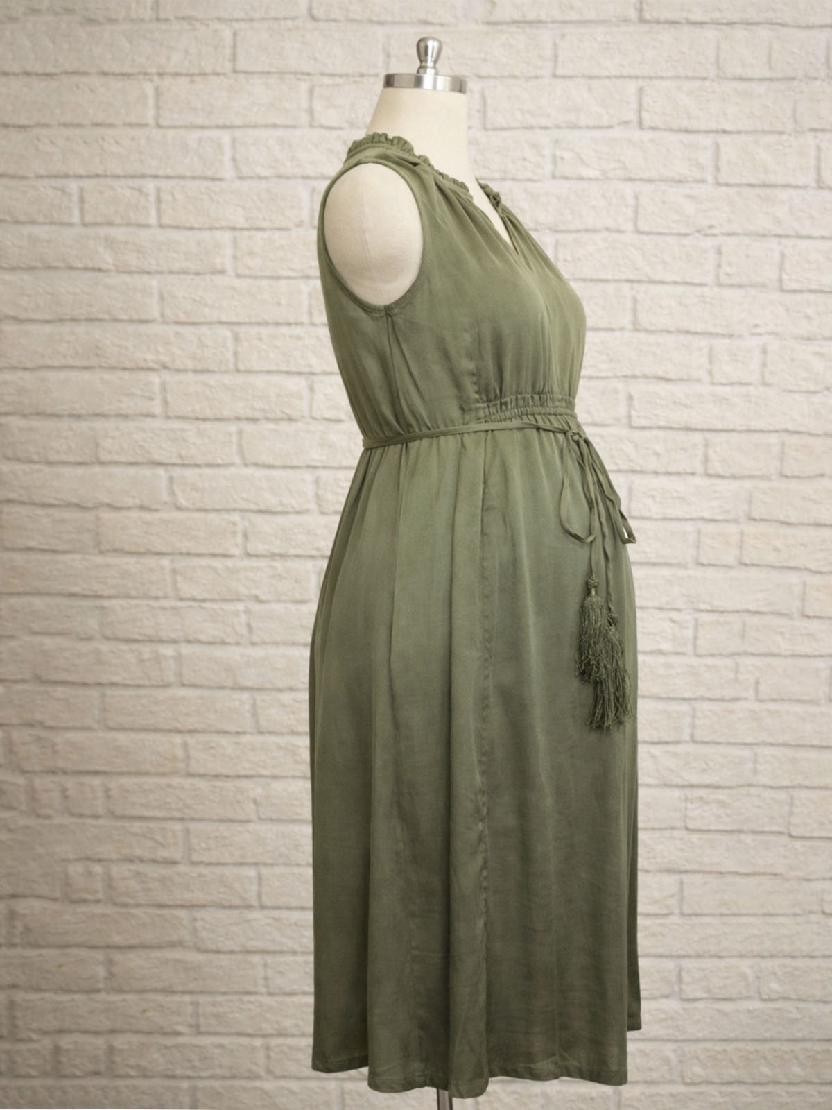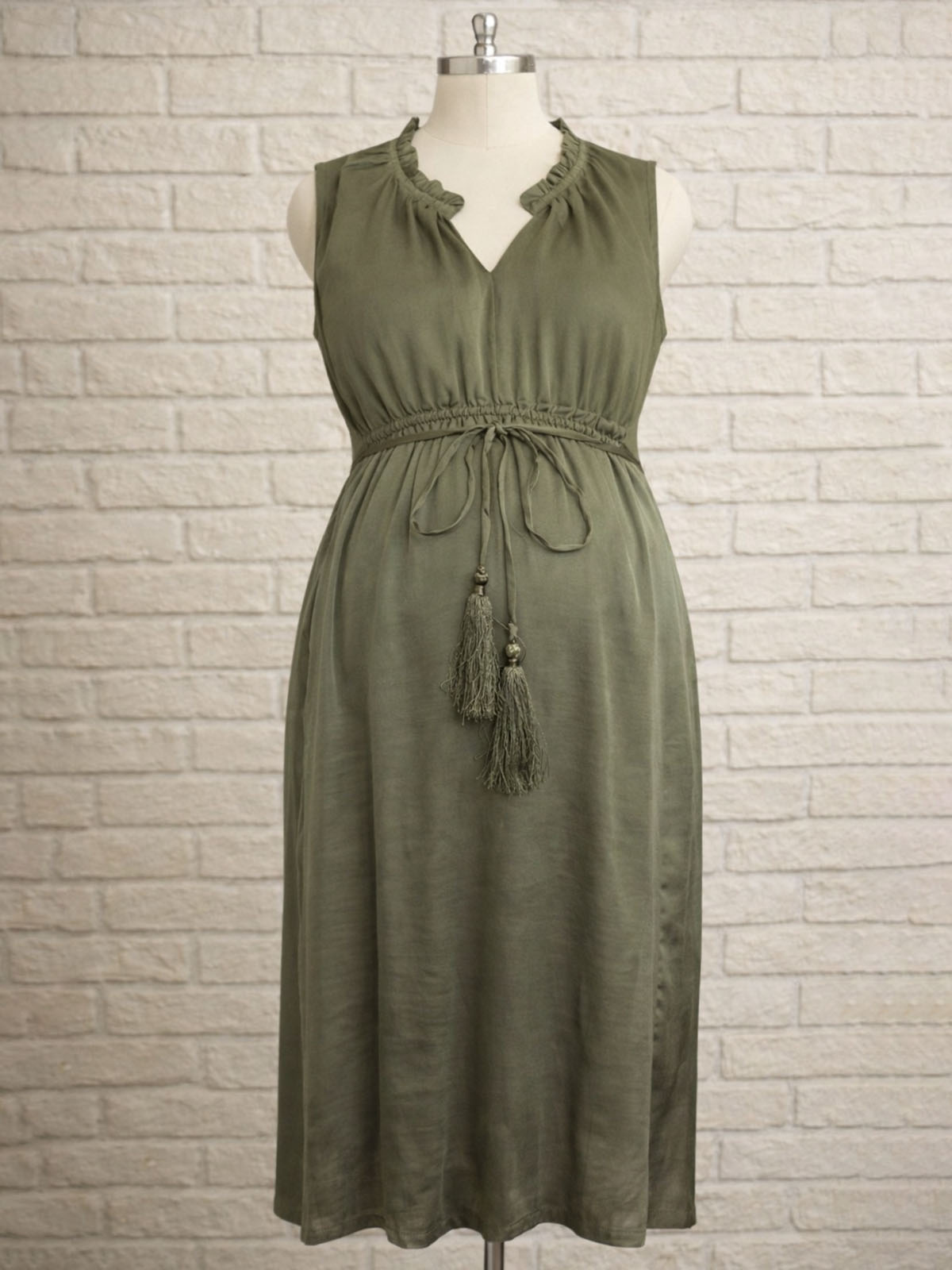 Stay stylish throughout your pregnancy with this sleeveless dress. Made from a satin fabric, it features a ruched neckline and empire line with ties to the back. Camisole lined. Length 37in at front and 39in at back.
