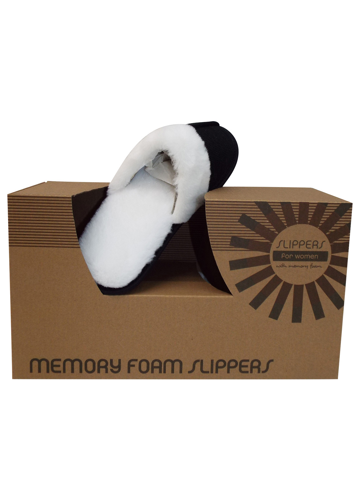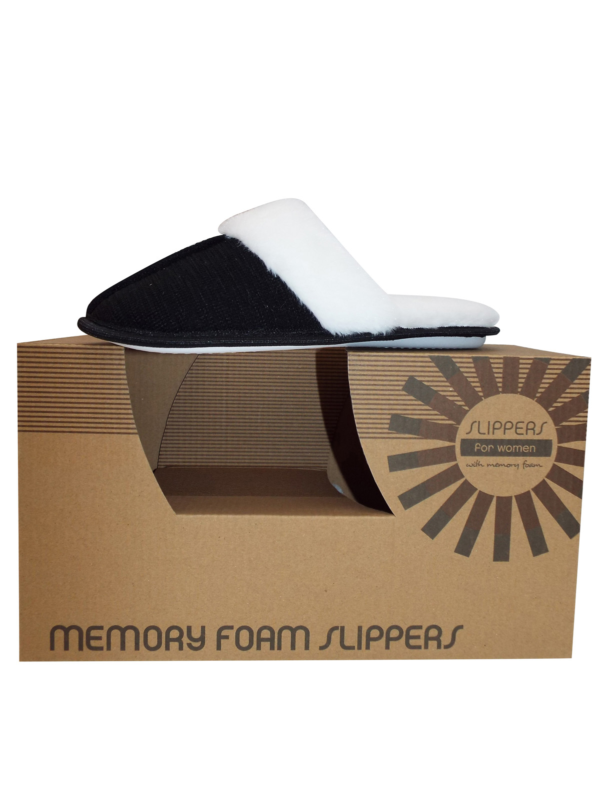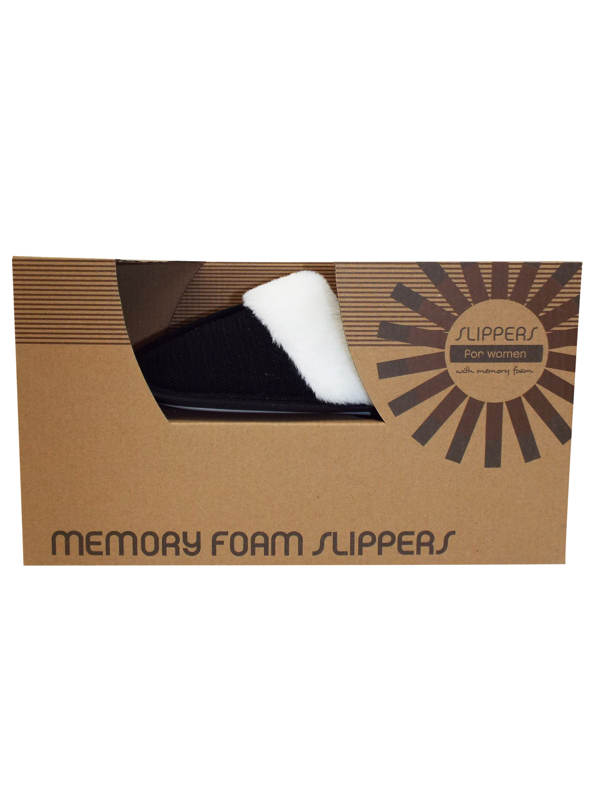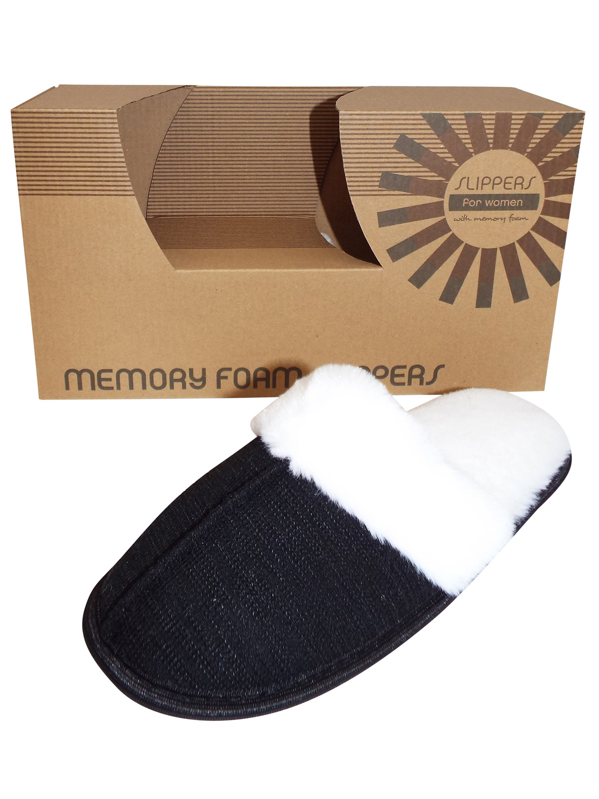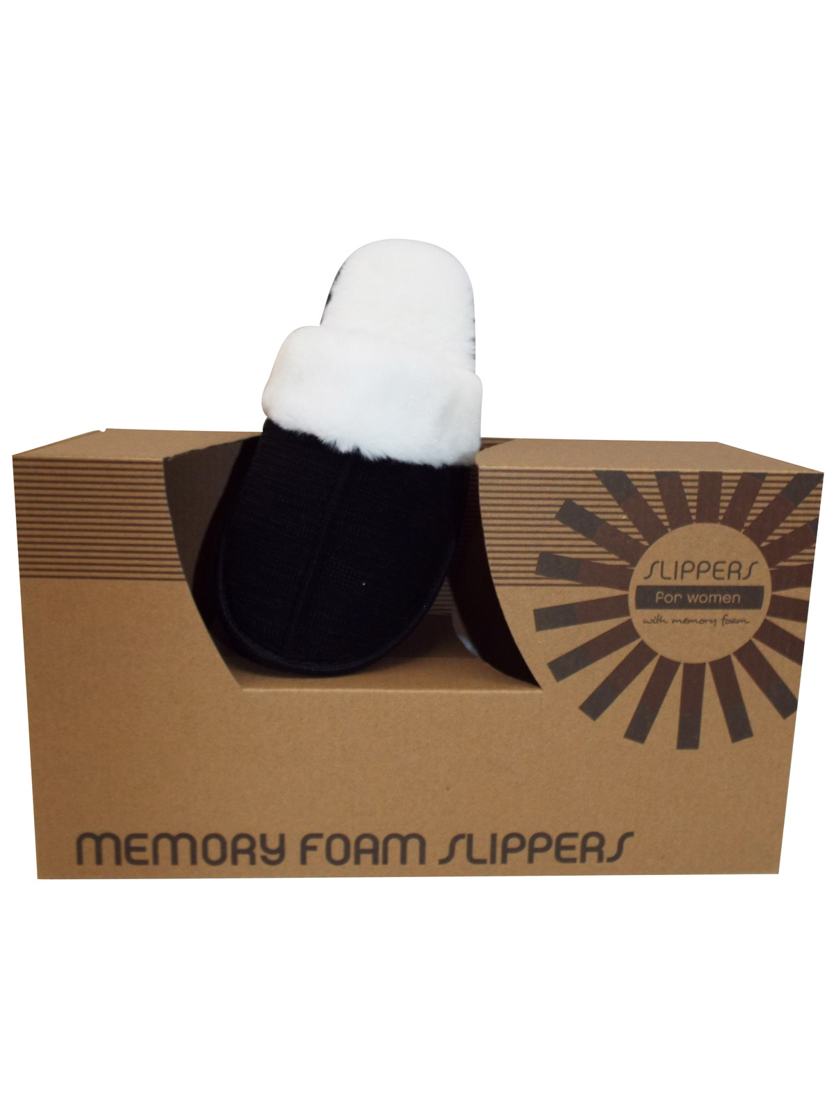 Memory Foam Slippers BLACK Open Back Knitted Fur Trim Memory Foam Slippers - Size S/M to L/XL
