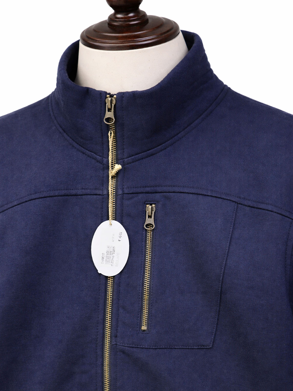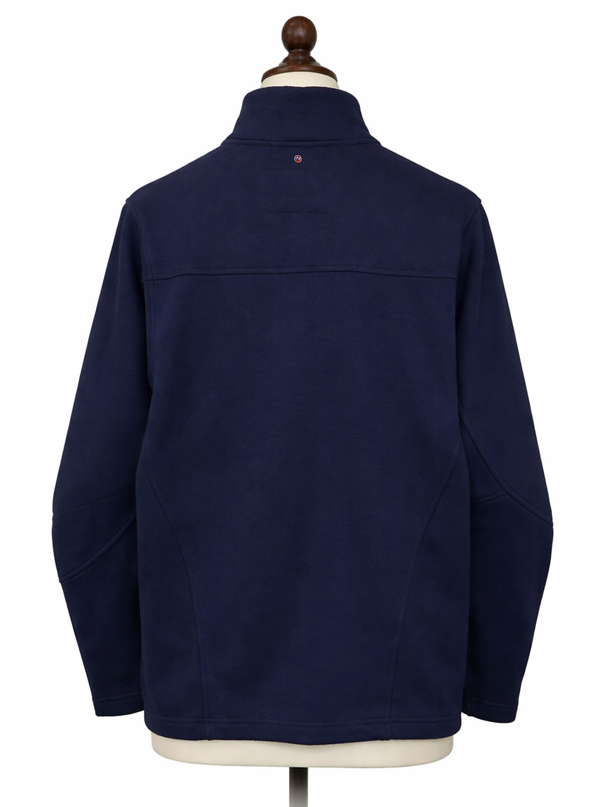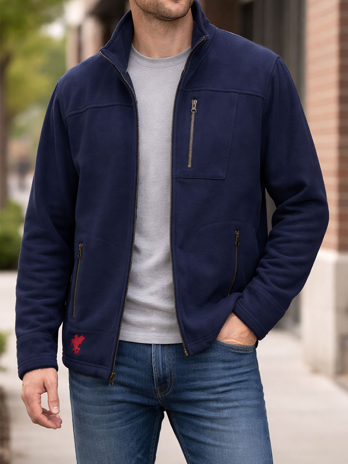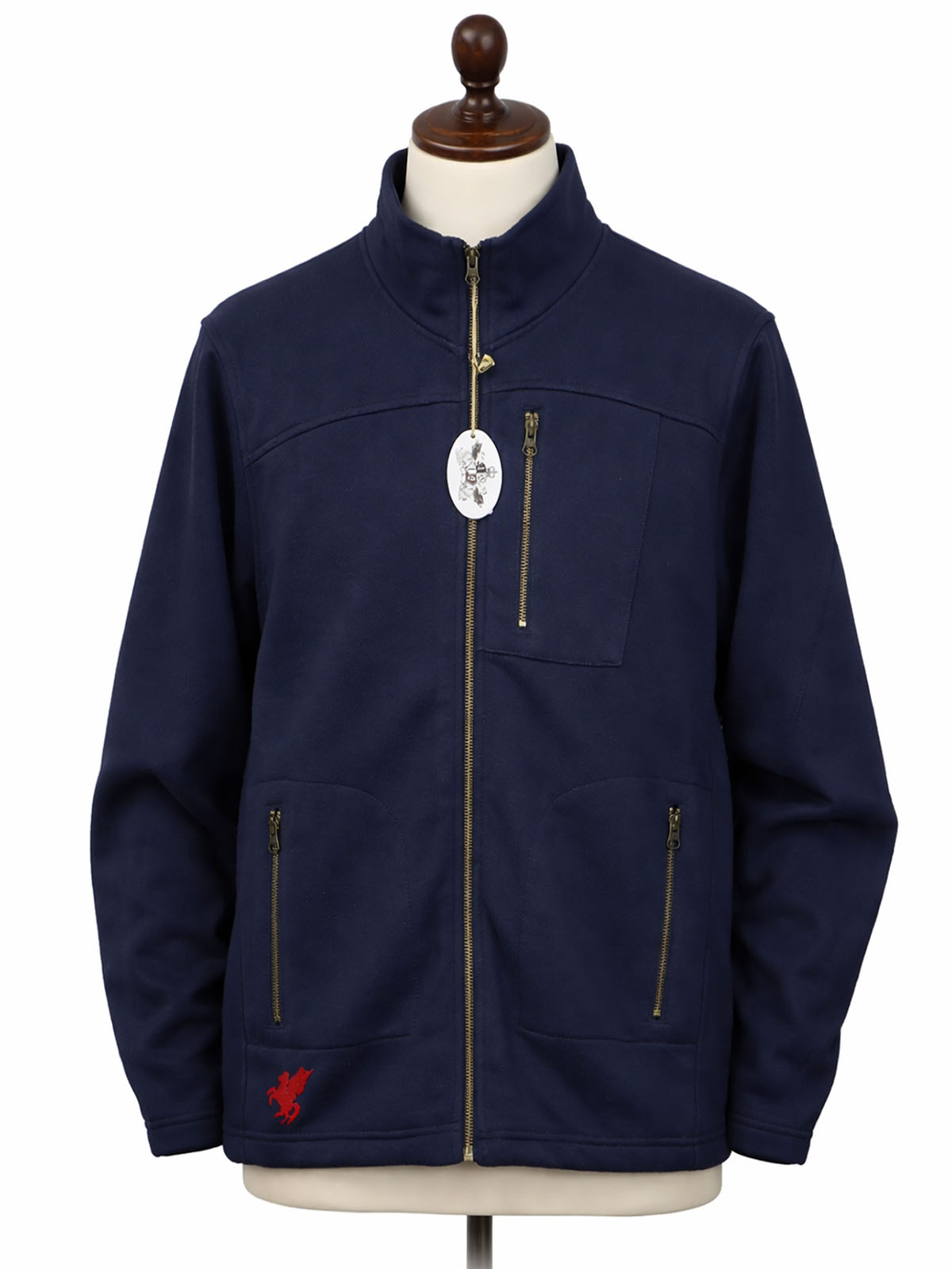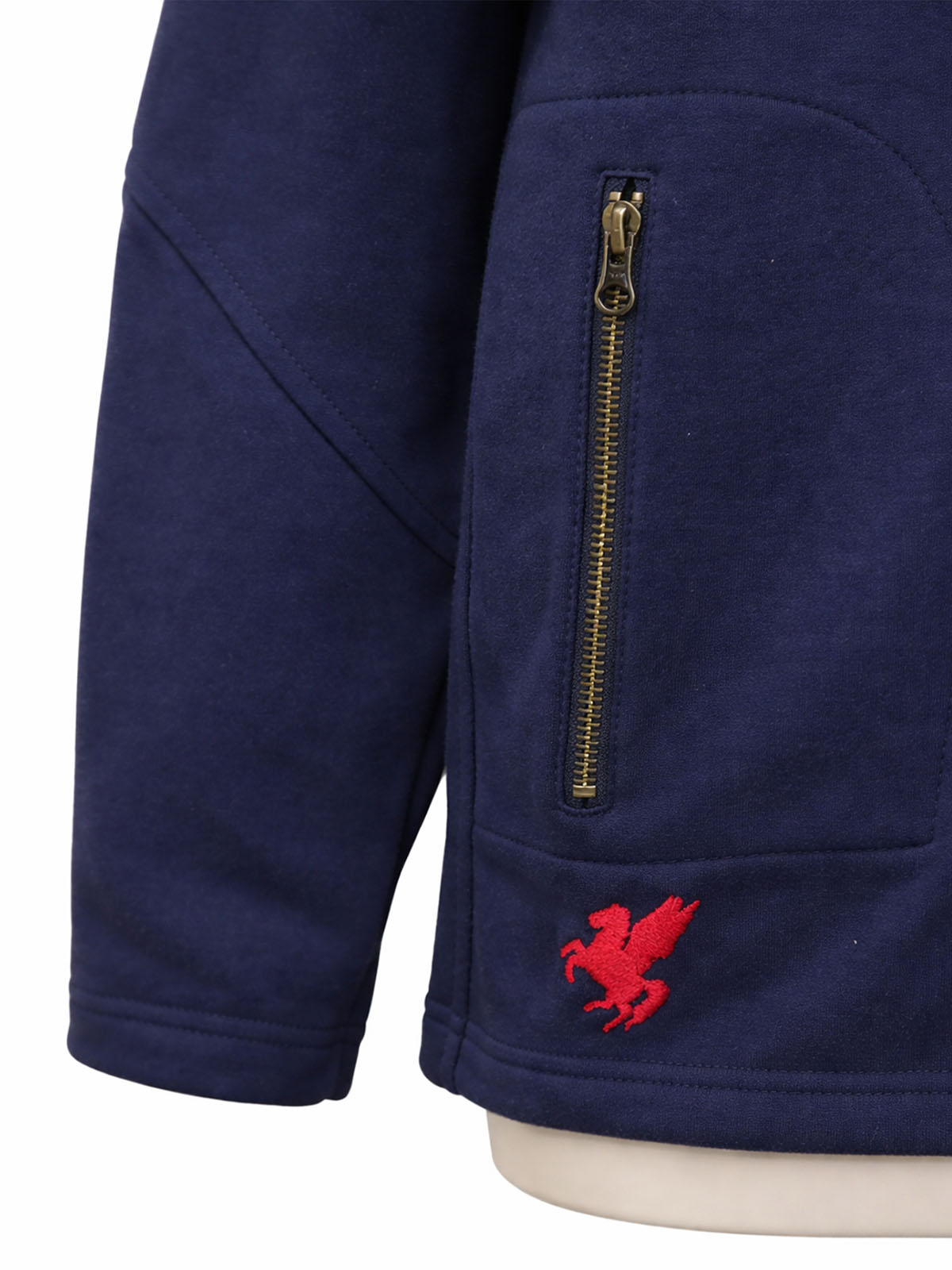 Men's navy blue full-zip fleece jacket featuring gold-toned zippers and a red embroidered emblem on the lower left side. Three zipped pockets to the front. SIZE LARGE: CHEST ACROSS 22", LENGTH 28"