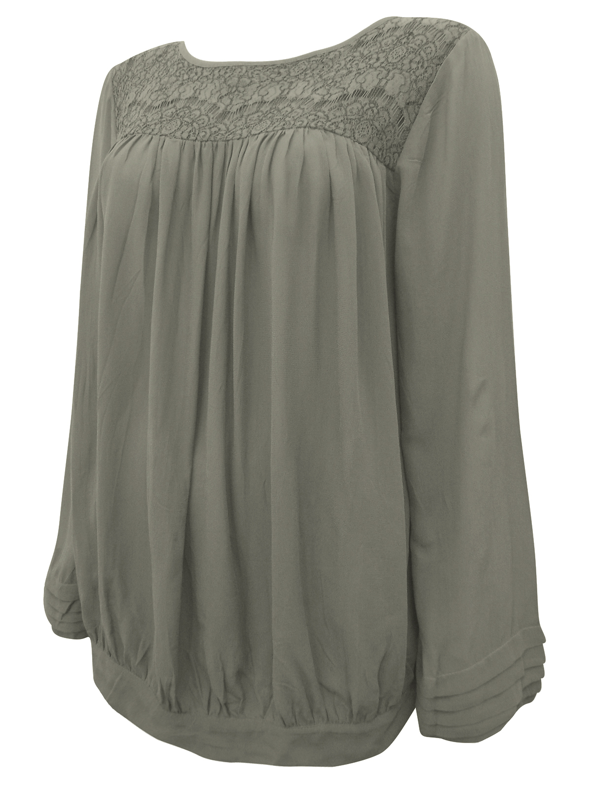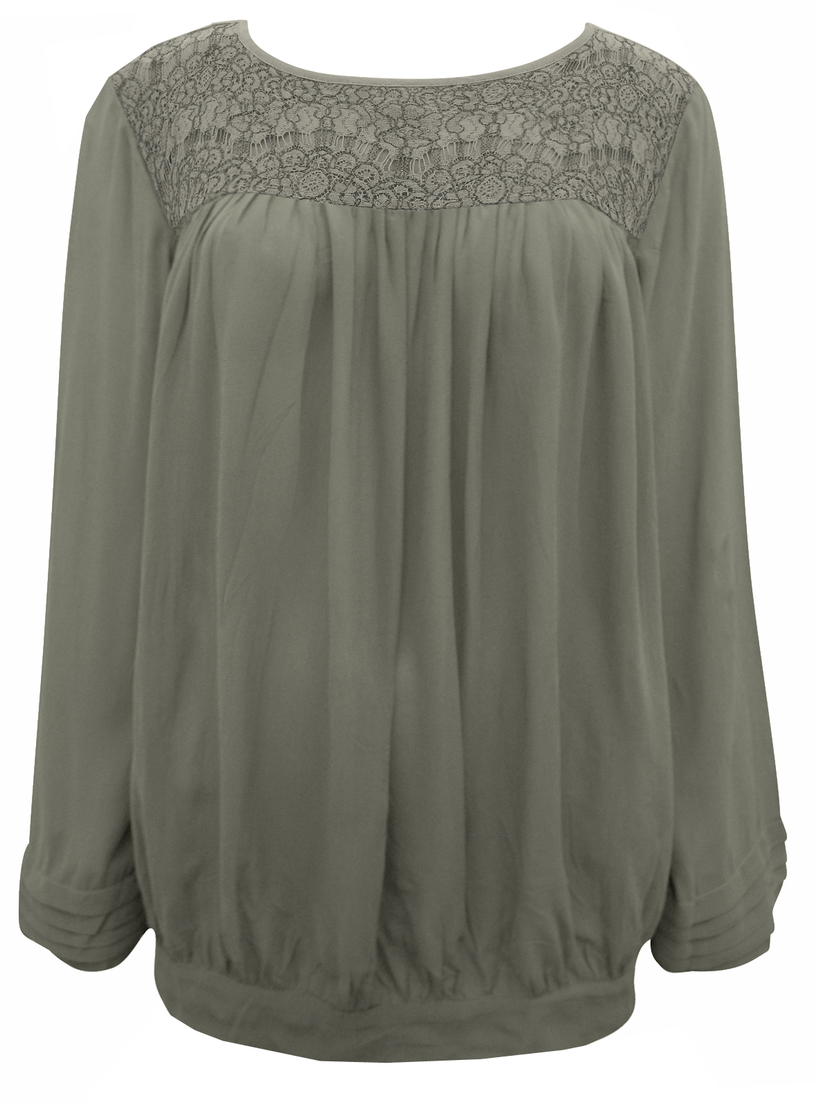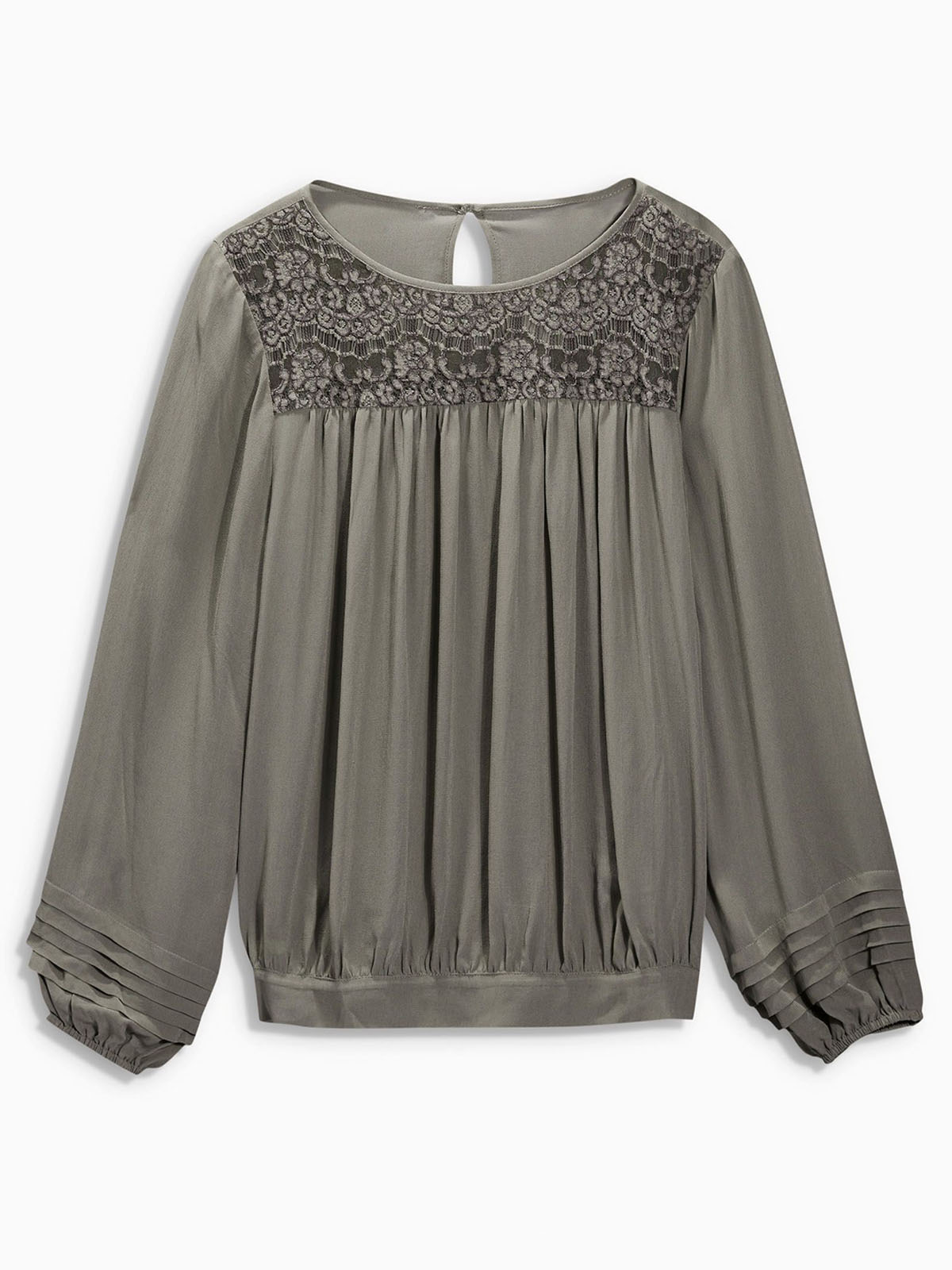 Lightweight round neck blouse with a crochet lace yoke and long sleeves with pleated cuffs. Gathered detail and keyhole rear with single button fastening. Welt hem.