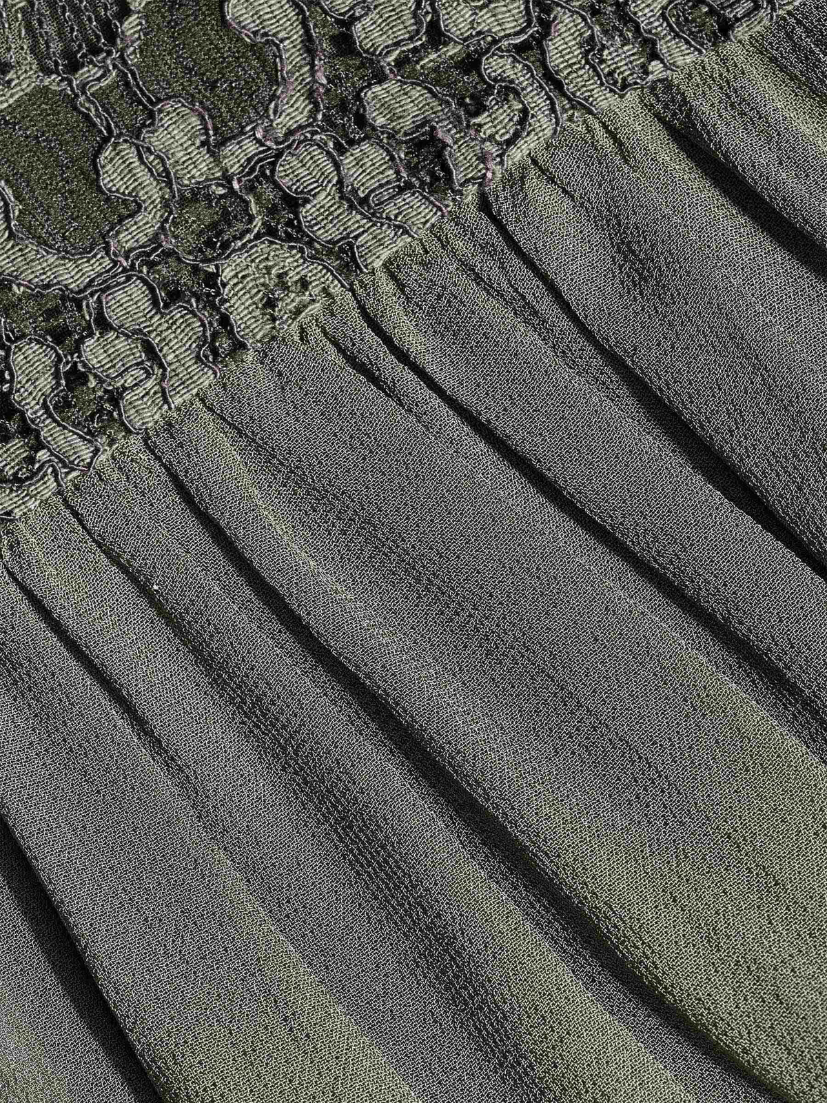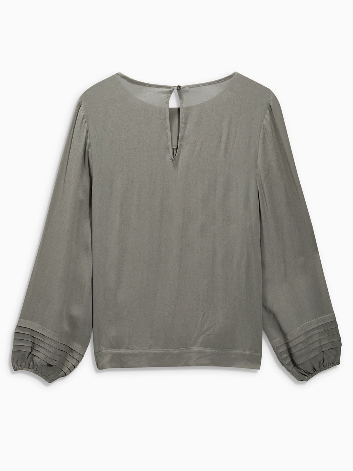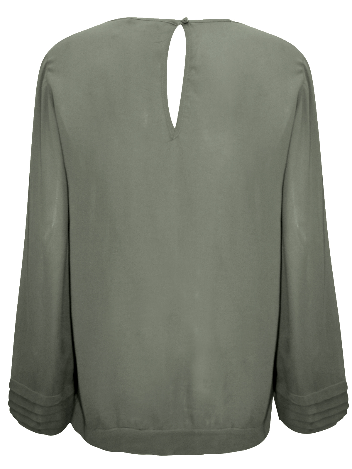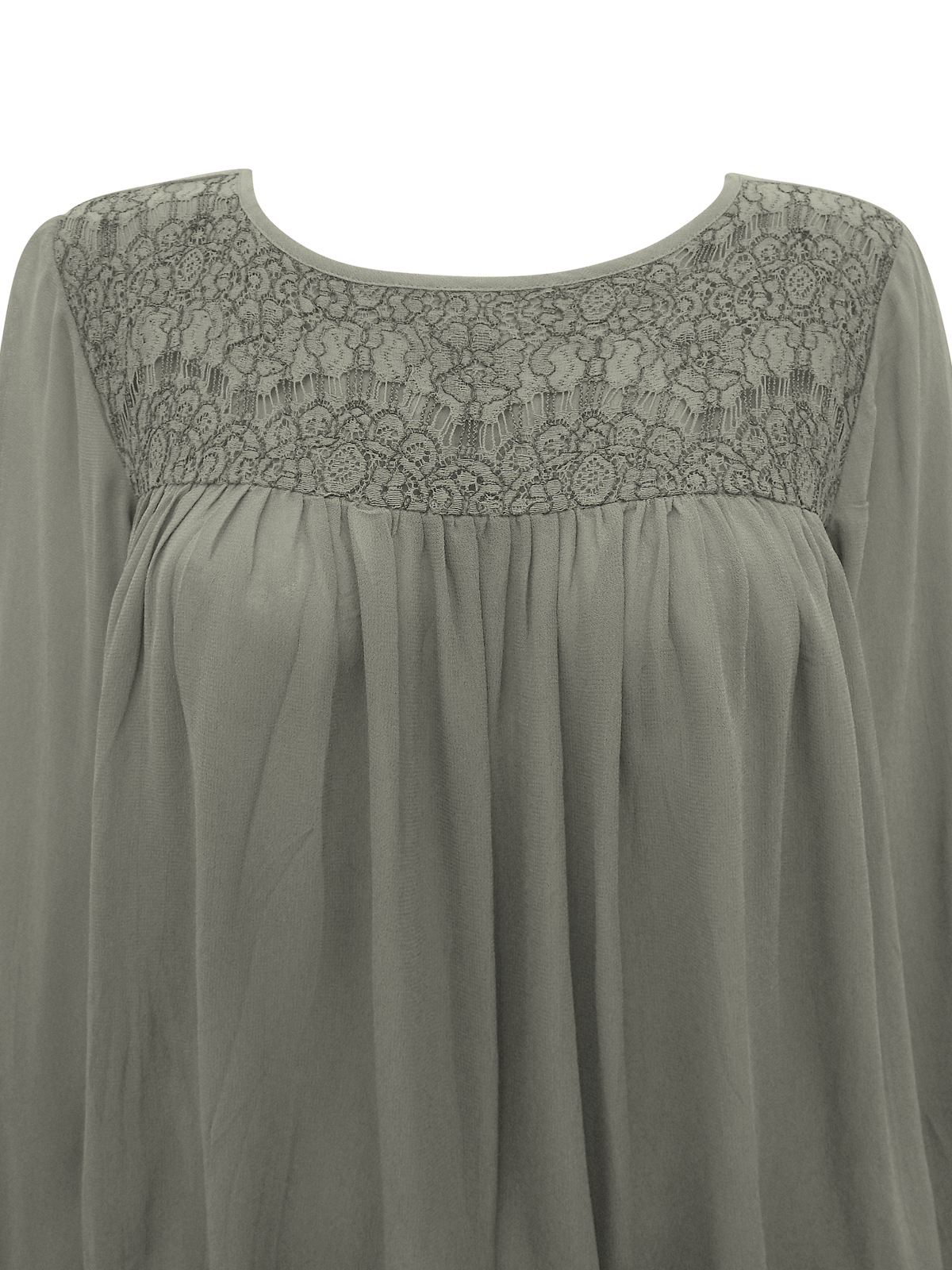 Lightweight round neck blouse with a crochet lace yoke and long sleeves with pleated cuffs. Gathered detail and keyhole rear with single button fastening. Welt hem.