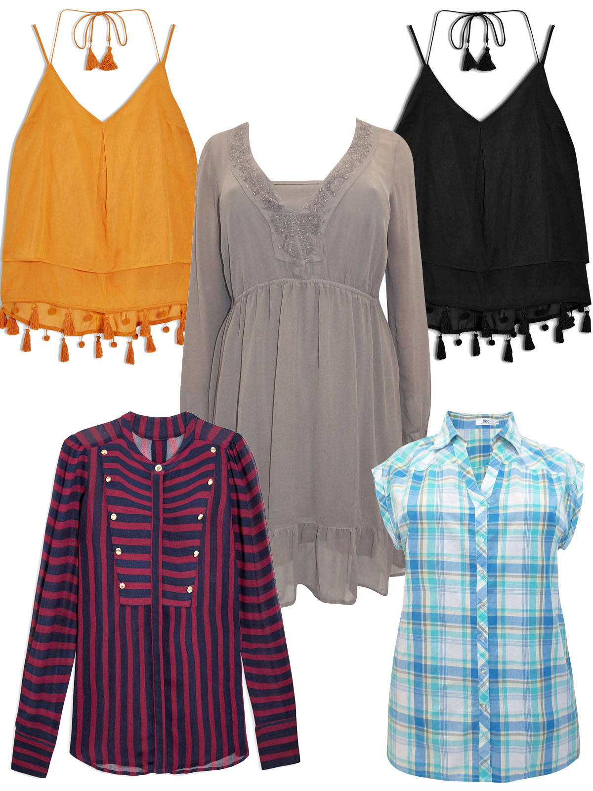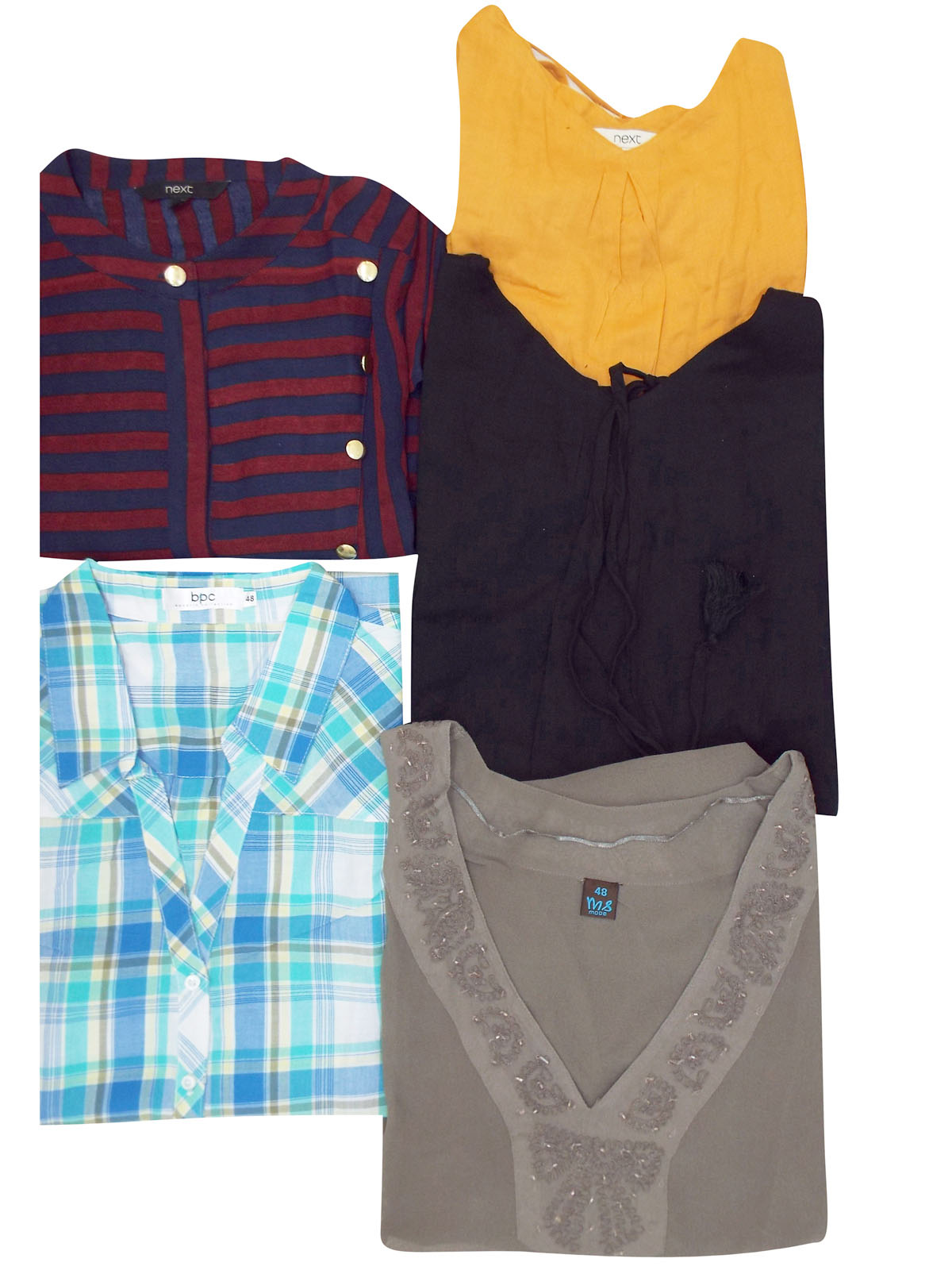 A mixed pack of ladies tops with a variety of styles and colors and lengths.