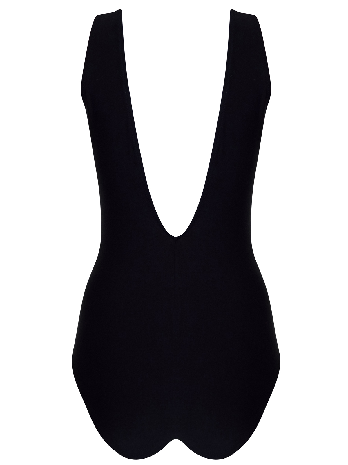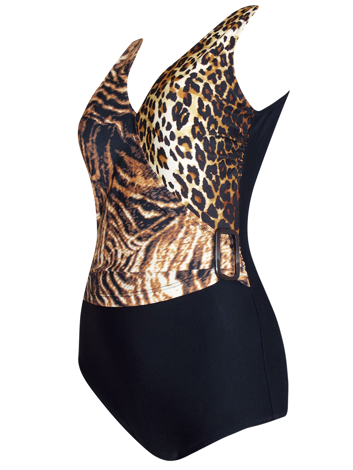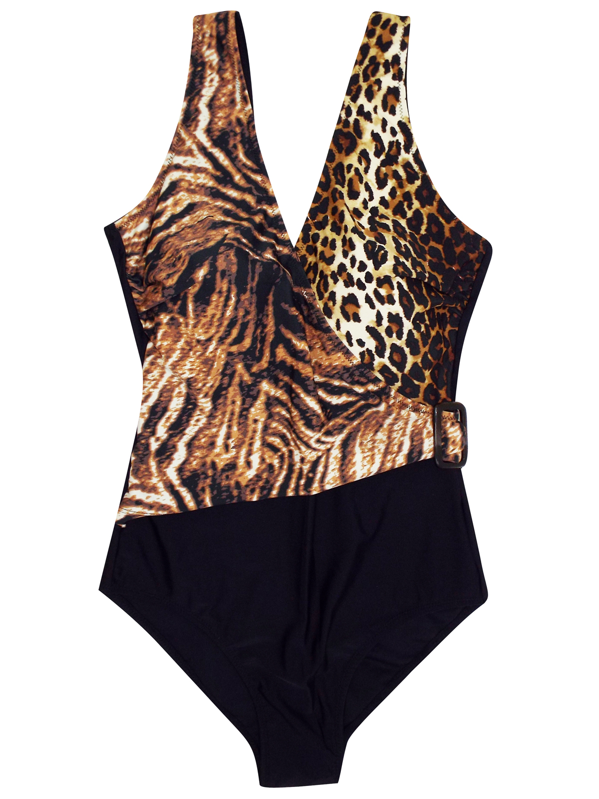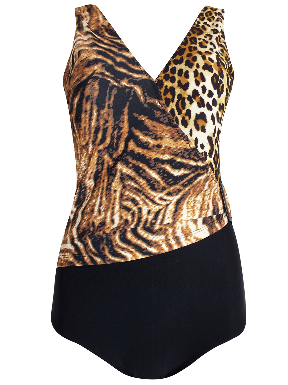 Black animal print wrap over one-piece swimsuit with padded soft cup with plastic buckle feature. Low U-back. Slimming control mesh lining to the front panel. A stunning poolside or beachside must!