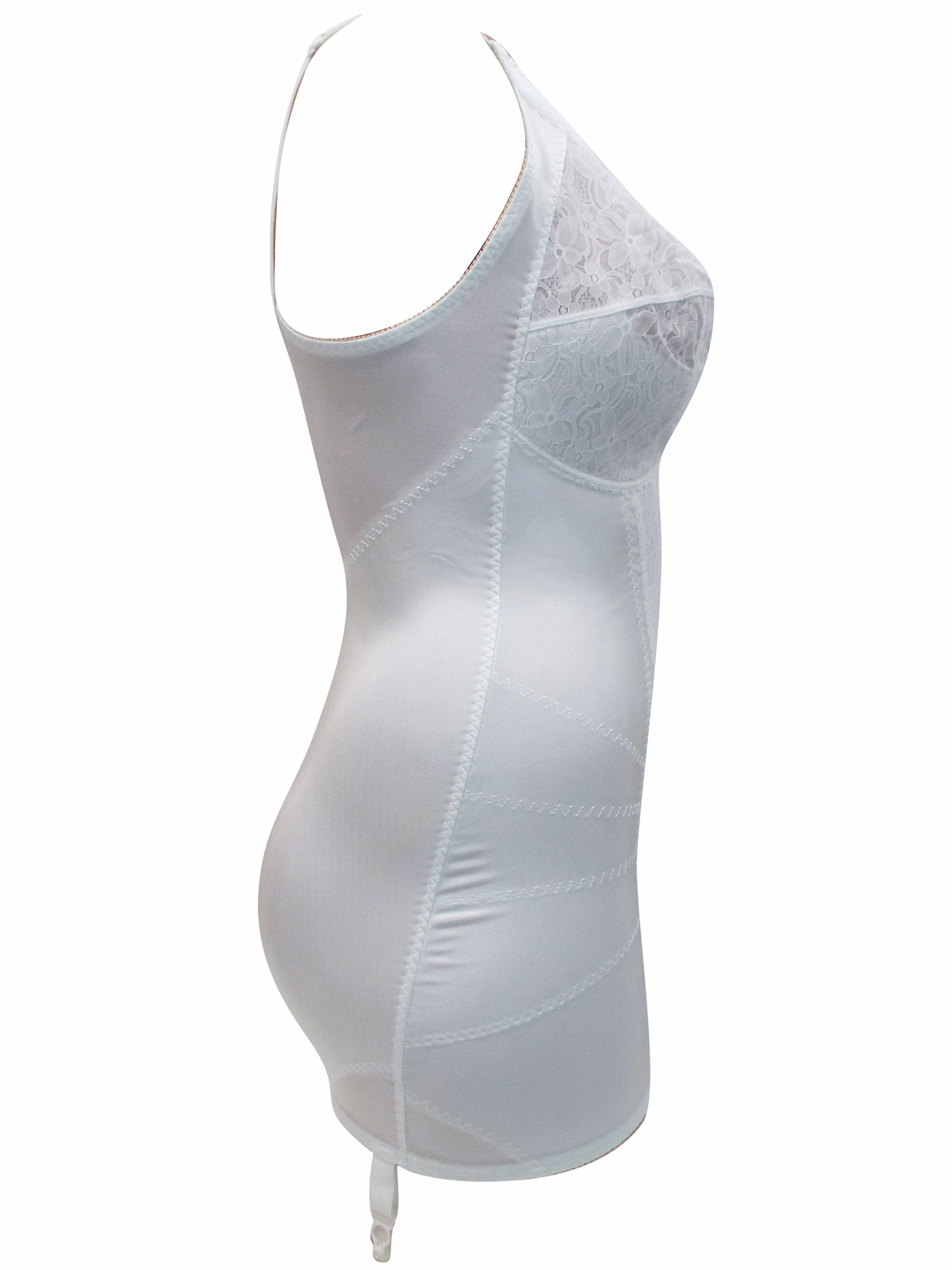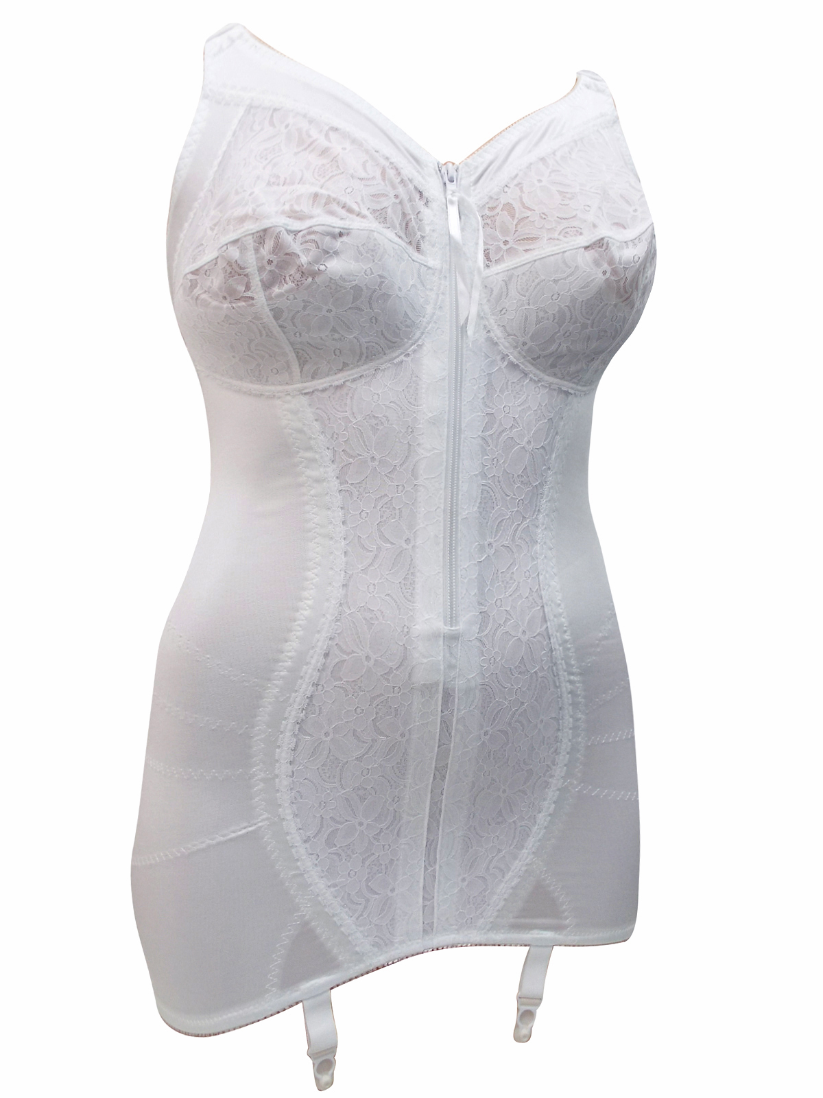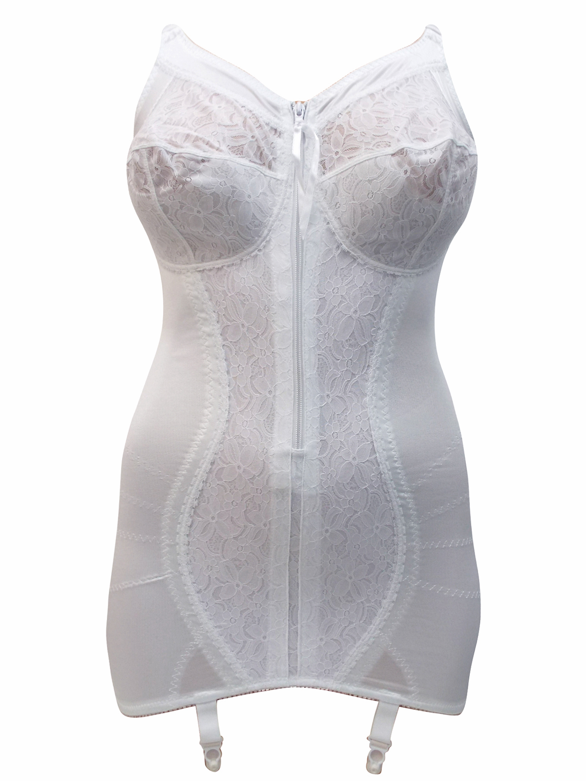 This firm tummy control corslette has a v-neck and zip front. Floral lace cups, wide adjustable straps. Suspender belt details.