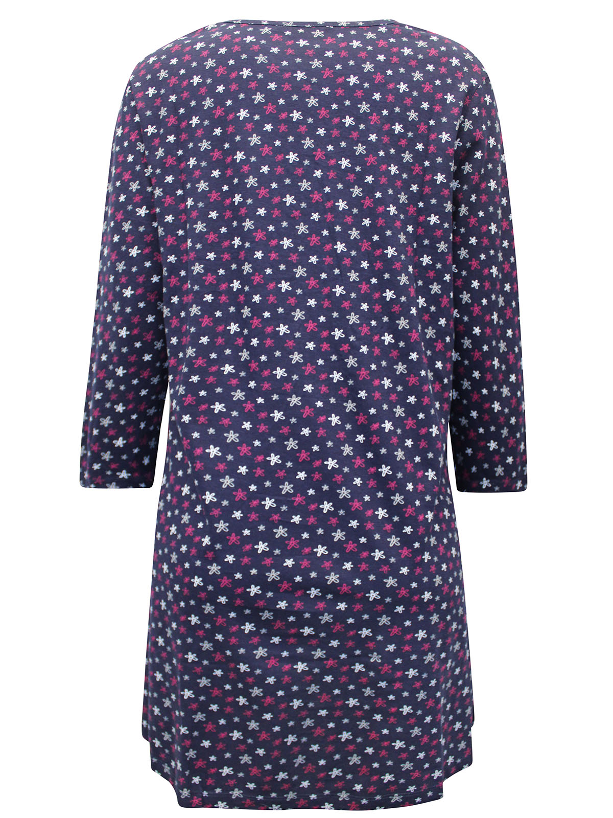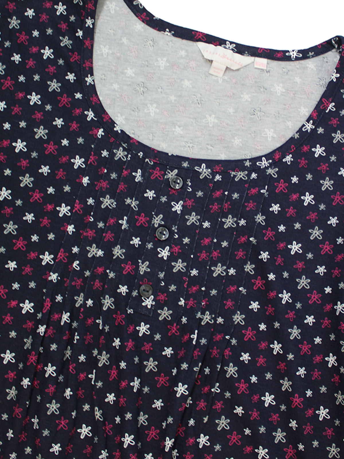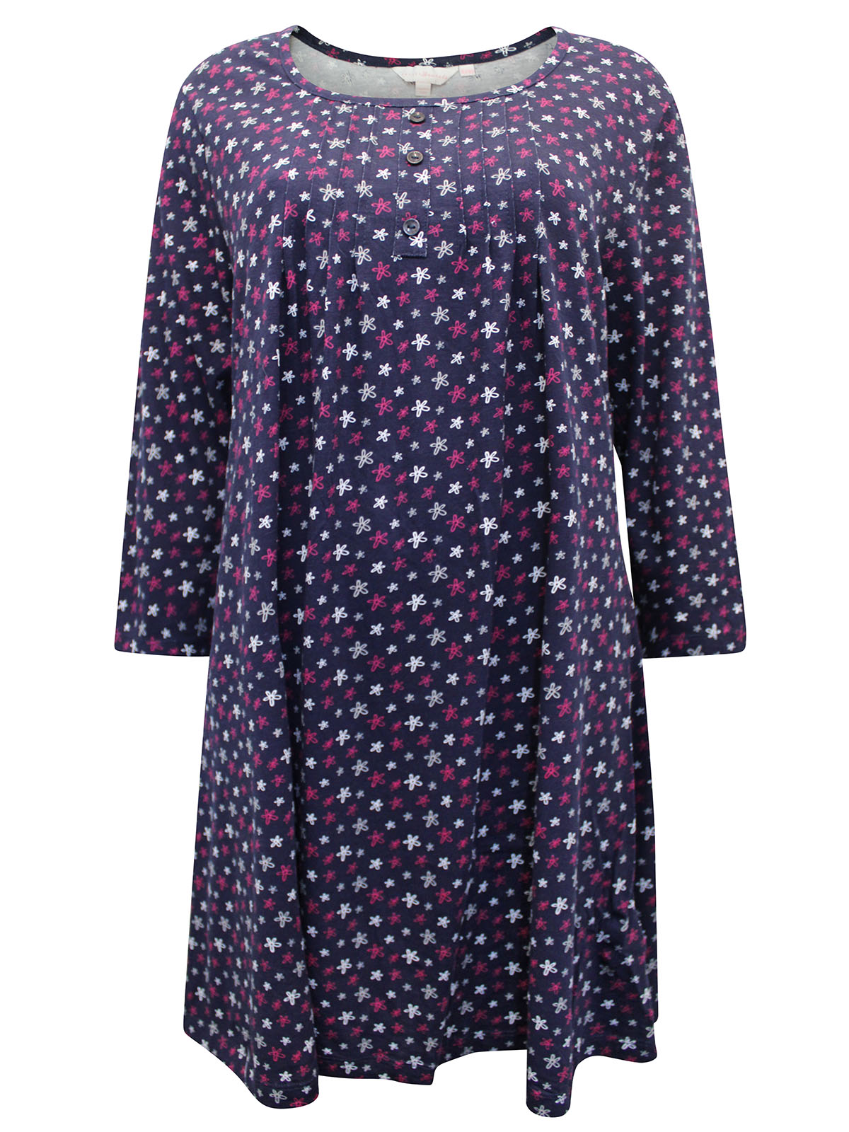 Relax in this pretty lounge nightie that is ideal for lounging and a perfect nights sleep. This nightie has a regular fit with 3/4 length sleeves and a mini length. The nightie is in a spot print with a pleated detail and button fastening. Length 34in.