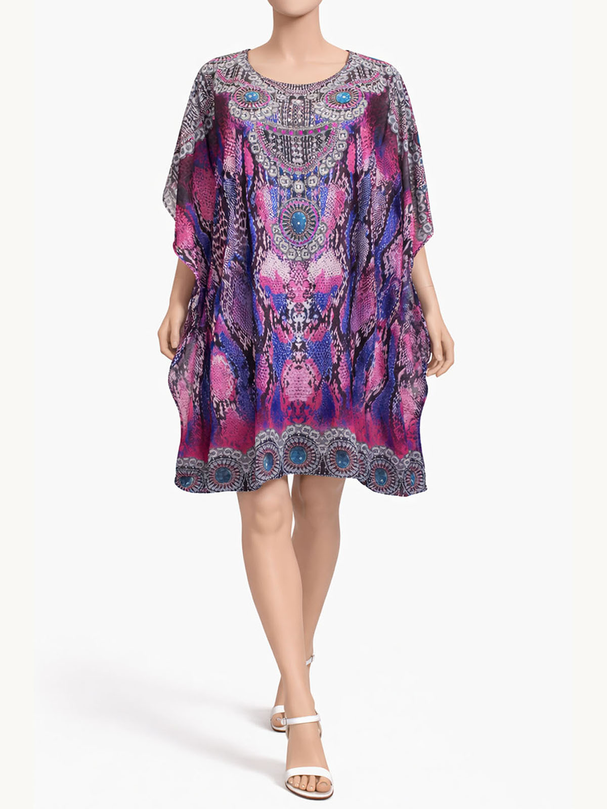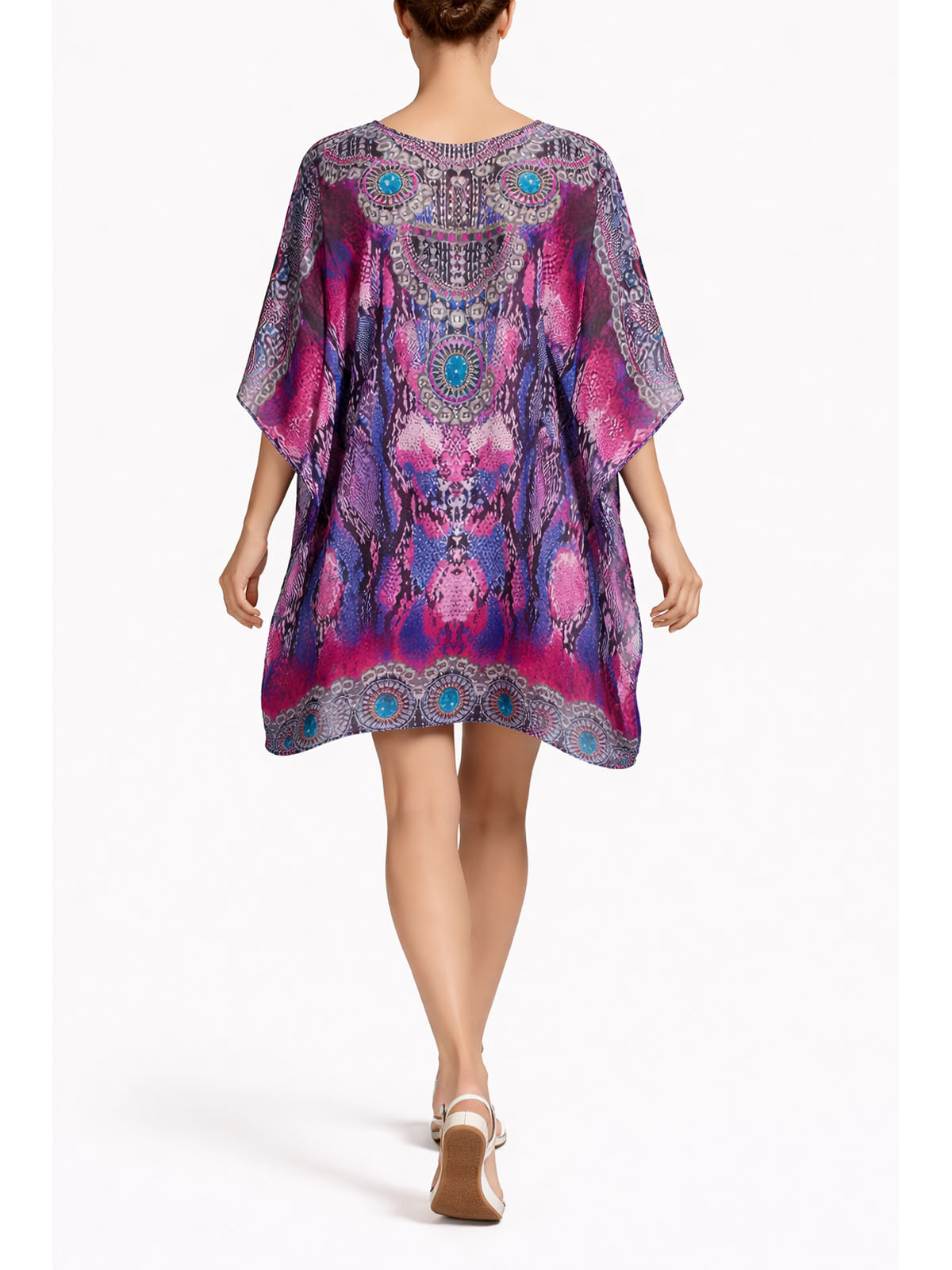 This gorgeous statement tunic comes in a fabulous print. Featuring a scoop neckline, embellished with rhinestones and the sleeves are wide. A stunning occasion tunic for your evening and holiday wardrobe. Length 31in. Freesize Fits 12-14-16. Bust 24in.