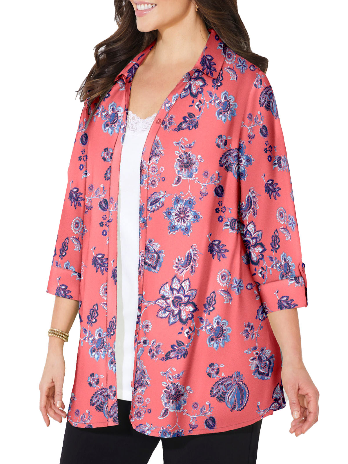 Smooth Opaque Crepe de Chine fabric floats over your curves without clinging for a fit that feels almost life-changing. A classic timeless shirt with button front, notch neckline and cuffed 3/4 sleeves. Bust darts provide shape and the perfect fit. Side slits. Wrinkle resistant, so smooth and comfortable, you’ll want way more than one. Relaxed and easy. Lengths: Petite 29in, Regular 31in.