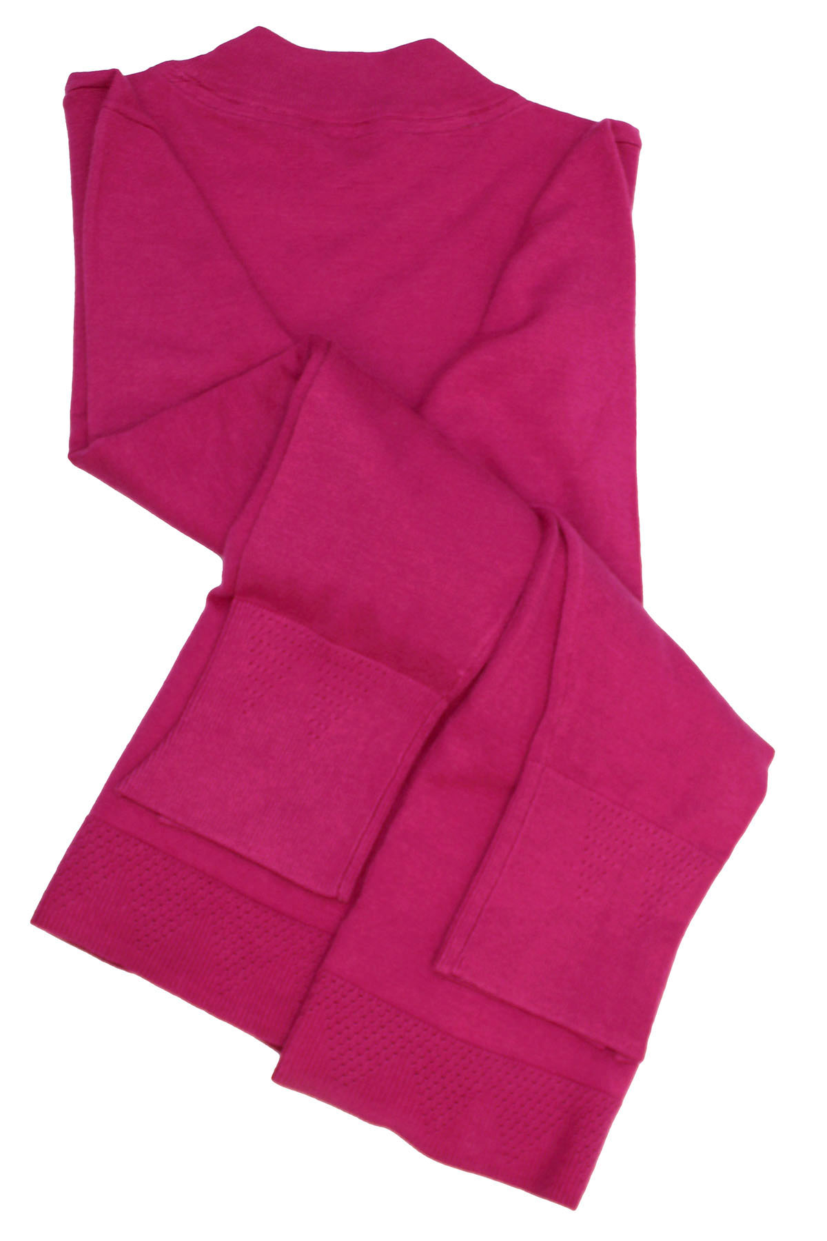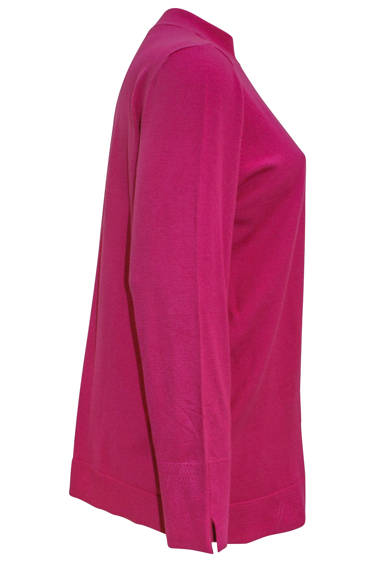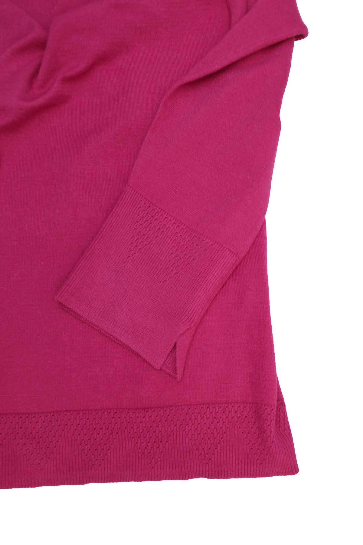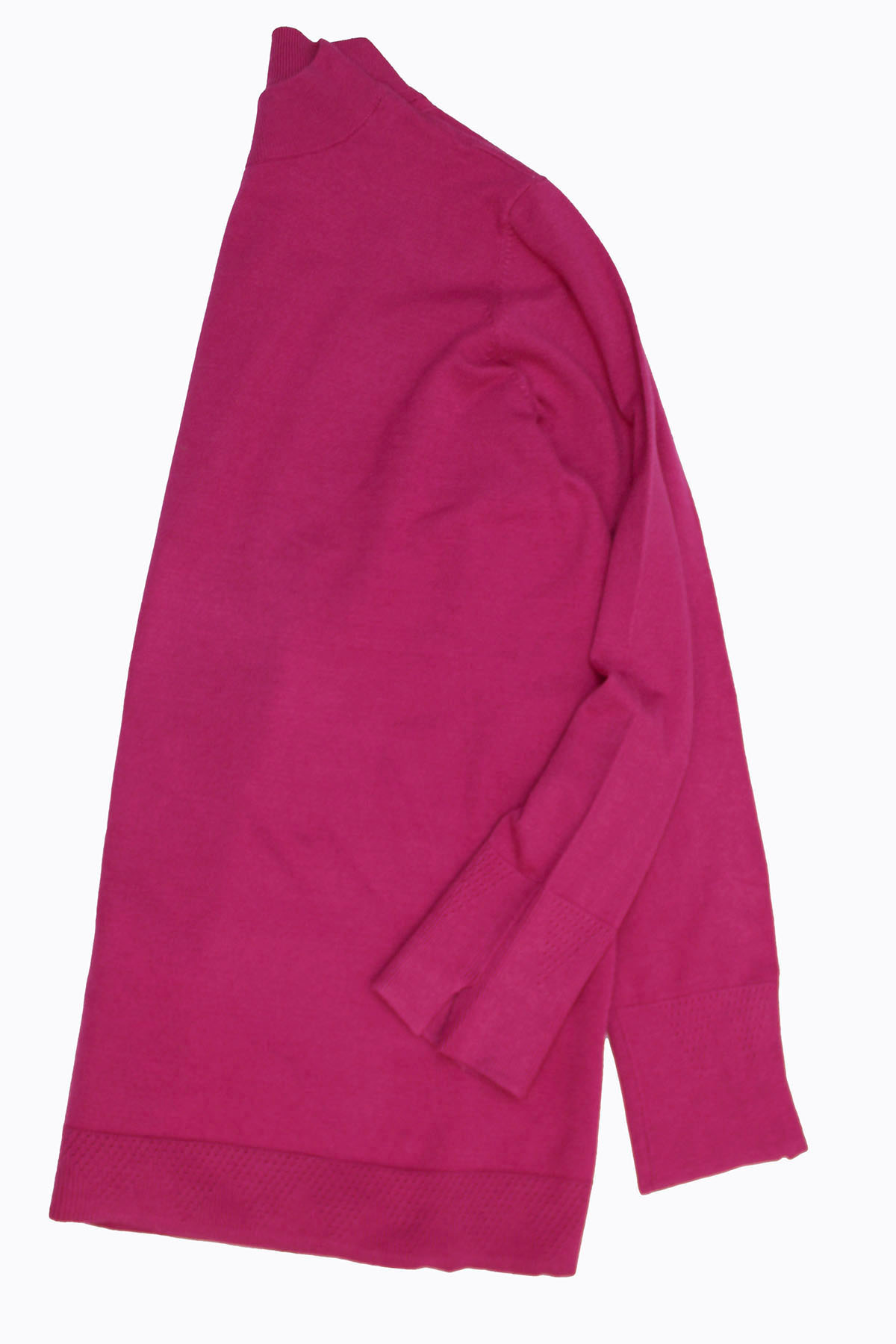 Soft knit jumper with a good weight and natural stretch. this jumper features a funnel neckline, long sleeves with subtle pointelle texture trim at split cuffs and hem. Length 28in.