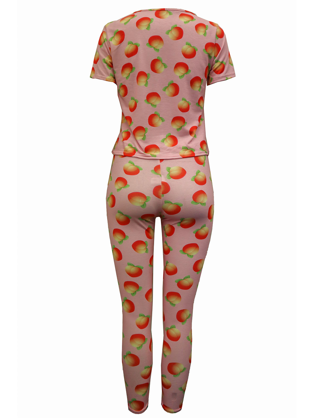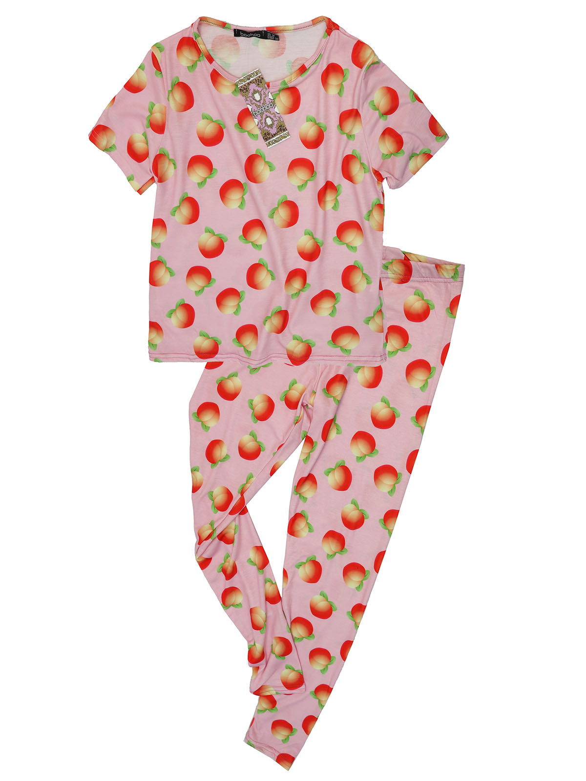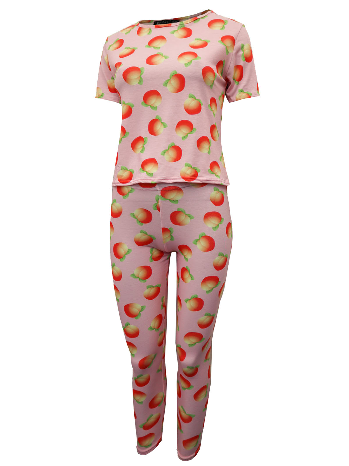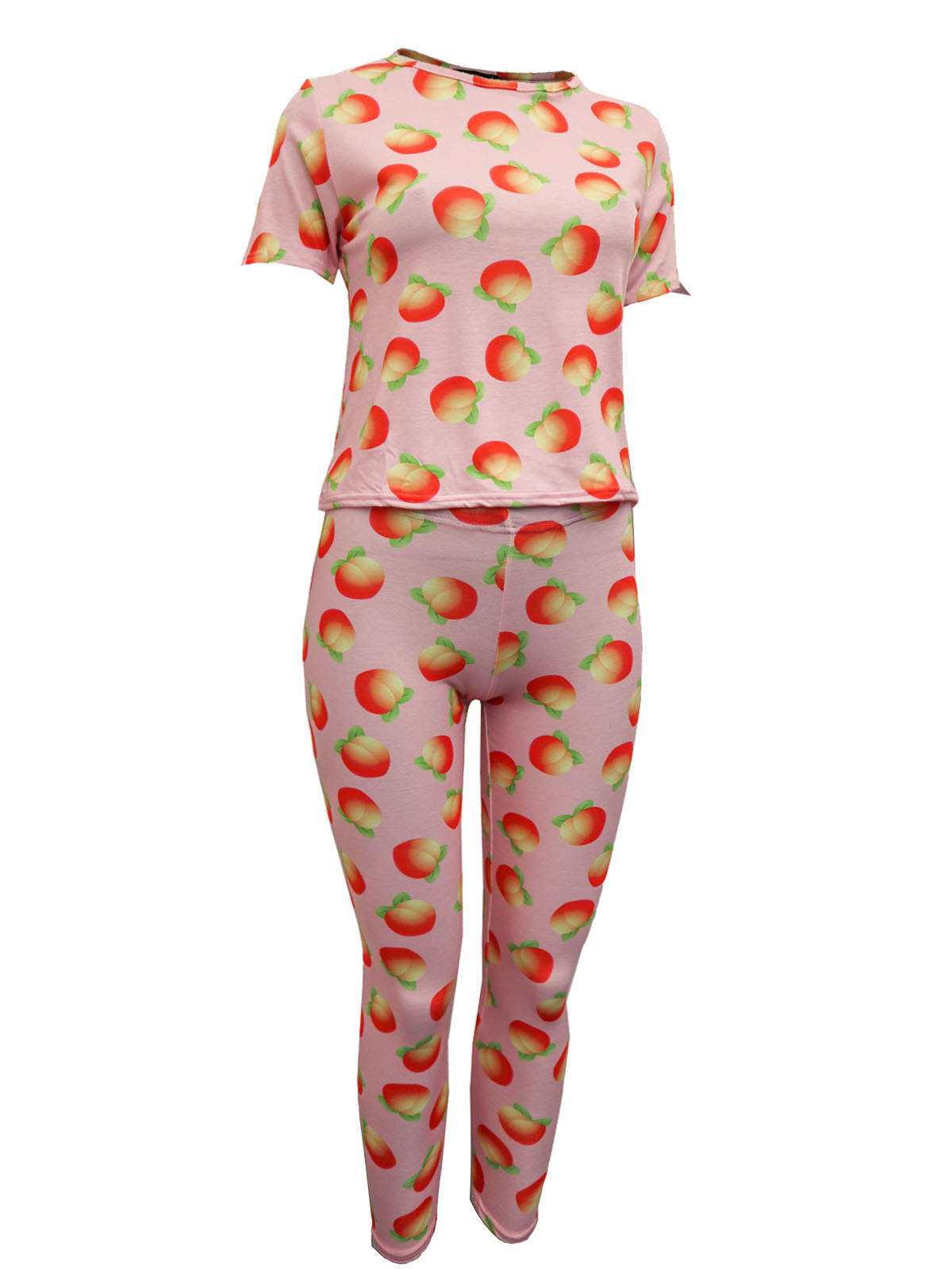 Soft and comfy Lounge or Pyjama leggings set in pink with all-over peach print. Short sleeve top, elastic waist full-length leggings bottoms. Breathable viscose stretch fabric to keep you cosy yet cool during warmer seasons.
