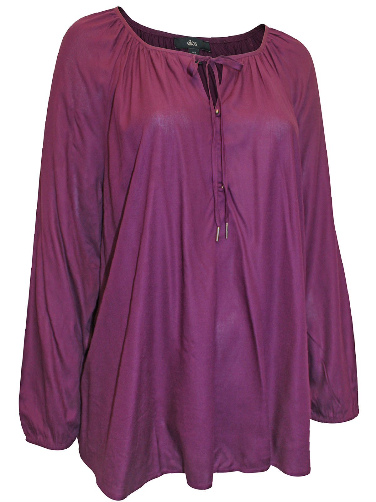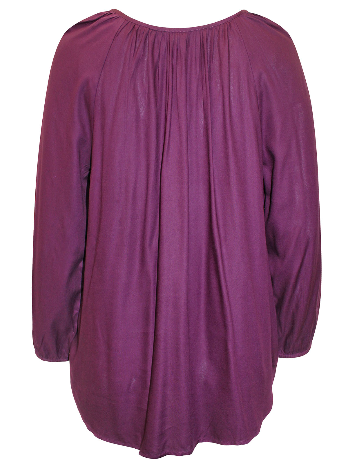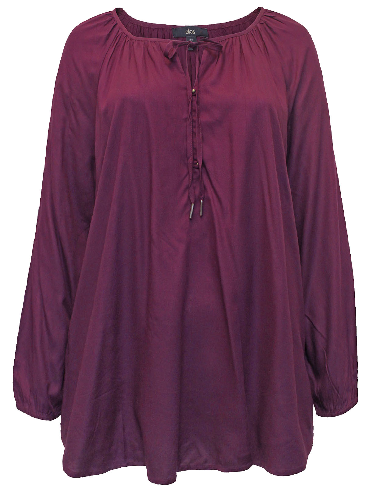 Peasant tunic has faux button placket tunic with keyhole and tie. Raglan long sleeves with elastic cuffs. Length 31in.