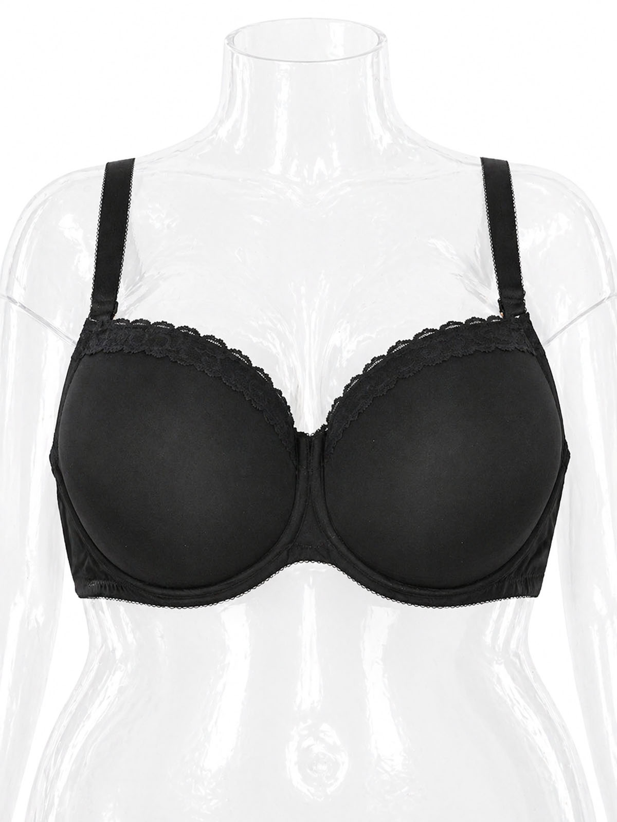 Full coverage T-Shirt bra with adjustable comfort soft straps and soft touch 4 hook and eye rose gold fastening. Soft lace over the cups border, U back design and bones free sides for a comfortable and flexible fit. Plus size bras, Sizes 38 to 46. Cups D-DD-E-F-FF-G.