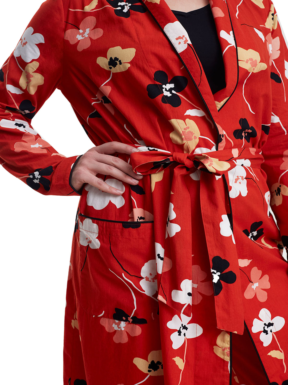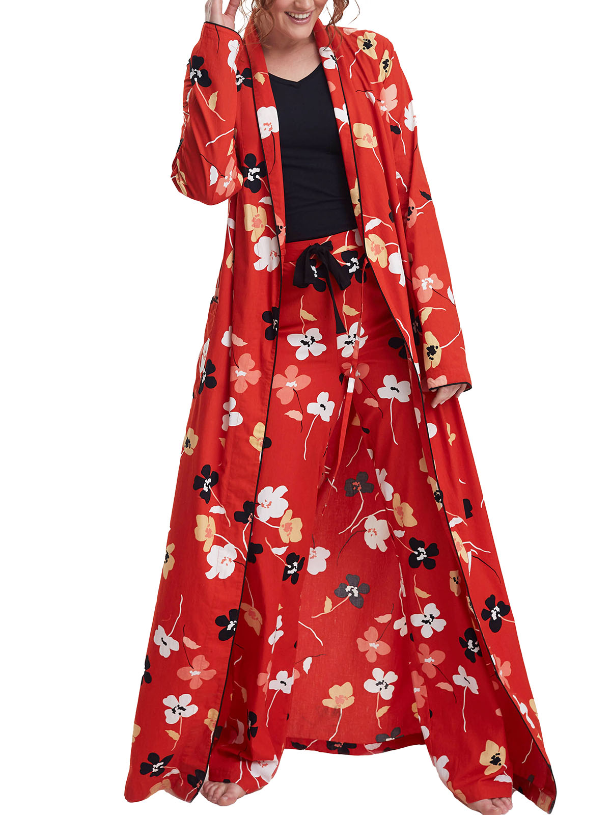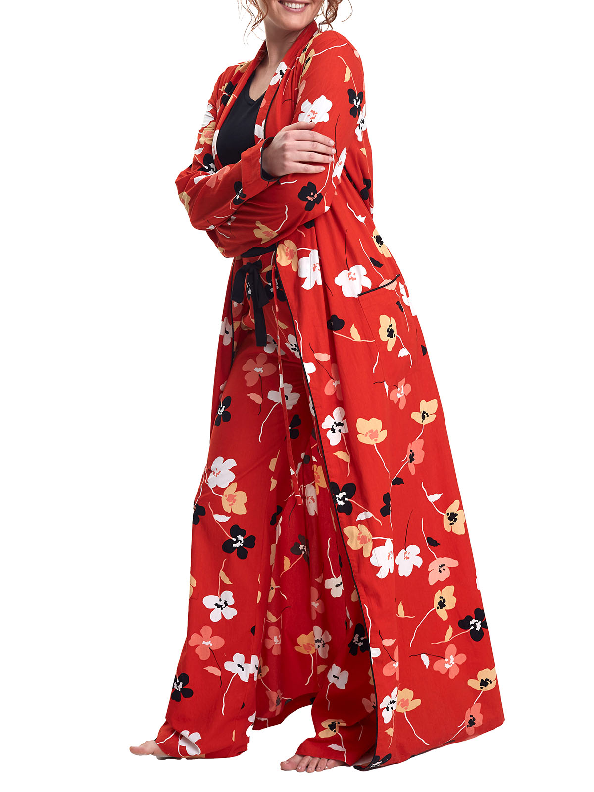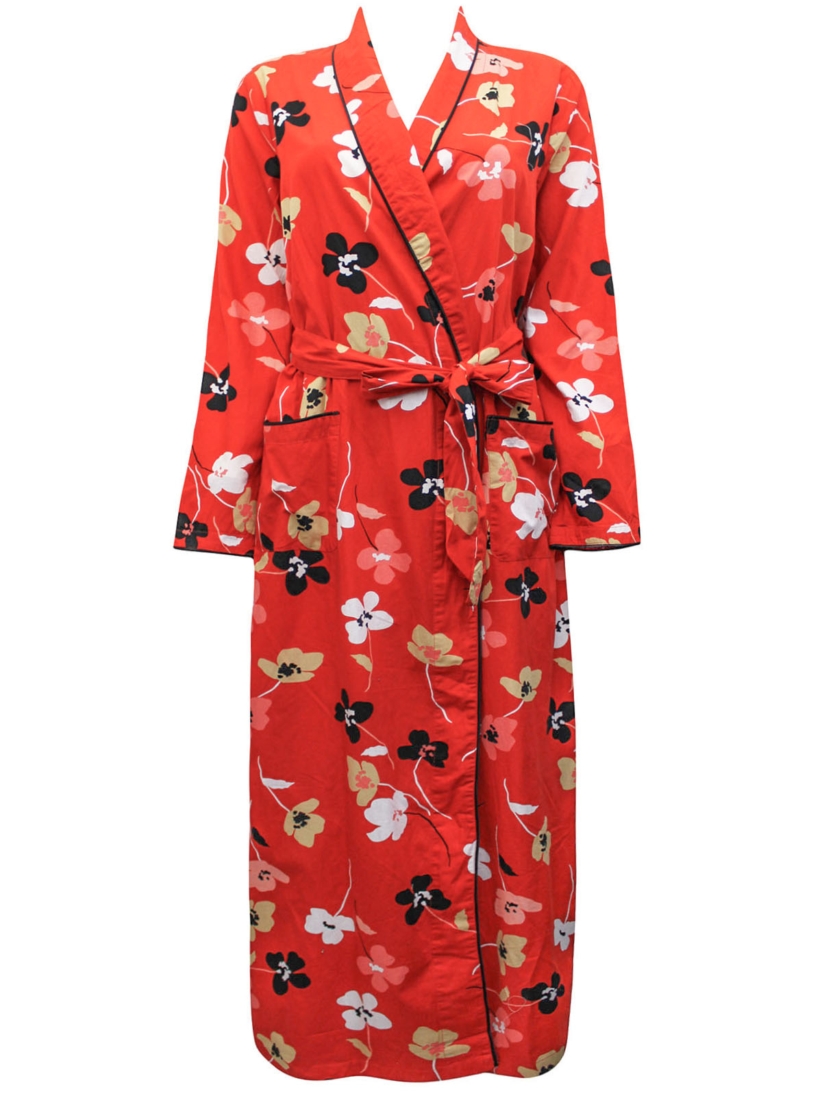 Lounge in style with this gorgeous gown in a gorgeous floral print complete with long sleeves and matching tie belt. Length 59in.