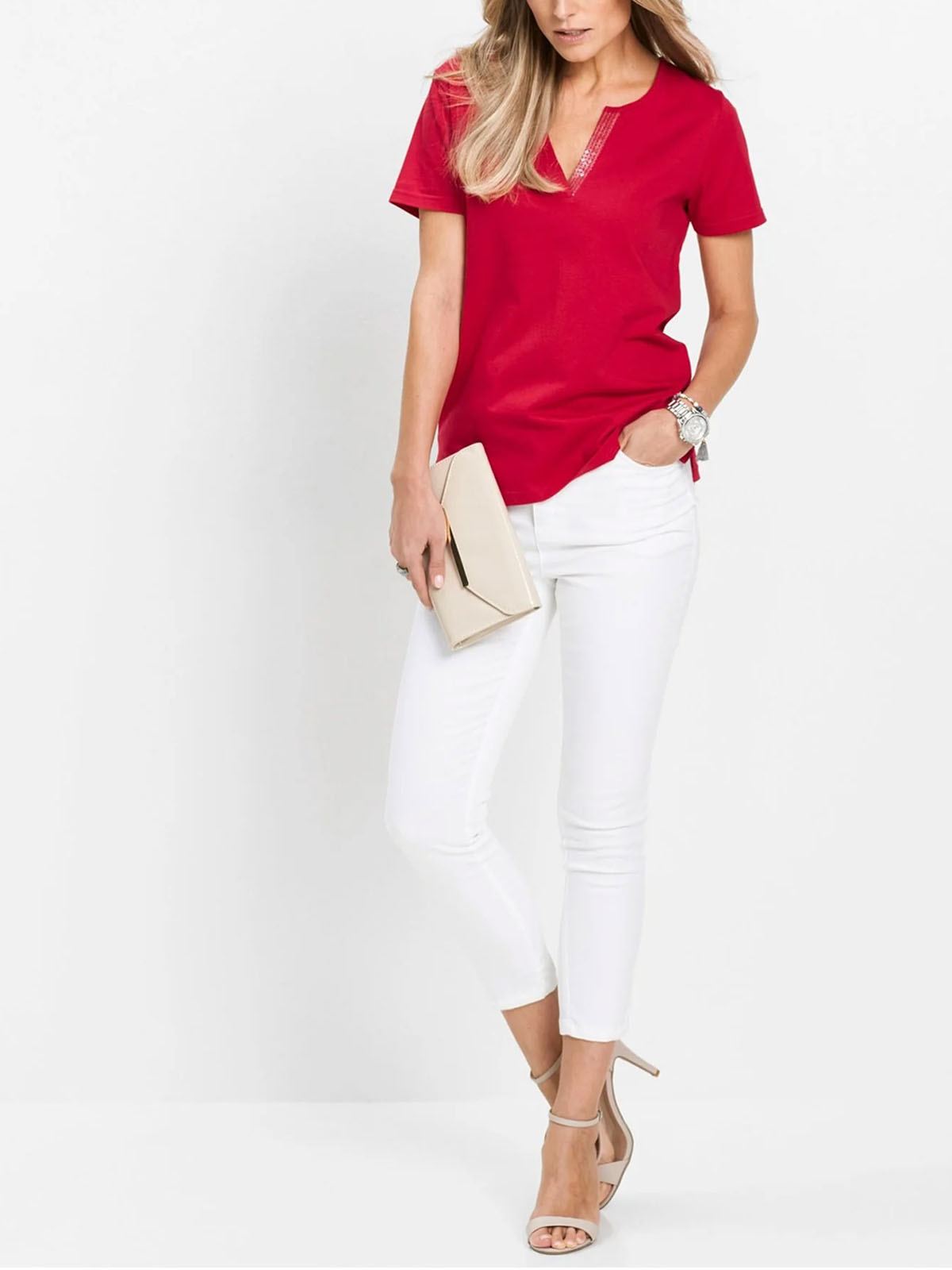Designed in a versatile colorway, this t-shirt is a must-have if you want to update your basics. Featuring a notch neckline with sequin detail and short sleeves. Length 64cm.