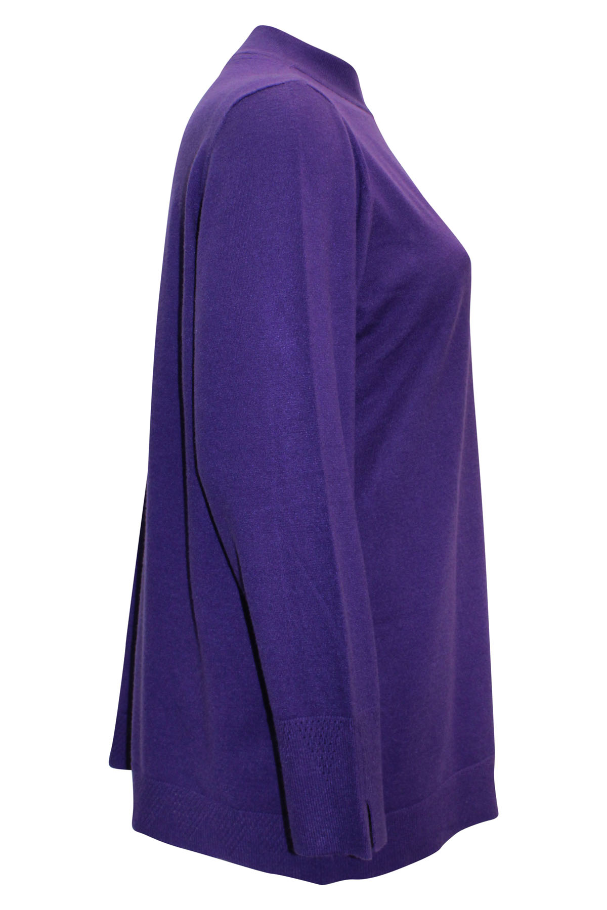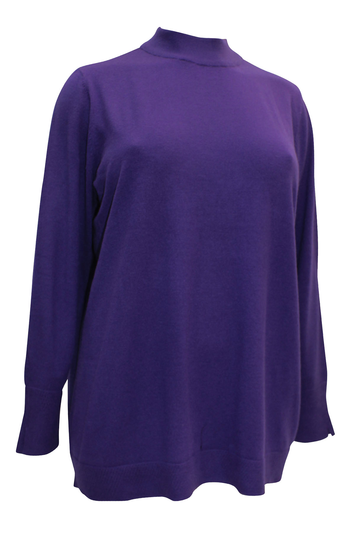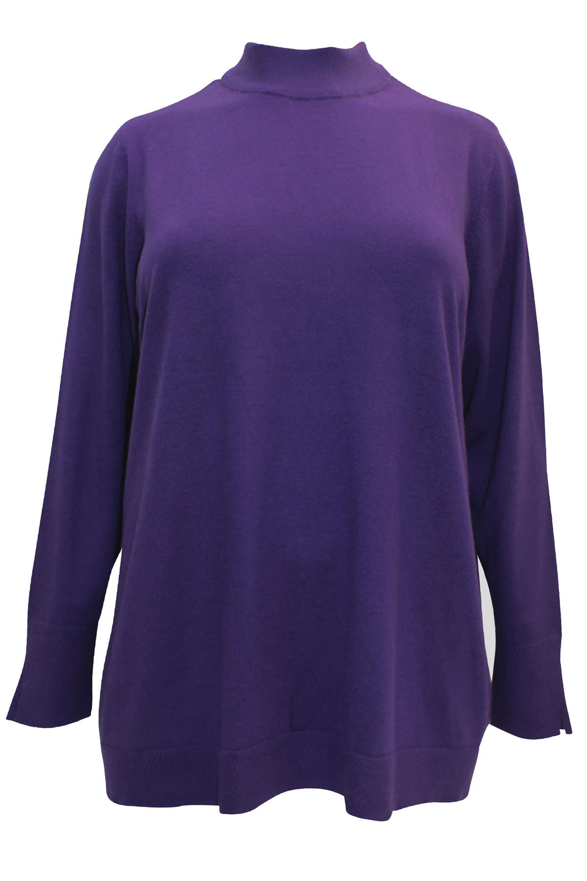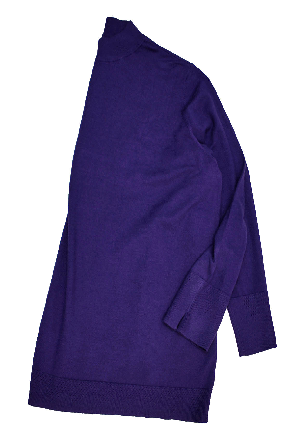 Soft knit jumper with a good weight and natural stretch. this jumper features a funnel neckline, long sleeves with subtle pointelle texture trim at split cuffs and hem. Length 28in.