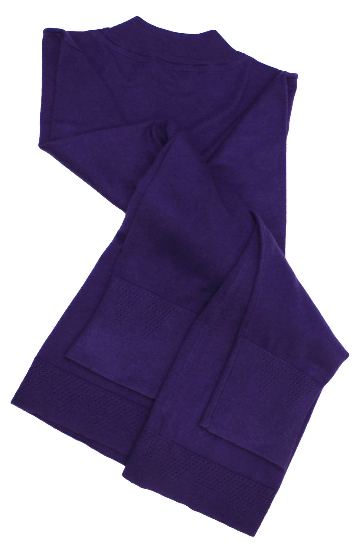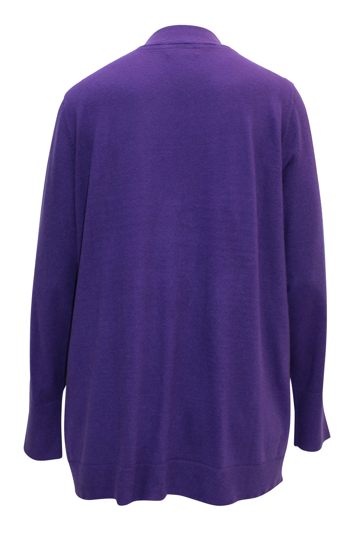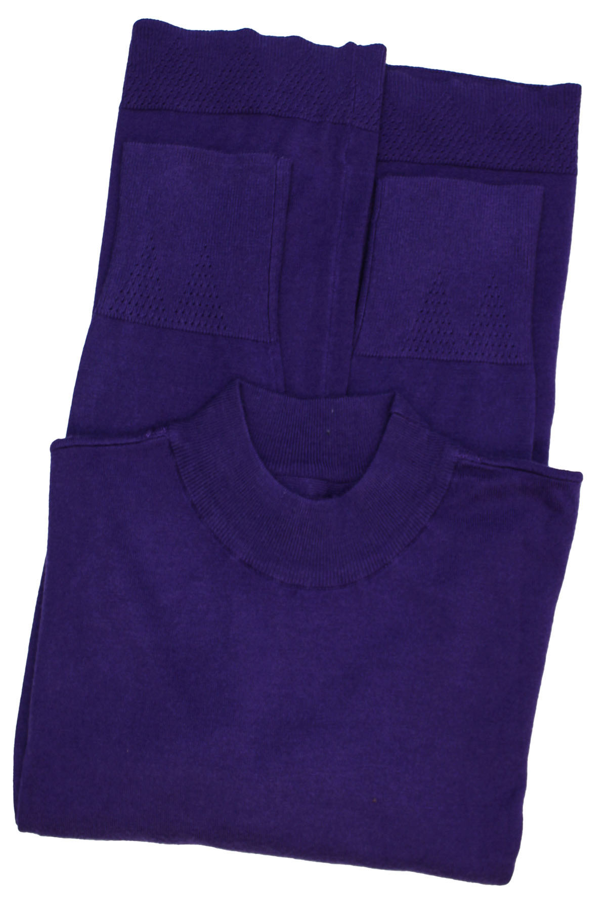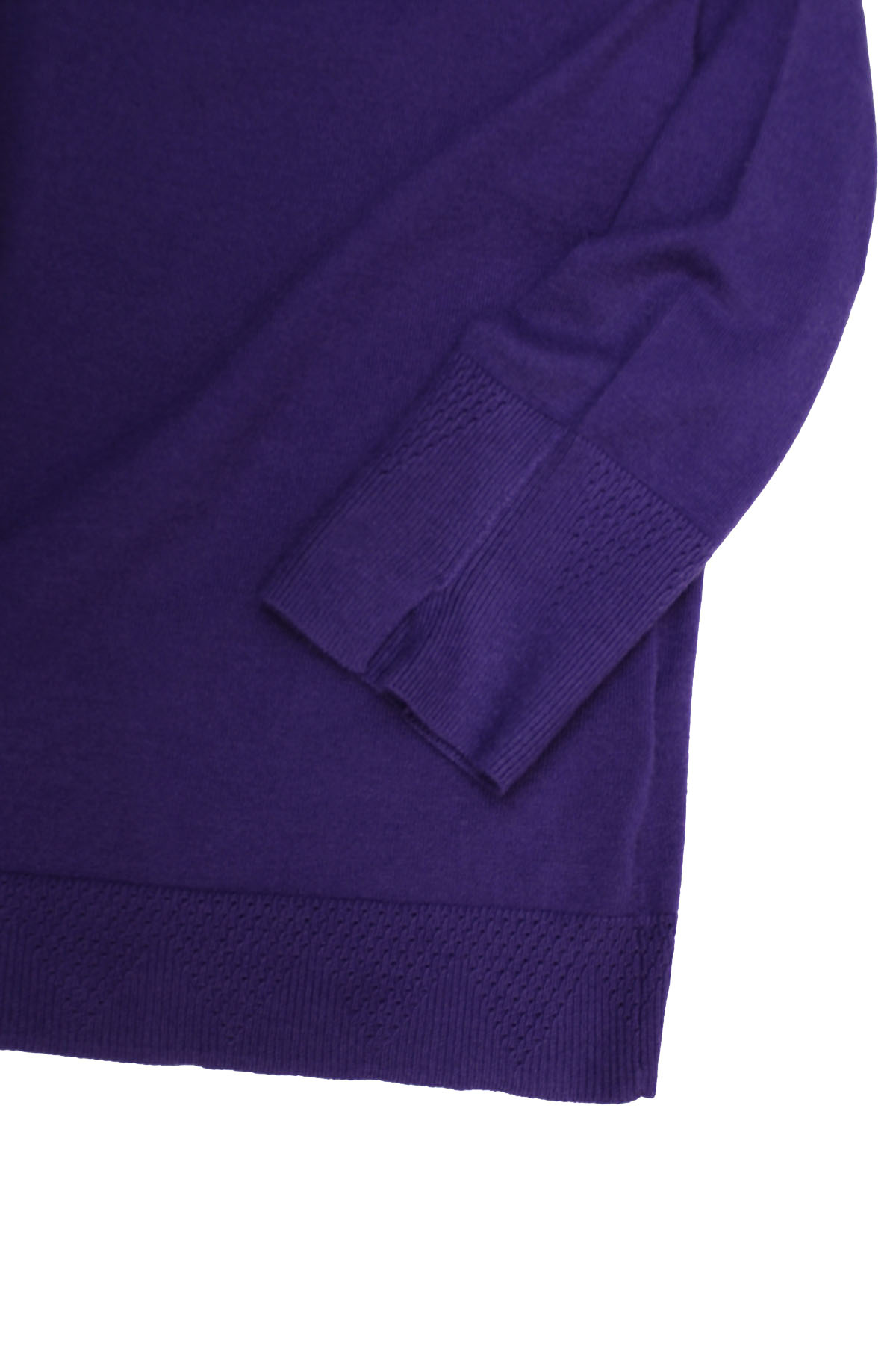 Soft knit jumper with a good weight and natural stretch. this jumper features a funnel neckline, long sleeves with subtle pointelle texture trim at split cuffs and hem. Length 28in.