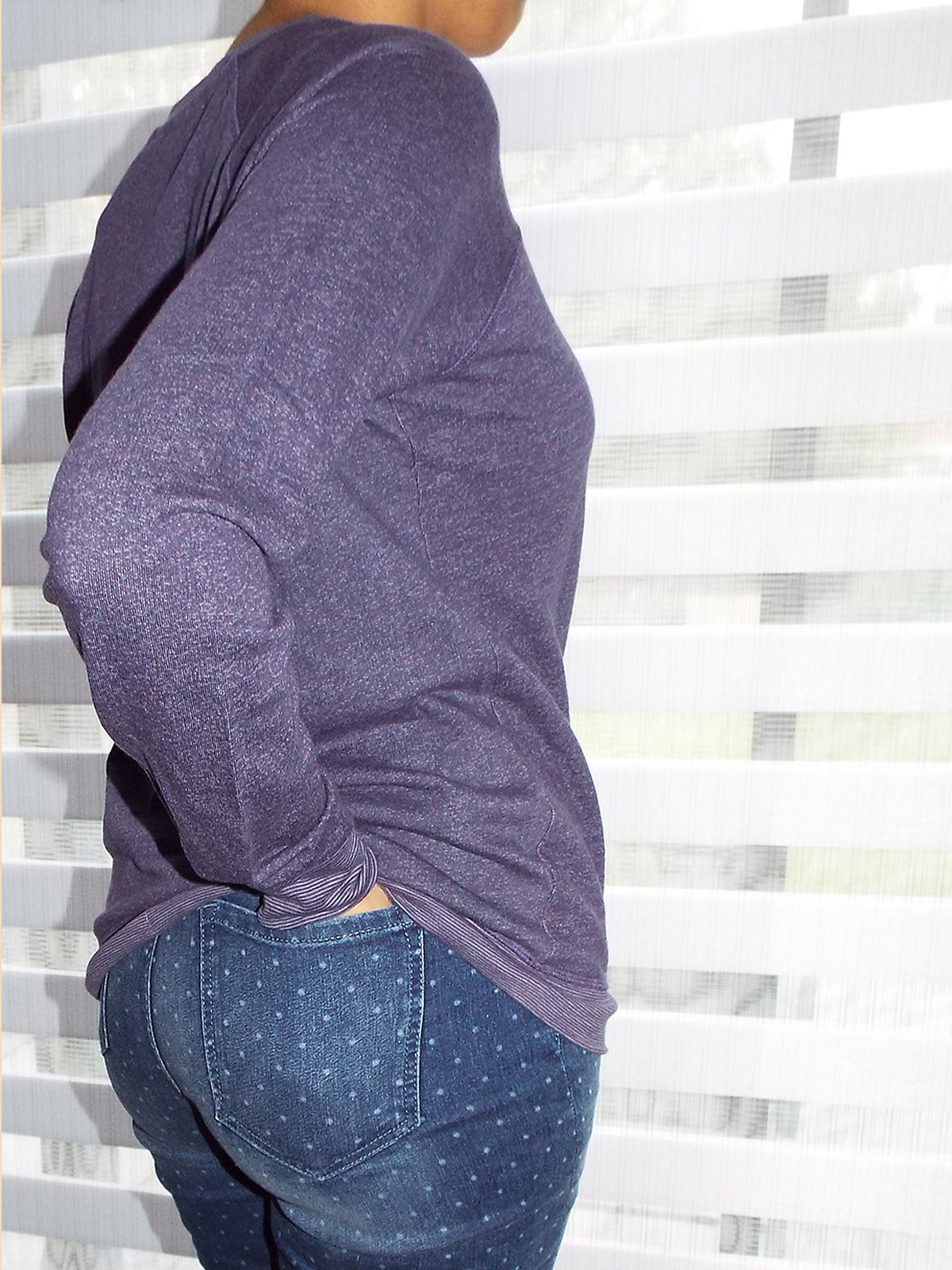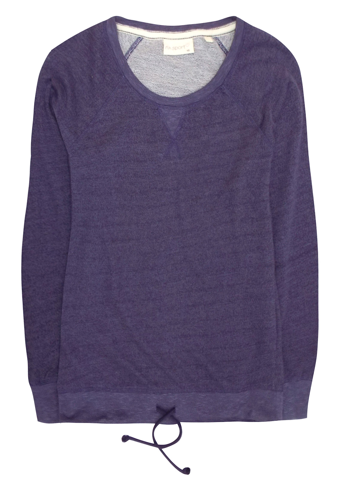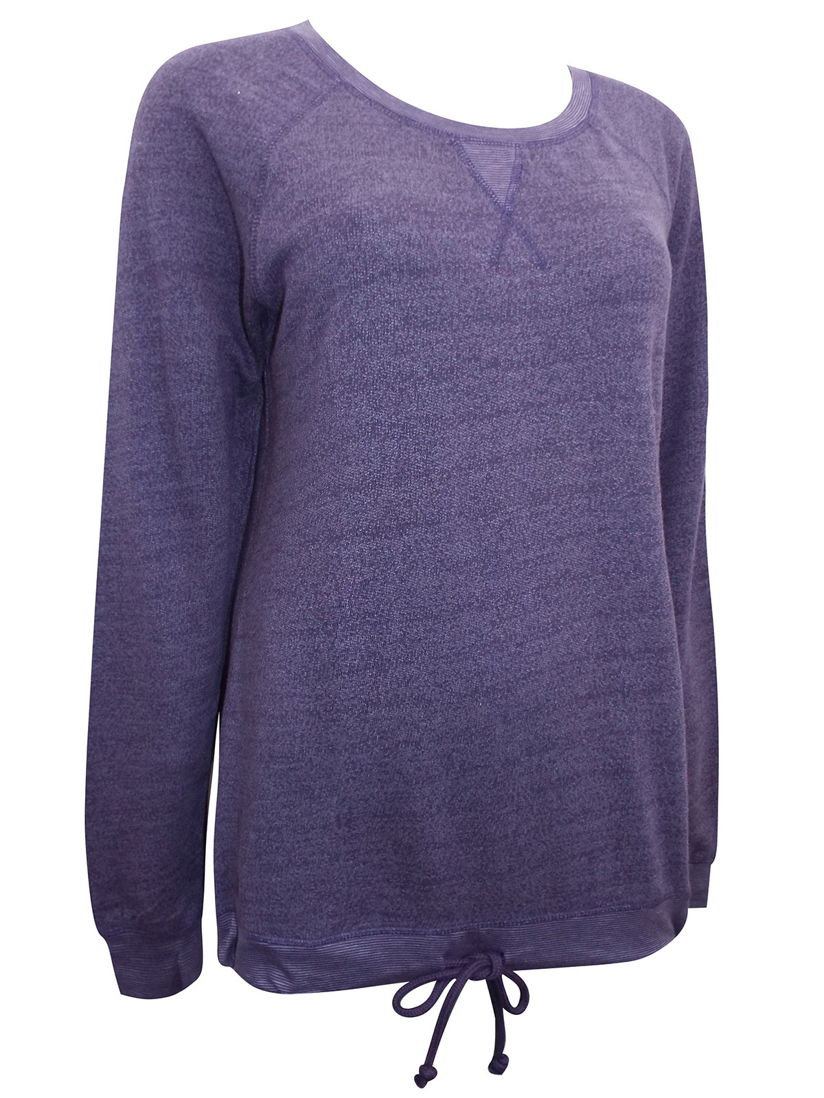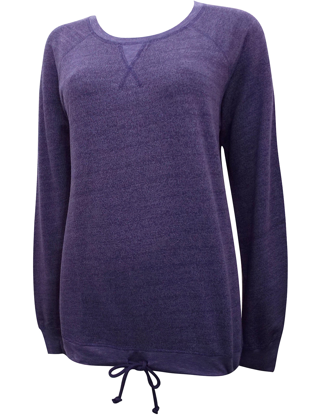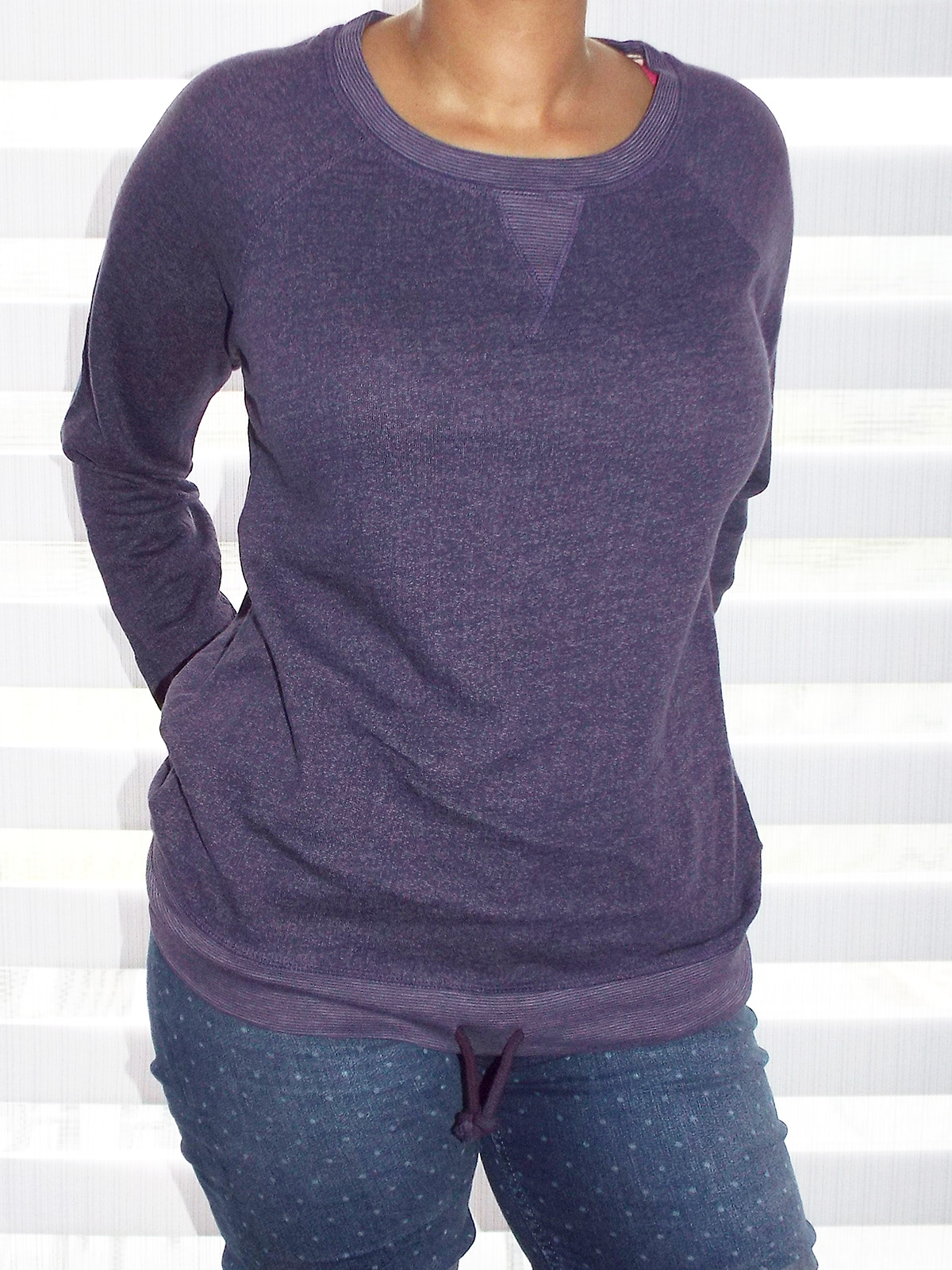 Pure soft cotton pullover sweatshirt, featuring long raglan sleeves with banded cuffs, banded hem with tie-hem detail and ribbed crewneck with V-stitch detail.. French terry knit fabric. Fine stripe material at neckline, cuff and hem.