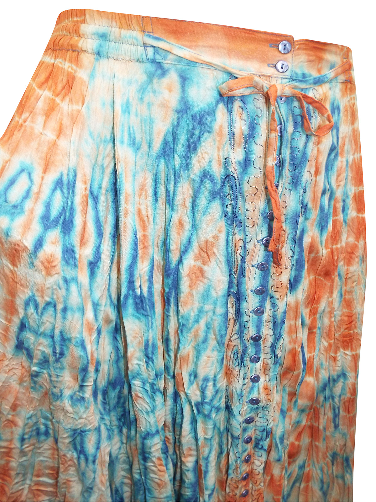 This skirt radiates summery boho charm and impresses with its stylish tie dye design. Its textured material and wide elasticated waistband makes it beautifully comfortable to wear. Featuring button fastening and functional ties to the front. Length 35in.